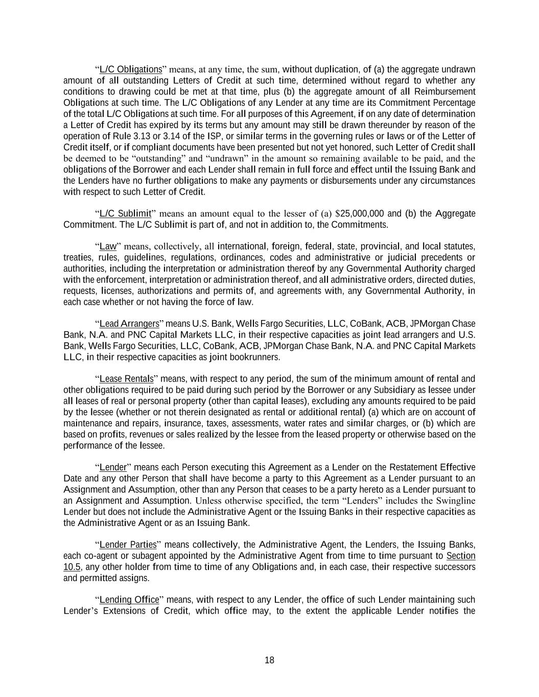18 “L/C Obligations” means, at any time, the sum, without duplication, of (a) the aggregate undrawn amount of all outstanding Letters of Credit at such time, determined without regard to whether any conditions to drawing could be met at that time, plus (b) the aggregate amount of all Reimbursement Obligations at such time. The L/C Obligations of any Lender at any time are its Commitment Percentage of the total L/C Obligations at such time. For all purposes of this Agreement, if on any date of determination a Letter of Credit has expired by its terms but any amount may still be drawn thereunder by reason of the operation of Rule 3.13 or 3.14 of the ISP, or similar terms in the governing rules or laws or of the Letter of Credit itself, or if compliant documents have been presented but not yet honored, such Letter of Credit shall be deemed to be “outstanding” and “undrawn” in the amount so remaining available to be paid, and the obligations of the Borrower and each Lender shall remain in full force and effect until the Issuing Bank and the Lenders have no further obligations to make any payments or disbursements under any circumstances with respect to such Letter of Credit. “L/C Sublimit” means an amount equal to the lesser of (a) $25,000,000 and (b) the Aggregate Commitment. The L/C Sublimit is part of, and not in addition to, the Commitments. “Law” means, collectively, all international, foreign, federal, state, provincial, and local statutes, treaties, rules, guidelines, regulations, ordinances, codes and administrative or judicial precedents or authorities, including the interpretation or administration thereof by any Governmental Authority charged with the enforcement, interpretation or administration thereof, and all administrative orders, directed duties, requests, licenses, authorizations and permits of, and agreements with, any Governmental Authority, in each case whether or not having the force of law. “Lead Arrangers” means U.S. Bank, Wells Fargo Securities, LLC, CoBank, ACB, JPMorgan Chase Bank, N.A. and PNC Capital Markets LLC, in their respective capacities as joint lead arrangers and U.S. Bank, Wells Fargo Securities, LLC, CoBank, ACB, JPMorgan Chase Bank, N.A. and PNC Capital Markets LLC, in their respective capacities as joint bookrunners. “Lease Rentals” means, with respect to any period, the sum of the minimum amount of rental and other obligations required to be paid during such period by the Borrower or any Subsidiary as lessee under all leases of real or personal property (other than capital leases), excluding any amounts required to be paid by the lessee (whether or not therein designated as rental or additional rental) (a) which are on account of maintenance and repairs, insurance, taxes, assessments, water rates and similar charges, or (b) which are based on profits, revenues or sales realized by the lessee from the leased property or otherwise based on the performance of the lessee. “Lender” means each Person executing this Agreement as a Lender on the Restatement Effective Date and any other Person that shall have become a party to this Agreement as a Lender pursuant to an Assignment and Assumption, other than any Person that ceases to be a party hereto as a Lender pursuant to an Assignment and Assumption. Unless otherwise specified, the term “Lenders” includes the Swingline Lender but does not include the Administrative Agent or the Issuing Banks in their respective capacities as the Administrative Agent or as an Issuing Bank. “Lender Parties” means collectively, the Administrative Agent, the Lenders, the Issuing Banks, each co-agent or subagent appointed by the Administrative Agent from time to time pursuant to Section 10.5, any other holder from time to time of any Obligations and, in each case, their respective successors and permitted assigns. “Lending Office” means, with respect to any Lender, the office of such Lender maintaining such Lender’s Extensions of Credit, which office may, to the extent the applicable Lender notifies the