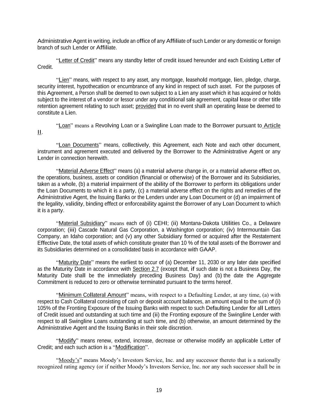 19 Administrative Agent in writing, include an office of any Affiliate of such Lender or any domestic or foreign branch of such Lender or Affiliate. “Letter of Credit” means any standby letter of credit issued hereunder and each Existing Letter of Credit. “Lien” means, with respect to any asset, any mortgage, leasehold mortgage, lien, pledge, charge, security interest, hypothecation or encumbrance of any kind in respect of such asset. For the purposes of this Agreement, a Person shall be deemed to own subject to a Lien any asset which it has acquired or holds subject to the interest of a vendor or lessor under any conditional sale agreement, capital lease or other title retention agreement relating to such asset; provided that in no event shall an operating lease be deemed to constitute a Lien. “Loan” means a Revolving Loan or a Swingline Loan made to the Borrower pursuant to Article II. “Loan Documents” means, collectively, this Agreement, each Note and each other document, instrument and agreement executed and delivered by the Borrower to the Administrative Agent or any Lender in connection herewith. “Material Adverse Effect” means (a) a material adverse change in, or a material adverse effect on, the operations, business, assets or condition (financial or otherwise) of the Borrower and its Subsidiaries, taken as a whole, (b) a material impairment of the ability of the Borrower to perform its obligations under the Loan Documents to which it is a party, (c) a material adverse effect on the rights and remedies of the Administrative Agent, the Issuing Banks or the Lenders under any Loan Document or (d) an impairment of the legality, validity, binding effect or enforceability against the Borrower of any Loan Document to which it is a party. “Material Subsidiary” means each of (i) CEHI; (ii) Montana-Dakota Utilities Co., a Delaware corporation; (iii) Cascade Natural Gas Corporation, a Washington corporation; (iv) Intermountain Gas Company, an Idaho corporation; and (v) any other Subsidiary formed or acquired after the Restatement Effective Date, the total assets of which constitute greater than 10 % of the total assets of the Borrower and its Subsidiaries determined on a consolidated basis in accordance with GAAP. “Maturity Date” means the earliest to occur of (a) December 11, 2030 or any later date specified as the Maturity Date in accordance with Section 2.7 (except that, if such date is not a Business Day, the Maturity Date shall be the immediately preceding Business Day) and (b) the date the Aggregate Commitment is reduced to zero or otherwise terminated pursuant to the terms hereof. “Minimum Collateral Amount” means, with respect to a Defaulting Lender, at any time, (a) with respect to Cash Collateral consisting of cash or deposit account balances, an amount equal to the sum of (i) 105% of the Fronting Exposure of the Issuing Banks with respect to such Defaulting Lender for all Letters of Credit issued and outstanding at such time and (ii) the Fronting exposure of the Swingline Lender with respect to all Swingline Loans outstanding at such time, and (b) otherwise, an amount determined by the Administrative Agent and the Issuing Banks in their sole discretion. “Modify” means renew, extend, increase, decrease or otherwise modify an applicable Letter of Credit; and each such action is a “Modification”. “Moody’s” means Moody’s Investors Service, Inc. and any successor thereto that is a nationally recognized rating agency (or if neither Moody’s Investors Service, Inc. nor any such successor shall be in