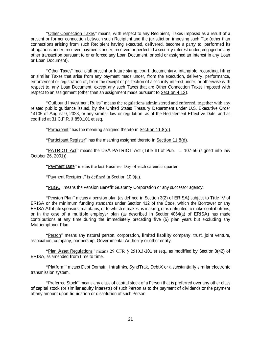 21 “Other Connection Taxes” means, with respect to any Recipient, Taxes imposed as a result of a present or former connection between such Recipient and the jurisdiction imposing such Tax (other than connections arising from such Recipient having executed, delivered, become a party to, performed its obligations under, received payments under, received or perfected a security interest under, engaged in any other transaction pursuant to or enforced any Loan Document, or sold or assigned an interest in any Loan or Loan Document). “Other Taxes” means all present or future stamp, court, documentary, intangible, recording, filing or similar Taxes that arise from any payment made under, from the execution, delivery, performance, enforcement or registration of, from the receipt or perfection of a security interest under, or otherwise with respect to, any Loan Document, except any such Taxes that are Other Connection Taxes imposed with respect to an assignment (other than an assignment made pursuant to Section 4.12). “Outbound Investment Rules” means the regulations administered and enforced, together with any related public guidance issued, by the United States Treasury Department under U.S. Executive Order 14105 of August 9, 2023, or any similar law or regulation, as of the Restatement Effective Date, and as codified at 31 C.F.R. § 850.101 et seq. “Participant” has the meaning assigned thereto in Section 11.8(d). “Participant Register” has the meaning assigned thereto in Section 11.8(d). “PATRIOT Act” means the USA PATRIOT Act (Title III of Pub. L. 107-56 (signed into law October 26, 2001)). “Payment Date” means the last Business Day of each calendar quarter. “Payment Recipient” is defined in Section 10.9(a). “PBGC” means the Pension Benefit Guaranty Corporation or any successor agency. “Pension Plan” means a pension plan (as defined in Section 3(2) of ERISA) subject to Title IV of ERISA or the minimum funding standards under Section 412 of the Code, which the Borrower or any ERISA Affiliate sponsors, maintains, or to which it makes, is making, or is obligated to make contributions, or in the case of a multiple employer plan (as described in Section 4064(a) of ERISA) has made contributions at any time during the immediately preceding five (5) plan years but excluding any Multiemployer Plan. “Person” means any natural person, corporation, limited liability company, trust, joint venture, association, company, partnership, Governmental Authority or other entity. “Plan Asset Regulations” means 29 CFR § 2510.3-101 et seq., as modified by Section 3(42) of ERISA, as amended from time to time. “Platform” means Debt Domain, Intralinks, SyndTrak, DebtX or a substantially similar electronic transmission system. “Preferred Stock” means any class of capital stock of a Person that is preferred over any other class of capital stock (or similar equity interests) of such Person as to the payment of dividends or the payment of any amount upon liquidation or dissolution of such Person.