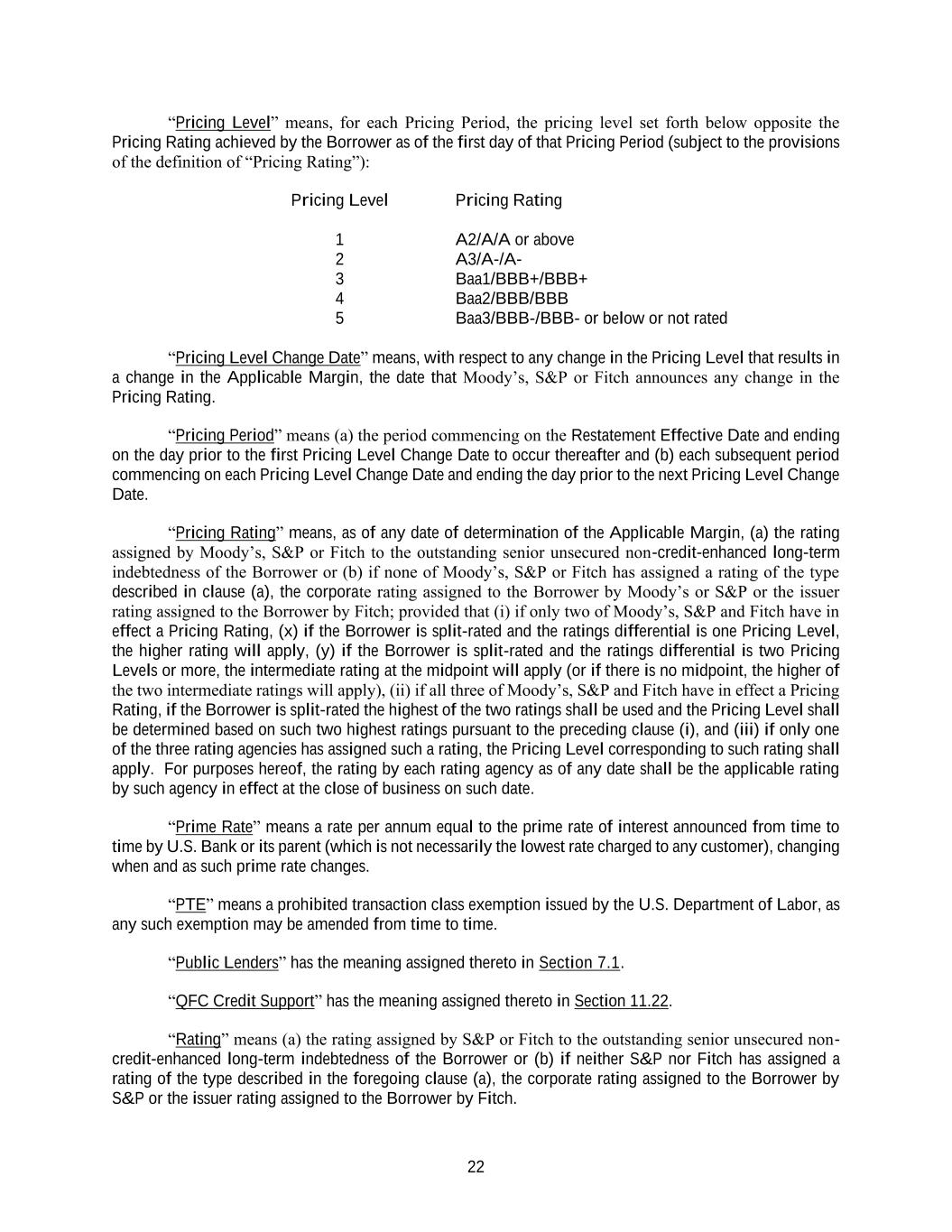 22 “Pricing Level” means, for each Pricing Period, the pricing level set forth below opposite the Pricing Rating achieved by the Borrower as of the first day of that Pricing Period (subject to the provisions of the definition of “Pricing Rating”): Pricing Level Pricing Rating 1 A2/A/A or above 2 A3/A-/A- 3 Baa1/BBB+/BBB+ 4 Baa2/BBB/BBB 5 Baa3/BBB-/BBB- or below or not rated “Pricing Level Change Date” means, with respect to any change in the Pricing Level that results in a change in the Applicable Margin, the date that Moody’s, S&P or Fitch announces any change in the Pricing Rating. “Pricing Period” means (a) the period commencing on the Restatement Effective Date and ending on the day prior to the first Pricing Level Change Date to occur thereafter and (b) each subsequent period commencing on each Pricing Level Change Date and ending the day prior to the next Pricing Level Change Date. “Pricing Rating” means, as of any date of determination of the Applicable Margin, (a) the rating assigned by Moody’s, S&P or Fitch to the outstanding senior unsecured non-credit-enhanced long-term indebtedness of the Borrower or (b) if none of Moody’s, S&P or Fitch has assigned a rating of the type described in clause (a), the corporate rating assigned to the Borrower by Moody’s or S&P or the issuer rating assigned to the Borrower by Fitch; provided that (i) if only two of Moody’s, S&P and Fitch have in effect a Pricing Rating, (x) if the Borrower is split-rated and the ratings differential is one Pricing Level, the higher rating will apply, (y) if the Borrower is split-rated and the ratings differential is two Pricing Levels or more, the intermediate rating at the midpoint will apply (or if there is no midpoint, the higher of the two intermediate ratings will apply), (ii) if all three of Moody’s, S&P and Fitch have in effect a Pricing Rating, if the Borrower is split-rated the highest of the two ratings shall be used and the Pricing Level shall be determined based on such two highest ratings pursuant to the preceding clause (i), and (iii) if only one of the three rating agencies has assigned such a rating, the Pricing Level corresponding to such rating shall apply. For purposes hereof, the rating by each rating agency as of any date shall be the applicable rating by such agency in effect at the close of business on such date. “Prime Rate” means a rate per annum equal to the prime rate of interest announced from time to time by U.S. Bank or its parent (which is not necessarily the lowest rate charged to any customer), changing when and as such prime rate changes. “PTE” means a prohibited transaction class exemption issued by the U.S. Department of Labor, as any such exemption may be amended from time to time. “Public Lenders” has the meaning assigned thereto in Section 7.1. “QFC Credit Support” has the meaning assigned thereto in Section 11.22. “Rating” means (a) the rating assigned by S&P or Fitch to the outstanding senior unsecured non- credit-enhanced long-term indebtedness of the Borrower or (b) if neither S&P nor Fitch has assigned a rating of the type described in the foregoing clause (a), the corporate rating assigned to the Borrower by S&P or the issuer rating assigned to the Borrower by Fitch.