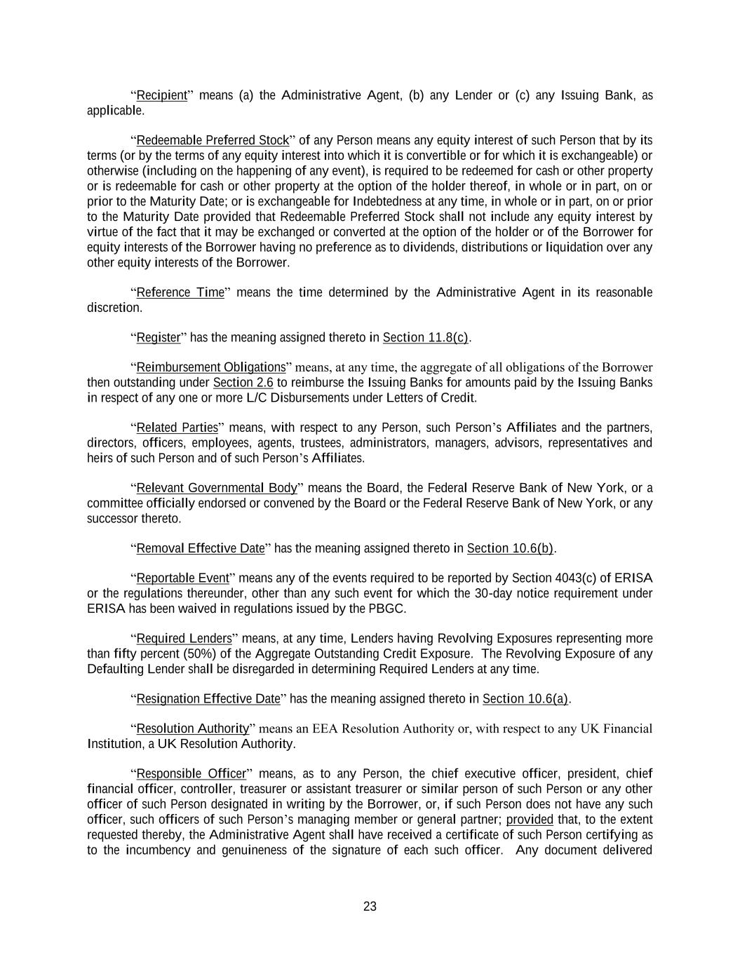 23 “Recipient” means (a) the Administrative Agent, (b) any Lender or (c) any Issuing Bank, as applicable. “Redeemable Preferred Stock” of any Person means any equity interest of such Person that by its terms (or by the terms of any equity interest into which it is convertible or for which it is exchangeable) or otherwise (including on the happening of any event), is required to be redeemed for cash or other property or is redeemable for cash or other property at the option of the holder thereof, in whole or in part, on or prior to the Maturity Date; or is exchangeable for Indebtedness at any time, in whole or in part, on or prior to the Maturity Date provided that Redeemable Preferred Stock shall not include any equity interest by virtue of the fact that it may be exchanged or converted at the option of the holder or of the Borrower for equity interests of the Borrower having no preference as to dividends, distributions or liquidation over any other equity interests of the Borrower. “Reference Time” means the time determined by the Administrative Agent in its reasonable discretion. “Register” has the meaning assigned thereto in Section 11.8(c). “Reimbursement Obligations” means, at any time, the aggregate of all obligations of the Borrower then outstanding under Section 2.6 to reimburse the Issuing Banks for amounts paid by the Issuing Banks in respect of any one or more L/C Disbursements under Letters of Credit. “Related Parties” means, with respect to any Person, such Person’s Affiliates and the partners, directors, officers, employees, agents, trustees, administrators, managers, advisors, representatives and heirs of such Person and of such Person’s Affiliates. “Relevant Governmental Body” means the Board, the Federal Reserve Bank of New York, or a committee officially endorsed or convened by the Board or the Federal Reserve Bank of New York, or any successor thereto. “Removal Effective Date” has the meaning assigned thereto in Section 10.6(b). “Reportable Event” means any of the events required to be reported by Section 4043(c) of ERISA or the regulations thereunder, other than any such event for which the 30-day notice requirement under ERISA has been waived in regulations issued by the PBGC. “Required Lenders” means, at any time, Lenders having Revolving Exposures representing more than fifty percent (50%) of the Aggregate Outstanding Credit Exposure. The Revolving Exposure of any Defaulting Lender shall be disregarded in determining Required Lenders at any time. “Resignation Effective Date” has the meaning assigned thereto in Section 10.6(a). “Resolution Authority” means an EEA Resolution Authority or, with respect to any UK Financial Institution, a UK Resolution Authority. “Responsible Officer” means, as to any Person, the chief executive officer, president, chief financial officer, controller, treasurer or assistant treasurer or similar person of such Person or any other officer of such Person designated in writing by the Borrower, or, if such Person does not have any such officer, such officers of such Person’s managing member or general partner; provided that, to the extent requested thereby, the Administrative Agent shall have received a certificate of such Person certifying as to the incumbency and genuineness of the signature of each such officer. Any document delivered