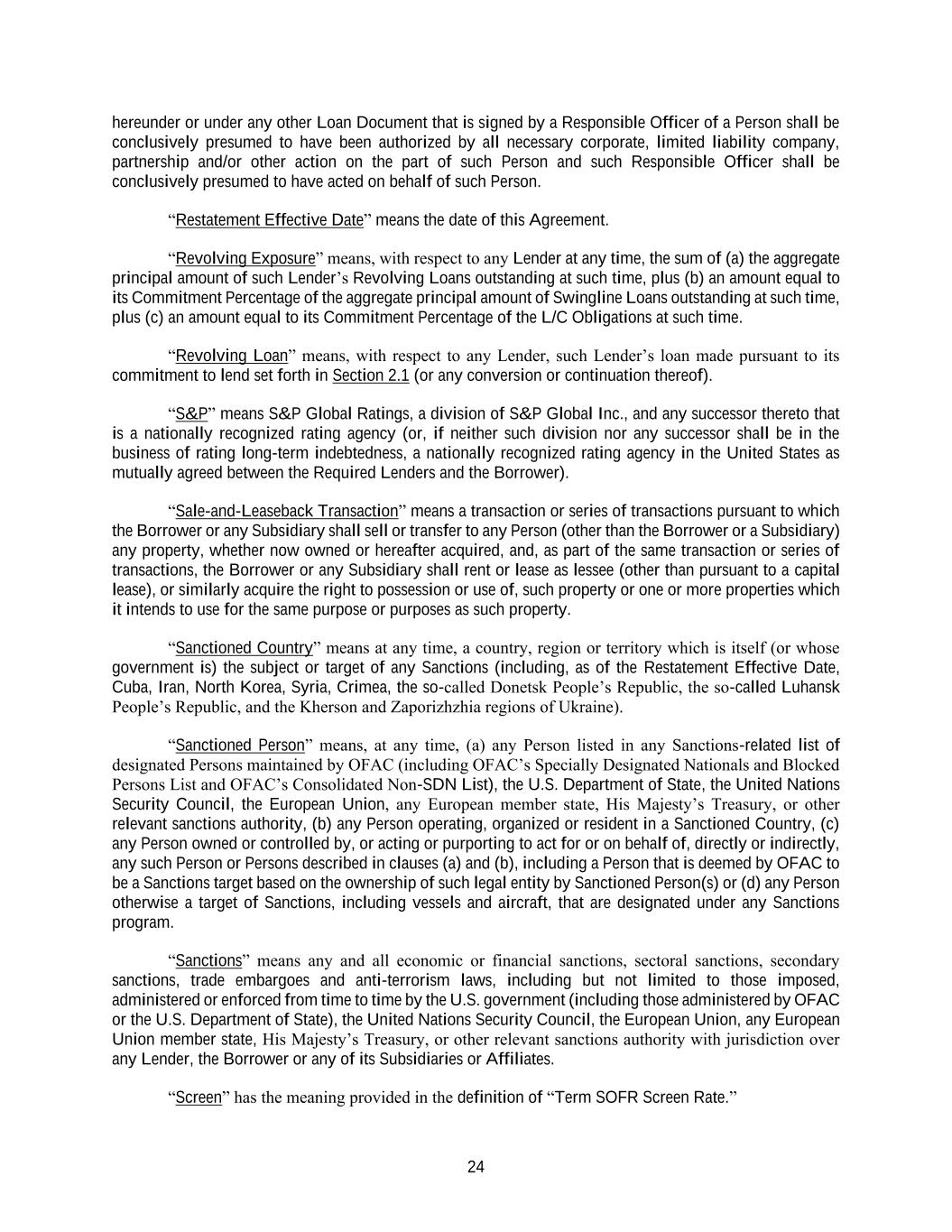 24 hereunder or under any other Loan Document that is signed by a Responsible Officer of a Person shall be conclusively presumed to have been authorized by all necessary corporate, limited liability company, partnership and/or other action on the part of such Person and such Responsible Officer shall be conclusively presumed to have acted on behalf of such Person. “Restatement Effective Date” means the date of this Agreement. “Revolving Exposure” means, with respect to any Lender at any time, the sum of (a) the aggregate principal amount of such Lender’s Revolving Loans outstanding at such time, plus (b) an amount equal to its Commitment Percentage of the aggregate principal amount of Swingline Loans outstanding at such time, plus (c) an amount equal to its Commitment Percentage of the L/C Obligations at such time. “Revolving Loan” means, with respect to any Lender, such Lender’s loan made pursuant to its commitment to lend set forth in Section 2.1 (or any conversion or continuation thereof). “S&P” means S&P Global Ratings, a division of S&P Global Inc., and any successor thereto that is a nationally recognized rating agency (or, if neither such division nor any successor shall be in the business of rating long-term indebtedness, a nationally recognized rating agency in the United States as mutually agreed between the Required Lenders and the Borrower). “Sale-and-Leaseback Transaction” means a transaction or series of transactions pursuant to which the Borrower or any Subsidiary shall sell or transfer to any Person (other than the Borrower or a Subsidiary) any property, whether now owned or hereafter acquired, and, as part of the same transaction or series of transactions, the Borrower or any Subsidiary shall rent or lease as lessee (other than pursuant to a capital lease), or similarly acquire the right to possession or use of, such property or one or more properties which it intends to use for the same purpose or purposes as such property. “Sanctioned Country” means at any time, a country, region or territory which is itself (or whose government is) the subject or target of any Sanctions (including, as of the Restatement Effective Date, Cuba, Iran, North Korea, Syria, Crimea, the so-called Donetsk People’s Republic, the so-called Luhansk People’s Republic, and the Kherson and Zaporizhzhia regions of Ukraine). “Sanctioned Person” means, at any time, (a) any Person listed in any Sanctions-related list of designated Persons maintained by OFAC (including OFAC’s Specially Designated Nationals and Blocked Persons List and OFAC’s Consolidated Non-SDN List), the U.S. Department of State, the United Nations Security Council, the European Union, any European member state, His Majesty’s Treasury, or other relevant sanctions authority, (b) any Person operating, organized or resident in a Sanctioned Country, (c) any Person owned or controlled by, or acting or purporting to act for or on behalf of, directly or indirectly, any such Person or Persons described in clauses (a) and (b), including a Person that is deemed by OFAC to be a Sanctions target based on the ownership of such legal entity by Sanctioned Person(s) or (d) any Person otherwise a target of Sanctions, including vessels and aircraft, that are designated under any Sanctions program. “Sanctions” means any and all economic or financial sanctions, sectoral sanctions, secondary sanctions, trade embargoes and anti-terrorism laws, including but not limited to those imposed, administered or enforced from time to time by the U.S. government (including those administered by OFAC or the U.S. Department of State), the United Nations Security Council, the European Union, any European Union member state, His Majesty’s Treasury, or other relevant sanctions authority with jurisdiction over any Lender, the Borrower or any of its Subsidiaries or Affiliates. “Screen” has the meaning provided in the definition of “Term SOFR Screen Rate.”