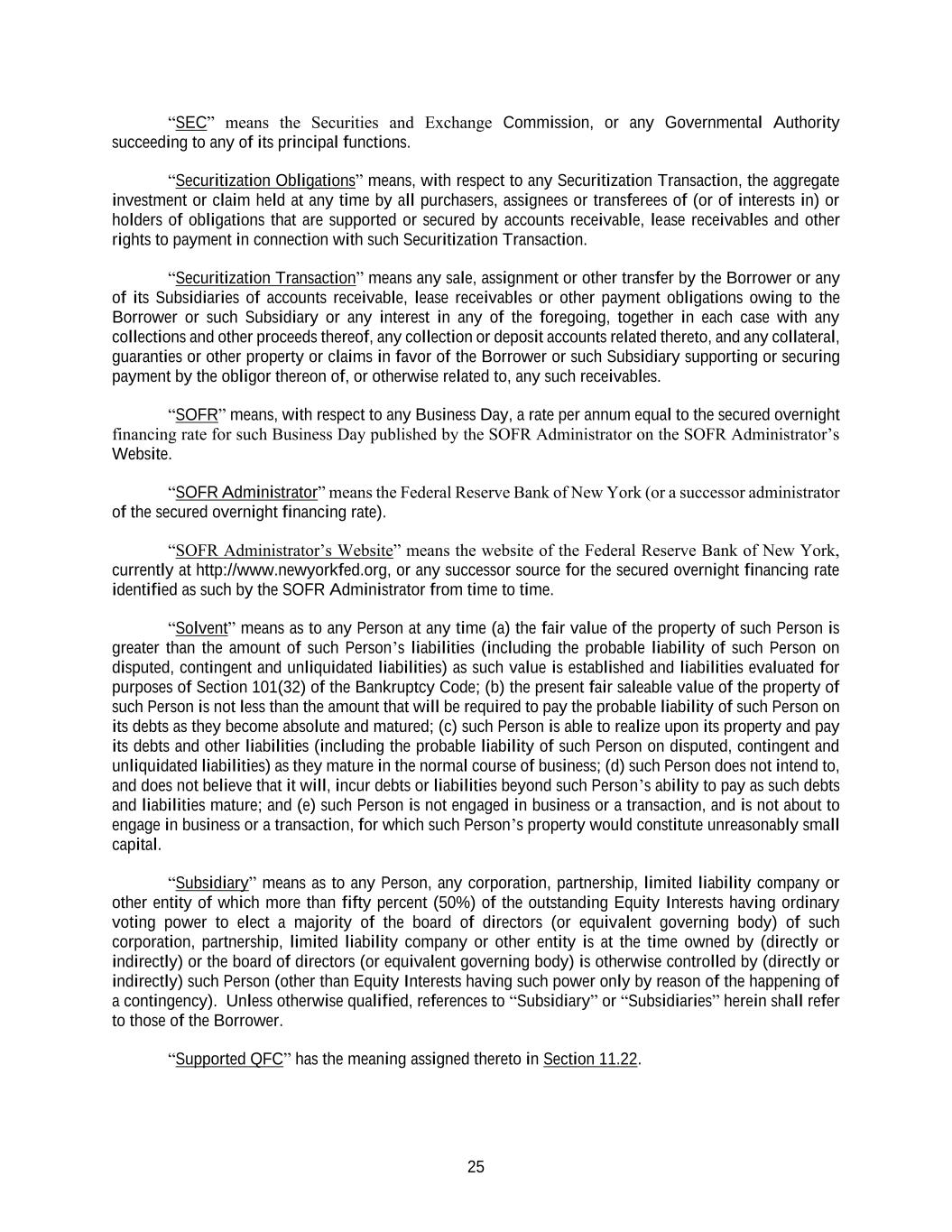 25 “SEC” means the Securities and Exchange Commission, or any Governmental Authority succeeding to any of its principal functions. “Securitization Obligations” means, with respect to any Securitization Transaction, the aggregate investment or claim held at any time by all purchasers, assignees or transferees of (or of interests in) or holders of obligations that are supported or secured by accounts receivable, lease receivables and other rights to payment in connection with such Securitization Transaction. “Securitization Transaction” means any sale, assignment or other transfer by the Borrower or any of its Subsidiaries of accounts receivable, lease receivables or other payment obligations owing to the Borrower or such Subsidiary or any interest in any of the foregoing, together in each case with any collections and other proceeds thereof, any collection or deposit accounts related thereto, and any collateral, guaranties or other property or claims in favor of the Borrower or such Subsidiary supporting or securing payment by the obligor thereon of, or otherwise related to, any such receivables. “SOFR” means, with respect to any Business Day, a rate per annum equal to the secured overnight financing rate for such Business Day published by the SOFR Administrator on the SOFR Administrator’s Website. “SOFR Administrator” means the Federal Reserve Bank of New York (or a successor administrator of the secured overnight financing rate). “SOFR Administrator’s Website” means the website of the Federal Reserve Bank of New York, currently at http://www.newyorkfed.org, or any successor source for the secured overnight financing rate identified as such by the SOFR Administrator from time to time. “Solvent” means as to any Person at any time (a) the fair value of the property of such Person is greater than the amount of such Person’s liabilities (including the probable liability of such Person on disputed, contingent and unliquidated liabilities) as such value is established and liabilities evaluated for purposes of Section 101(32) of the Bankruptcy Code; (b) the present fair saleable value of the property of such Person is not less than the amount that will be required to pay the probable liability of such Person on its debts as they become absolute and matured; (c) such Person is able to realize upon its property and pay its debts and other liabilities (including the probable liability of such Person on disputed, contingent and unliquidated liabilities) as they mature in the normal course of business; (d) such Person does not intend to, and does not believe that it will, incur debts or liabilities beyond such Person’s ability to pay as such debts and liabilities mature; and (e) such Person is not engaged in business or a transaction, and is not about to engage in business or a transaction, for which such Person’s property would constitute unreasonably small capital. “Subsidiary” means as to any Person, any corporation, partnership, limited liability company or other entity of which more than fifty percent (50%) of the outstanding Equity Interests having ordinary voting power to elect a majority of the board of directors (or equivalent governing body) of such corporation, partnership, limited liability company or other entity is at the time owned by (directly or indirectly) or the board of directors (or equivalent governing body) is otherwise controlled by (directly or indirectly) such Person (other than Equity Interests having such power only by reason of the happening of a contingency). Unless otherwise qualified, references to “Subsidiary” or “Subsidiaries” herein shall refer to those of the Borrower. “Supported QFC” has the meaning assigned thereto in Section 11.22.