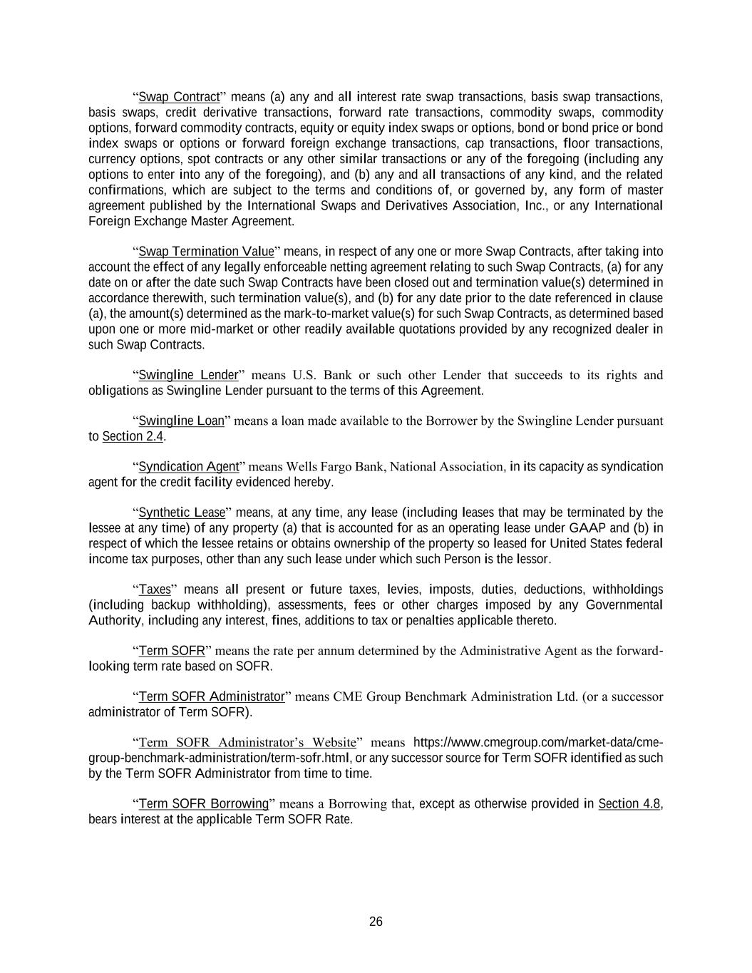 26 “Swap Contract” means (a) any and all interest rate swap transactions, basis swap transactions, basis swaps, credit derivative transactions, forward rate transactions, commodity swaps, commodity options, forward commodity contracts, equity or equity index swaps or options, bond or bond price or bond index swaps or options or forward foreign exchange transactions, cap transactions, floor transactions, currency options, spot contracts or any other similar transactions or any of the foregoing (including any options to enter into any of the foregoing), and (b) any and all transactions of any kind, and the related confirmations, which are subject to the terms and conditions of, or governed by, any form of master agreement published by the International Swaps and Derivatives Association, Inc., or any International Foreign Exchange Master Agreement. “Swap Termination Value” means, in respect of any one or more Swap Contracts, after taking into account the effect of any legally enforceable netting agreement relating to such Swap Contracts, (a) for any date on or after the date such Swap Contracts have been closed out and termination value(s) determined in accordance therewith, such termination value(s), and (b) for any date prior to the date referenced in clause (a), the amount(s) determined as the mark-to-market value(s) for such Swap Contracts, as determined based upon one or more mid-market or other readily available quotations provided by any recognized dealer in such Swap Contracts. “Swingline Lender” means U.S. Bank or such other Lender that succeeds to its rights and obligations as Swingline Lender pursuant to the terms of this Agreement. “Swingline Loan” means a loan made available to the Borrower by the Swingline Lender pursuant to Section 2.4. “Syndication Agent” means Wells Fargo Bank, National Association, in its capacity as syndication agent for the credit facility evidenced hereby. “Synthetic Lease” means, at any time, any lease (including leases that may be terminated by the lessee at any time) of any property (a) that is accounted for as an operating lease under GAAP and (b) in respect of which the lessee retains or obtains ownership of the property so leased for United States federal income tax purposes, other than any such lease under which such Person is the lessor. “Taxes” means all present or future taxes, levies, imposts, duties, deductions, withholdings (including backup withholding), assessments, fees or other charges imposed by any Governmental Authority, including any interest, fines, additions to tax or penalties applicable thereto. “Term SOFR” means the rate per annum determined by the Administrative Agent as the forward- looking term rate based on SOFR. “Term SOFR Administrator” means CME Group Benchmark Administration Ltd. (or a successor administrator of Term SOFR). “Term SOFR Administrator’s Website” means https://www.cmegroup.com/market-data/cme- group-benchmark-administration/term-sofr.html, or any successor source for Term SOFR identified as such by the Term SOFR Administrator from time to time. “Term SOFR Borrowing” means a Borrowing that, except as otherwise provided in Section 4.8, bears interest at the applicable Term SOFR Rate.