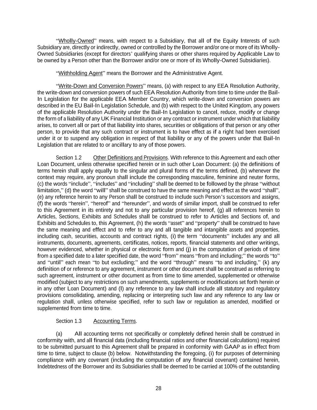28 “Wholly-Owned” means, with respect to a Subsidiary, that all of the Equity Interests of such Subsidiary are, directly or indirectly, owned or controlled by the Borrower and/or one or more of its Wholly- Owned Subsidiaries (except for directors’ qualifying shares or other shares required by Applicable Law to be owned by a Person other than the Borrower and/or one or more of its Wholly-Owned Subsidiaries). “Withholding Agent” means the Borrower and the Administrative Agent. “Write-Down and Conversion Powers” means, (a) with respect to any EEA Resolution Authority, the write-down and conversion powers of such EEA Resolution Authority from time to time under the Bail- In Legislation for the applicable EEA Member Country, which write-down and conversion powers are described in the EU Bail-In Legislation Schedule, and (b) with respect to the United Kingdom, any powers of the applicable Resolution Authority under the Bail-In Legislation to cancel, reduce, modify or change the form of a liability of any UK Financial Institution or any contract or instrument under which that liability arises, to convert all or part of that liability into shares, securities or obligations of that person or any other person, to provide that any such contract or instrument is to have effect as if a right had been exercised under it or to suspend any obligation in respect of that liability or any of the powers under that Bail-In Legislation that are related to or ancillary to any of those powers. Section 1.2 Other Definitions and Provisions. With reference to this Agreement and each other Loan Document, unless otherwise specified herein or in such other Loan Document: (a) the definitions of terms herein shall apply equally to the singular and plural forms of the terms defined, (b) whenever the context may require, any pronoun shall include the corresponding masculine, feminine and neuter forms, (c) the words “include”, “includes” and “including” shall be deemed to be followed by the phrase “without limitation,” (d) the word “will” shall be construed to have the same meaning and effect as the word “shall”, (e) any reference herein to any Person shall be construed to include such Person’s successors and assigns, (f) the words “herein”, “hereof” and “hereunder”, and words of similar import, shall be construed to refer to this Agreement in its entirety and not to any particular provision hereof, (g) all references herein to Articles, Sections, Exhibits and Schedules shall be construed to refer to Articles and Sections of, and Exhibits and Schedules to, this Agreement, (h) the words “asset” and “property” shall be construed to have the same meaning and effect and to refer to any and all tangible and intangible assets and properties, including cash, securities, accounts and contract rights, (i) the term “documents” includes any and all instruments, documents, agreements, certificates, notices, reports, financial statements and other writings, however evidenced, whether in physical or electronic form and (j) in the computation of periods of time from a specified date to a later specified date, the word “from” means “from and including;” the words “to” and “until” each mean “to but excluding;” and the word “through” means “to and including,” (k) any definition of or reference to any agreement, instrument or other document shall be construed as referring to such agreement, instrument or other document as from time to time amended, supplemented or otherwise modified (subject to any restrictions on such amendments, supplements or modifications set forth herein or in any other Loan Document) and (l) any reference to any law shall include all statutory and regulatory provisions consolidating, amending, replacing or interpreting such law and any reference to any law or regulation shall, unless otherwise specified, refer to such law or regulation as amended, modified or supplemented from time to time. Section 1.3 Accounting Terms. (a) All accounting terms not specifically or completely defined herein shall be construed in conformity with, and all financial data (including financial ratios and other financial calculations) required to be submitted pursuant to this Agreement shall be prepared in conformity with GAAP as in effect from time to time, subject to clause (b) below. Notwithstanding the foregoing, (i) for purposes of determining compliance with any covenant (including the computation of any financial covenant) contained herein, Indebtedness of the Borrower and its Subsidiaries shall be deemed to be carried at 100% of the outstanding