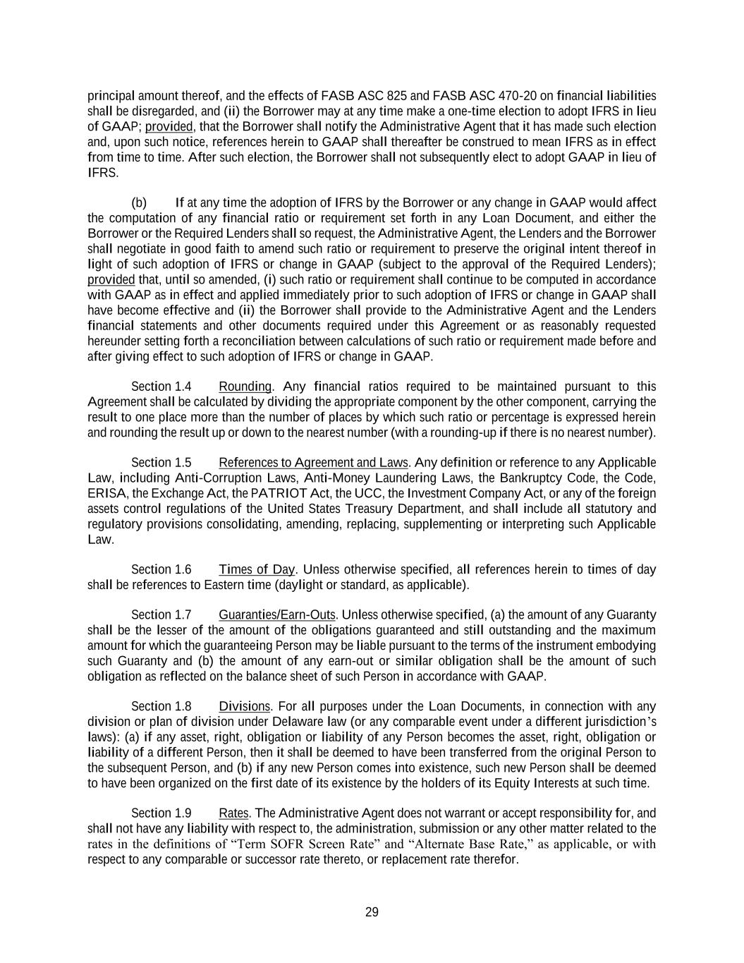 29 principal amount thereof, and the effects of FASB ASC 825 and FASB ASC 470-20 on financial liabilities shall be disregarded, and (ii) the Borrower may at any time make a one-time election to adopt IFRS in lieu of GAAP; provided, that the Borrower shall notify the Administrative Agent that it has made such election and, upon such notice, references herein to GAAP shall thereafter be construed to mean IFRS as in effect from time to time. After such election, the Borrower shall not subsequently elect to adopt GAAP in lieu of IFRS. (b) If at any time the adoption of IFRS by the Borrower or any change in GAAP would affect the computation of any financial ratio or requirement set forth in any Loan Document, and either the Borrower or the Required Lenders shall so request, the Administrative Agent, the Lenders and the Borrower shall negotiate in good faith to amend such ratio or requirement to preserve the original intent thereof in light of such adoption of IFRS or change in GAAP (subject to the approval of the Required Lenders); provided that, until so amended, (i) such ratio or requirement shall continue to be computed in accordance with GAAP as in effect and applied immediately prior to such adoption of IFRS or change in GAAP shall have become effective and (ii) the Borrower shall provide to the Administrative Agent and the Lenders financial statements and other documents required under this Agreement or as reasonably requested hereunder setting forth a reconciliation between calculations of such ratio or requirement made before and after giving effect to such adoption of IFRS or change in GAAP. Section 1.4 Rounding. Any financial ratios required to be maintained pursuant to this Agreement shall be calculated by dividing the appropriate component by the other component, carrying the result to one place more than the number of places by which such ratio or percentage is expressed herein and rounding the result up or down to the nearest number (with a rounding-up if there is no nearest number). Section 1.5 References to Agreement and Laws. Any definition or reference to any Applicable Law, including Anti-Corruption Laws, Anti-Money Laundering Laws, the Bankruptcy Code, the Code, ERISA, the Exchange Act, the PATRIOT Act, the UCC, the Investment Company Act, or any of the foreign assets control regulations of the United States Treasury Department, and shall include all statutory and regulatory provisions consolidating, amending, replacing, supplementing or interpreting such Applicable Law. Section 1.6 Times of Day. Unless otherwise specified, all references herein to times of day shall be references to Eastern time (daylight or standard, as applicable). Section 1.7 Guaranties/Earn-Outs. Unless otherwise specified, (a) the amount of any Guaranty shall be the lesser of the amount of the obligations guaranteed and still outstanding and the maximum amount for which the guaranteeing Person may be liable pursuant to the terms of the instrument embodying such Guaranty and (b) the amount of any earn-out or similar obligation shall be the amount of such obligation as reflected on the balance sheet of such Person in accordance with GAAP. Section 1.8 Divisions. For all purposes under the Loan Documents, in connection with any division or plan of division under Delaware law (or any comparable event under a different jurisdiction’s laws): (a) if any asset, right, obligation or liability of any Person becomes the asset, right, obligation or liability of a different Person, then it shall be deemed to have been transferred from the original Person to the subsequent Person, and (b) if any new Person comes into existence, such new Person shall be deemed to have been organized on the first date of its existence by the holders of its Equity Interests at such time. Section 1.9 Rates. The Administrative Agent does not warrant or accept responsibility for, and shall not have any liability with respect to, the administration, submission or any other matter related to the rates in the definitions of “Term SOFR Screen Rate” and “Alternate Base Rate,” as applicable, or with respect to any comparable or successor rate thereto, or replacement rate therefor.