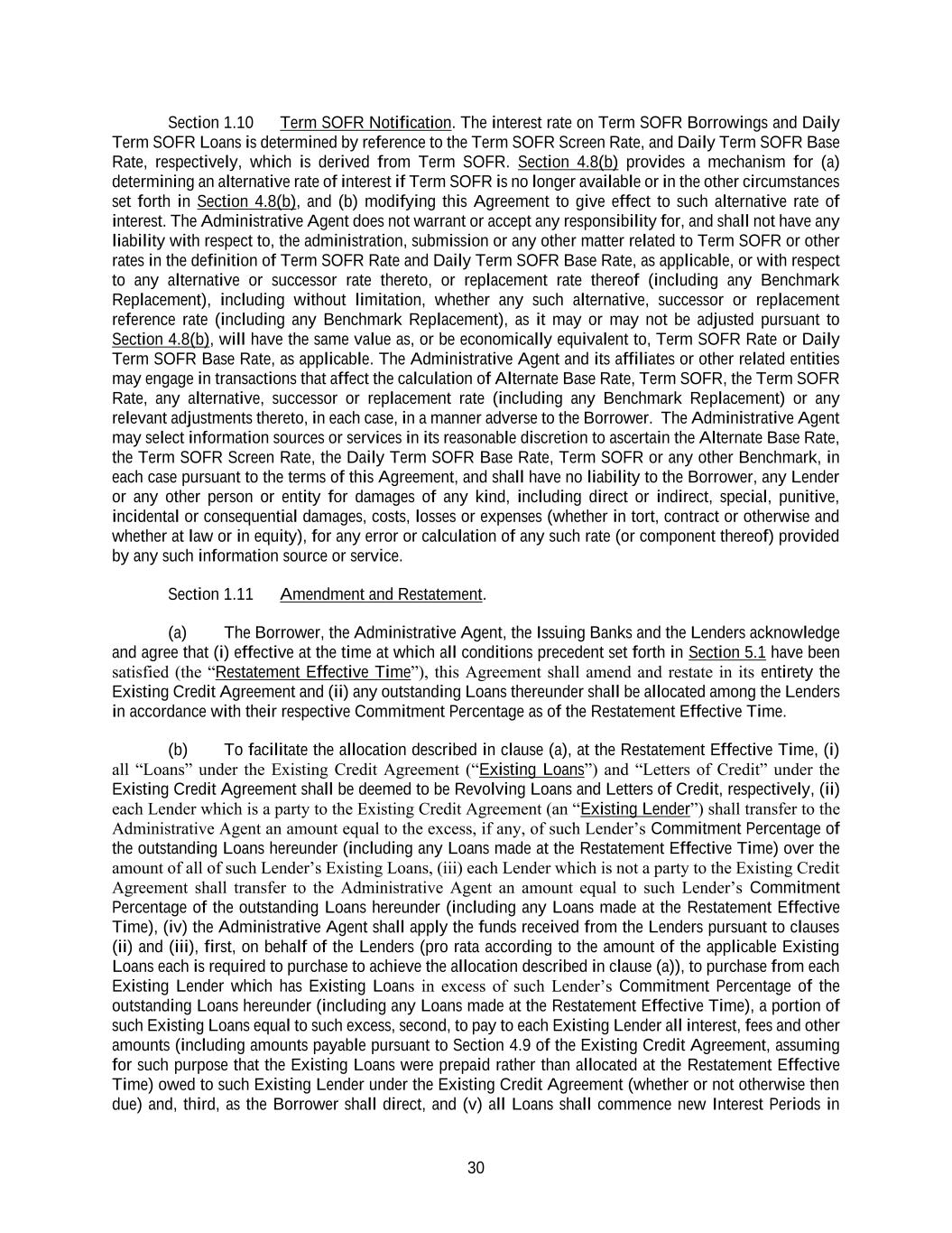 30 Section 1.10 Term SOFR Notification. The interest rate on Term SOFR Borrowings and Daily Term SOFR Loans is determined by reference to the Term SOFR Screen Rate, and Daily Term SOFR Base Rate, respectively, which is derived from Term SOFR. Section 4.8(b) provides a mechanism for (a) determining an alternative rate of interest if Term SOFR is no longer available or in the other circumstances set forth in Section 4.8(b), and (b) modifying this Agreement to give effect to such alternative rate of interest. The Administrative Agent does not warrant or accept any responsibility for, and shall not have any liability with respect to, the administration, submission or any other matter related to Term SOFR or other rates in the definition of Term SOFR Rate and Daily Term SOFR Base Rate, as applicable, or with respect to any alternative or successor rate thereto, or replacement rate thereof (including any Benchmark Replacement), including without limitation, whether any such alternative, successor or replacement reference rate (including any Benchmark Replacement), as it may or may not be adjusted pursuant to Section 4.8(b), will have the same value as, or be economically equivalent to, Term SOFR Rate or Daily Term SOFR Base Rate, as applicable. The Administrative Agent and its affiliates or other related entities may engage in transactions that affect the calculation of Alternate Base Rate, Term SOFR, the Term SOFR Rate, any alternative, successor or replacement rate (including any Benchmark Replacement) or any relevant adjustments thereto, in each case, in a manner adverse to the Borrower. The Administrative Agent may select information sources or services in its reasonable discretion to ascertain the Alternate Base Rate, the Term SOFR Screen Rate, the Daily Term SOFR Base Rate, Term SOFR or any other Benchmark, in each case pursuant to the terms of this Agreement, and shall have no liability to the Borrower, any Lender or any other person or entity for damages of any kind, including direct or indirect, special, punitive, incidental or consequential damages, costs, losses or expenses (whether in tort, contract or otherwise and whether at law or in equity), for any error or calculation of any such rate (or component thereof) provided by any such information source or service. Section 1.11 Amendment and Restatement. (a) The Borrower, the Administrative Agent, the Issuing Banks and the Lenders acknowledge and agree that (i) effective at the time at which all conditions precedent set forth in Section 5.1 have been satisfied (the “Restatement Effective Time”), this Agreement shall amend and restate in its entirety the Existing Credit Agreement and (ii) any outstanding Loans thereunder shall be allocated among the Lenders in accordance with their respective Commitment Percentage as of the Restatement Effective Time. (b) To facilitate the allocation described in clause (a), at the Restatement Effective Time, (i) all “Loans” under the Existing Credit Agreement (“Existing Loans”) and “Letters of Credit” under the Existing Credit Agreement shall be deemed to be Revolving Loans and Letters of Credit, respectively, (ii) each Lender which is a party to the Existing Credit Agreement (an “Existing Lender”) shall transfer to the Administrative Agent an amount equal to the excess, if any, of such Lender’s Commitment Percentage of the outstanding Loans hereunder (including any Loans made at the Restatement Effective Time) over the amount of all of such Lender’s Existing Loans, (iii) each Lender which is not a party to the Existing Credit Agreement shall transfer to the Administrative Agent an amount equal to such Lender’s Commitment Percentage of the outstanding Loans hereunder (including any Loans made at the Restatement Effective Time), (iv) the Administrative Agent shall apply the funds received from the Lenders pursuant to clauses (ii) and (iii), first, on behalf of the Lenders (pro rata according to the amount of the applicable Existing Loans each is required to purchase to achieve the allocation described in clause (a)), to purchase from each Existing Lender which has Existing Loans in excess of such Lender’s Commitment Percentage of the outstanding Loans hereunder (including any Loans made at the Restatement Effective Time), a portion of such Existing Loans equal to such excess, second, to pay to each Existing Lender all interest, fees and other amounts (including amounts payable pursuant to Section 4.9 of the Existing Credit Agreement, assuming for such purpose that the Existing Loans were prepaid rather than allocated at the Restatement Effective Time) owed to such Existing Lender under the Existing Credit Agreement (whether or not otherwise then due) and, third, as the Borrower shall direct, and (v) all Loans shall commence new Interest Periods in