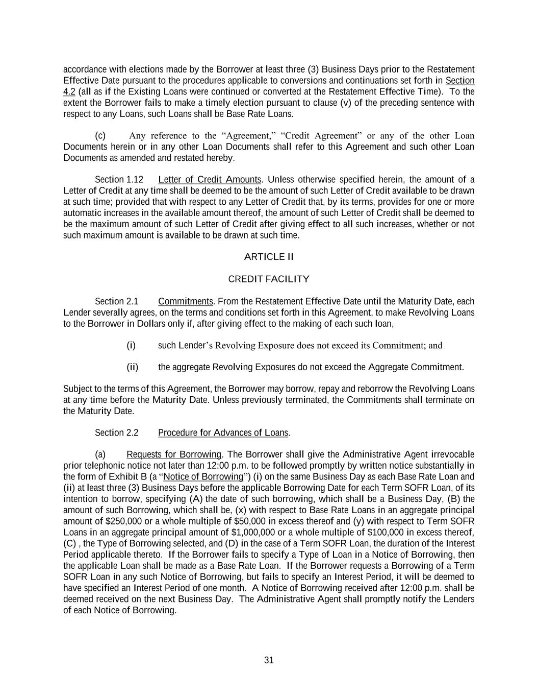 31 accordance with elections made by the Borrower at least three (3) Business Days prior to the Restatement Effective Date pursuant to the procedures applicable to conversions and continuations set forth in Section 4.2 (all as if the Existing Loans were continued or converted at the Restatement Effective Time). To the extent the Borrower fails to make a timely election pursuant to clause (v) of the preceding sentence with respect to any Loans, such Loans shall be Base Rate Loans. (c) Any reference to the “Agreement,” “Credit Agreement” or any of the other Loan Documents herein or in any other Loan Documents shall refer to this Agreement and such other Loan Documents as amended and restated hereby. Section 1.12 Letter of Credit Amounts. Unless otherwise specified herein, the amount of a Letter of Credit at any time shall be deemed to be the amount of such Letter of Credit available to be drawn at such time; provided that with respect to any Letter of Credit that, by its terms, provides for one or more automatic increases in the available amount thereof, the amount of such Letter of Credit shall be deemed to be the maximum amount of such Letter of Credit after giving effect to all such increases, whether or not such maximum amount is available to be drawn at such time. ARTICLE II CREDIT FACILITY Section 2.1 Commitments. From the Restatement Effective Date until the Maturity Date, each Lender severally agrees, on the terms and conditions set forth in this Agreement, to make Revolving Loans to the Borrower in Dollars only if, after giving effect to the making of each such loan, (i) such Lender’s Revolving Exposure does not exceed its Commitment; and (ii) the aggregate Revolving Exposures do not exceed the Aggregate Commitment. Subject to the terms of this Agreement, the Borrower may borrow, repay and reborrow the Revolving Loans at any time before the Maturity Date. Unless previously terminated, the Commitments shall terminate on the Maturity Date. Section 2.2 Procedure for Advances of Loans. (a) Requests for Borrowing. The Borrower shall give the Administrative Agent irrevocable prior telephonic notice not later than 12:00 p.m. to be followed promptly by written notice substantially in the form of Exhibit B (a “Notice of Borrowing”) (i) on the same Business Day as each Base Rate Loan and (ii) at least three (3) Business Days before the applicable Borrowing Date for each Term SOFR Loan, of its intention to borrow, specifying (A) the date of such borrowing, which shall be a Business Day, (B) the amount of such Borrowing, which shall be, (x) with respect to Base Rate Loans in an aggregate principal amount of $250,000 or a whole multiple of $50,000 in excess thereof and (y) with respect to Term SOFR Loans in an aggregate principal amount of $1,000,000 or a whole multiple of $100,000 in excess thereof, (C) , the Type of Borrowing selected, and (D) in the case of a Term SOFR Loan, the duration of the Interest Period applicable thereto. If the Borrower fails to specify a Type of Loan in a Notice of Borrowing, then the applicable Loan shall be made as a Base Rate Loan. If the Borrower requests a Borrowing of a Term SOFR Loan in any such Notice of Borrowing, but fails to specify an Interest Period, it will be deemed to have specified an Interest Period of one month. A Notice of Borrowing received after 12:00 p.m. shall be deemed received on the next Business Day. The Administrative Agent shall promptly notify the Lenders of each Notice of Borrowing.