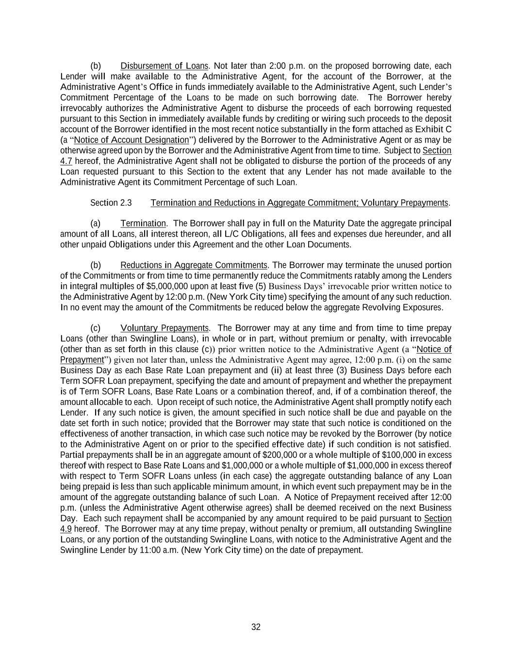 32 (b) Disbursement of Loans. Not later than 2:00 p.m. on the proposed borrowing date, each Lender will make available to the Administrative Agent, for the account of the Borrower, at the Administrative Agent’s Office in funds immediately available to the Administrative Agent, such Lender’s Commitment Percentage of the Loans to be made on such borrowing date. The Borrower hereby irrevocably authorizes the Administrative Agent to disburse the proceeds of each borrowing requested pursuant to this Section in immediately available funds by crediting or wiring such proceeds to the deposit account of the Borrower identified in the most recent notice substantially in the form attached as Exhibit C (a “Notice of Account Designation”) delivered by the Borrower to the Administrative Agent or as may be otherwise agreed upon by the Borrower and the Administrative Agent from time to time. Subject to Section 4.7 hereof, the Administrative Agent shall not be obligated to disburse the portion of the proceeds of any Loan requested pursuant to this Section to the extent that any Lender has not made available to the Administrative Agent its Commitment Percentage of such Loan. Section 2.3 Termination and Reductions in Aggregate Commitment; Voluntary Prepayments. (a) Termination. The Borrower shall pay in full on the Maturity Date the aggregate principal amount of all Loans, all interest thereon, all L/C Obligations, all fees and expenses due hereunder, and all other unpaid Obligations under this Agreement and the other Loan Documents. (b) Reductions in Aggregate Commitments. The Borrower may terminate the unused portion of the Commitments or from time to time permanently reduce the Commitments ratably among the Lenders in integral multiples of $5,000,000 upon at least five (5) Business Days’ irrevocable prior written notice to the Administrative Agent by 12:00 p.m. (New York City time) specifying the amount of any such reduction. In no event may the amount of the Commitments be reduced below the aggregate Revolving Exposures. (c) Voluntary Prepayments. The Borrower may at any time and from time to time prepay Loans (other than Swingline Loans), in whole or in part, without premium or penalty, with irrevocable (other than as set forth in this clause (c)) prior written notice to the Administrative Agent (a “Notice of Prepayment”) given not later than, unless the Administrative Agent may agree, 12:00 p.m. (i) on the same Business Day as each Base Rate Loan prepayment and (ii) at least three (3) Business Days before each Term SOFR Loan prepayment, specifying the date and amount of prepayment and whether the prepayment is of Term SOFR Loans, Base Rate Loans or a combination thereof, and, if of a combination thereof, the amount allocable to each. Upon receipt of such notice, the Administrative Agent shall promptly notify each Lender. If any such notice is given, the amount specified in such notice shall be due and payable on the date set forth in such notice; provided that the Borrower may state that such notice is conditioned on the effectiveness of another transaction, in which case such notice may be revoked by the Borrower (by notice to the Administrative Agent on or prior to the specified effective date) if such condition is not satisfied. Partial prepayments shall be in an aggregate amount of $200,000 or a whole multiple of $100,000 in excess thereof with respect to Base Rate Loans and $1,000,000 or a whole multiple of $1,000,000 in excess thereof with respect to Term SOFR Loans unless (in each case) the aggregate outstanding balance of any Loan being prepaid is less than such applicable minimum amount, in which event such prepayment may be in the amount of the aggregate outstanding balance of such Loan. A Notice of Prepayment received after 12:00 p.m. (unless the Administrative Agent otherwise agrees) shall be deemed received on the next Business Day. Each such repayment shall be accompanied by any amount required to be paid pursuant to Section 4.9 hereof. The Borrower may at any time prepay, without penalty or premium, all outstanding Swingline Loans, or any portion of the outstanding Swingline Loans, with notice to the Administrative Agent and the Swingline Lender by 11:00 a.m. (New York City time) on the date of prepayment.