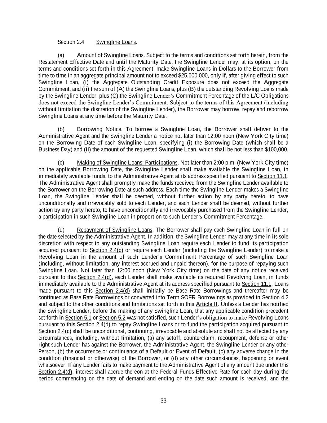 33 Section 2.4 Swingline Loans. (a) Amount of Swingline Loans. Subject to the terms and conditions set forth herein, from the Restatement Effective Date and until the Maturity Date, the Swingline Lender may, at its option, on the terms and conditions set forth in this Agreement, make Swingline Loans in Dollars to the Borrower from time to time in an aggregate principal amount not to exceed $25,000,000, only if, after giving effect to such Swingline Loan, (i) the Aggregate Outstanding Credit Exposure does not exceed the Aggregate Commitment, and (ii) the sum of (A) the Swingline Loans, plus (B) the outstanding Revolving Loans made by the Swingline Lender, plus (C) the Swingline Lender’s Commitment Percentage of the L/C Obligations does not exceed the Swingline Lender’s Commitment. Subject to the terms of this Agreement (including without limitation the discretion of the Swingline Lender), the Borrower may borrow, repay and reborrow Swingline Loans at any time before the Maturity Date. (b) Borrowing Notice. To borrow a Swingline Loan, the Borrower shall deliver to the Administrative Agent and the Swingline Lender a notice not later than 12:00 noon (New York City time) on the Borrowing Date of each Swingline Loan, specifying (i) the Borrowing Date (which shall be a Business Day) and (ii) the amount of the requested Swingline Loan, which shall be not less than $100,000. (c) Making of Swingline Loans; Participations. Not later than 2:00 p.m. (New York City time) on the applicable Borrowing Date, the Swingline Lender shall make available the Swingline Loan, in immediately available funds, to the Administrative Agent at its address specified pursuant to Section 11.1. The Administrative Agent shall promptly make the funds received from the Swingline Lender available to the Borrower on the Borrowing Date at such address. Each time the Swingline Lender makes a Swingline Loan, the Swingline Lender shall be deemed, without further action by any party hereto, to have unconditionally and irrevocably sold to each Lender, and each Lender shall be deemed, without further action by any party hereto, to have unconditionally and irrevocably purchased from the Swingline Lender, a participation in such Swingline Loan in proportion to such Lender’s Commitment Percentage. (d) Repayment of Swingline Loans. The Borrower shall pay each Swingline Loan in full on the date selected by the Administrative Agent. In addition, the Swingline Lender may at any time in its sole discretion with respect to any outstanding Swingline Loan require each Lender to fund its participation acquired pursuant to Section 2.4(c) or require each Lender (including the Swingline Lender) to make a Revolving Loan in the amount of such Lender’s Commitment Percentage of such Swingline Loan (including, without limitation, any interest accrued and unpaid thereon), for the purpose of repaying such Swingline Loan. Not later than 12:00 noon (New York City time) on the date of any notice received pursuant to this Section 2.4(d), each Lender shall make available its required Revolving Loan, in funds immediately available to the Administrative Agent at its address specified pursuant to Section 11.1. Loans made pursuant to this Section 2.4(d) shall initially be Base Rate Borrowings and thereafter may be continued as Base Rate Borrowings or converted into Term SOFR Borrowings as provided in Section 4.2 and subject to the other conditions and limitations set forth in this Article II. Unless a Lender has notified the Swingline Lender, before the making of any Swingline Loan, that any applicable condition precedent set forth in Section 5.1 or Section 5.2 was not satisfied, such Lender’s obligation to make Revolving Loans pursuant to this Section 2.4(d) to repay Swingline Loans or to fund the participation acquired pursuant to Section 2.4(c) shall be unconditional, continuing, irrevocable and absolute and shall not be affected by any circumstances, including, without limitation, (a) any setoff, counterclaim, recoupment, defense or other right such Lender has against the Borrower, the Administrative Agent, the Swingline Lender or any other Person, (b) the occurrence or continuance of a Default or Event of Default, (c) any adverse change in the condition (financial or otherwise) of the Borrower, or (d) any other circumstances, happening or event whatsoever. If any Lender fails to make payment to the Administrative Agent of any amount due under this Section 2.4(d), interest shall accrue thereon at the Federal Funds Effective Rate for each day during the period commencing on the date of demand and ending on the date such amount is received, and the