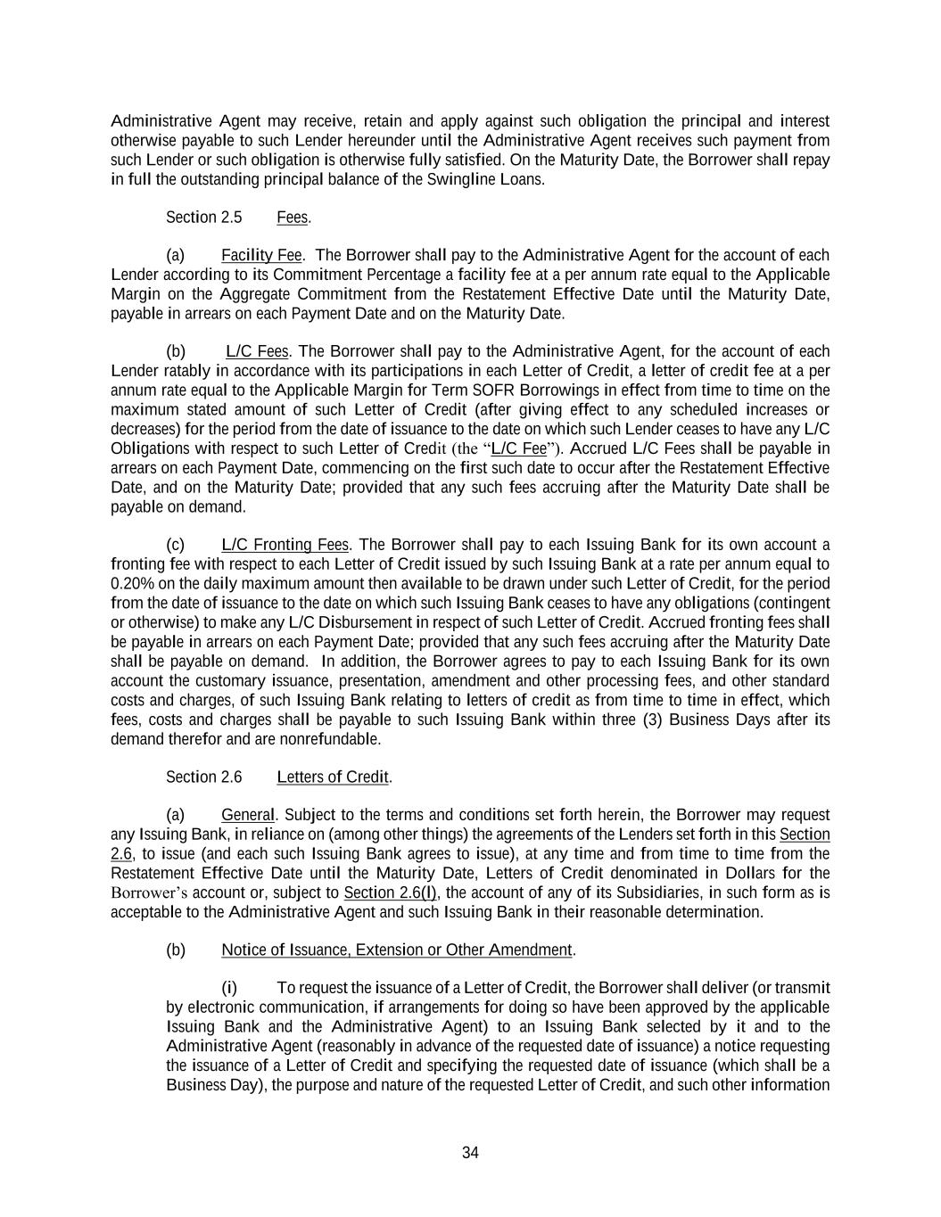 34 Administrative Agent may receive, retain and apply against such obligation the principal and interest otherwise payable to such Lender hereunder until the Administrative Agent receives such payment from such Lender or such obligation is otherwise fully satisfied. On the Maturity Date, the Borrower shall repay in full the outstanding principal balance of the Swingline Loans. Section 2.5 Fees. (a) Facility Fee. The Borrower shall pay to the Administrative Agent for the account of each Lender according to its Commitment Percentage a facility fee at a per annum rate equal to the Applicable Margin on the Aggregate Commitment from the Restatement Effective Date until the Maturity Date, payable in arrears on each Payment Date and on the Maturity Date. (b) L/C Fees. The Borrower shall pay to the Administrative Agent, for the account of each Lender ratably in accordance with its participations in each Letter of Credit, a letter of credit fee at a per annum rate equal to the Applicable Margin for Term SOFR Borrowings in effect from time to time on the maximum stated amount of such Letter of Credit (after giving effect to any scheduled increases or decreases) for the period from the date of issuance to the date on which such Lender ceases to have any L/C Obligations with respect to such Letter of Credit (the “L/C Fee”). Accrued L/C Fees shall be payable in arrears on each Payment Date, commencing on the first such date to occur after the Restatement Effective Date, and on the Maturity Date; provided that any such fees accruing after the Maturity Date shall be payable on demand. (c) L/C Fronting Fees. The Borrower shall pay to each Issuing Bank for its own account a fronting fee with respect to each Letter of Credit issued by such Issuing Bank at a rate per annum equal to 0.20% on the daily maximum amount then available to be drawn under such Letter of Credit, for the period from the date of issuance to the date on which such Issuing Bank ceases to have any obligations (contingent or otherwise) to make any L/C Disbursement in respect of such Letter of Credit. Accrued fronting fees shall be payable in arrears on each Payment Date; provided that any such fees accruing after the Maturity Date shall be payable on demand. In addition, the Borrower agrees to pay to each Issuing Bank for its own account the customary issuance, presentation, amendment and other processing fees, and other standard costs and charges, of such Issuing Bank relating to letters of credit as from time to time in effect, which fees, costs and charges shall be payable to such Issuing Bank within three (3) Business Days after its demand therefor and are nonrefundable. Section 2.6 Letters of Credit. (a) General. Subject to the terms and conditions set forth herein, the Borrower may request any Issuing Bank, in reliance on (among other things) the agreements of the Lenders set forth in this Section 2.6, to issue (and each such Issuing Bank agrees to issue), at any time and from time to time from the Restatement Effective Date until the Maturity Date, Letters of Credit denominated in Dollars for the Borrower’s account or, subject to Section 2.6(l), the account of any of its Subsidiaries, in such form as is acceptable to the Administrative Agent and such Issuing Bank in their reasonable determination. (b) Notice of Issuance, Extension or Other Amendment. (i) To request the issuance of a Letter of Credit, the Borrower shall deliver (or transmit by electronic communication, if arrangements for doing so have been approved by the applicable Issuing Bank and the Administrative Agent) to an Issuing Bank selected by it and to the Administrative Agent (reasonably in advance of the requested date of issuance) a notice requesting the issuance of a Letter of Credit and specifying the requested date of issuance (which shall be a Business Day), the purpose and nature of the requested Letter of Credit, and such other information