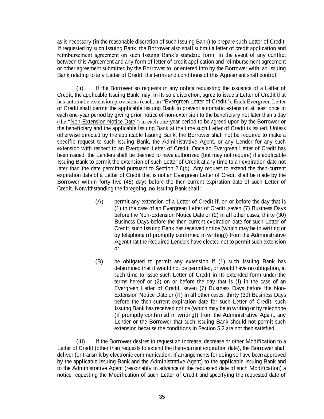 35 as is necessary (in the reasonable discretion of such Issuing Bank) to prepare such Letter of Credit. If requested by such Issuing Bank, the Borrower also shall submit a letter of credit application and reimbursement agreement on such Issuing Bank’s standard form. In the event of any conflict between this Agreement and any form of letter of credit application and reimbursement agreement or other agreement submitted by the Borrower to, or entered into by the Borrower with, an Issuing Bank relating to any Letter of Credit, the terms and conditions of this Agreement shall control. (ii) If the Borrower so requests in any notice requesting the issuance of a Letter of Credit, the applicable Issuing Bank may, in its sole discretion, agree to issue a Letter of Credit that has automatic extension provisions (each, an “Evergreen Letter of Credit”). Each Evergreen Letter of Credit shall permit the applicable Issuing Bank to prevent automatic extension at least once in each one-year period by giving prior notice of non-extension to the beneficiary not later than a day (the “Non-Extension Notice Date”) in each one-year period to be agreed upon by the Borrower or the beneficiary and the applicable Issuing Bank at the time such Letter of Credit is issued. Unless otherwise directed by the applicable Issuing Bank, the Borrower shall not be required to make a specific request to such Issuing Bank, the Administrative Agent, or any Lender for any such extension with respect to an Evergreen Letter of Credit. Once an Evergreen Letter of Credit has been issued, the Lenders shall be deemed to have authorized (but may not require) the applicable Issuing Bank to permit the extension of such Letter of Credit at any time to an expiration date not later than the date permitted pursuant to Section 2.6(d). Any request to extend the then-current expiration date of a Letter of Credit that is not an Evergreen Letter of Credit shall be made by the Borrower within forty-five (45) days before the then-current expiration date of such Letter of Credit. Notwithstanding the foregoing, no Issuing Bank shall: (A) permit any extension of a Letter of Credit if, on or before the day that is (1) in the case of an Evergreen Letter of Credit, seven (7) Business Days before the Non-Extension Notice Date or (2) in all other cases, thirty (30) Business Days before the then-current expiration date for such Letter of Credit, such Issuing Bank has received notice (which may be in writing or by telephone (if promptly confirmed in writing)) from the Administrative Agent that the Required Lenders have elected not to permit such extension or (B) be obligated to permit any extension if (1) such Issuing Bank has determined that it would not be permitted, or would have no obligation, at such time to issue such Letter of Credit in its extended form under the terms hereof or (2) on or before the day that is (I) in the case of an Evergreen Letter of Credit, seven (7) Business Days before the Non- Extension Notice Date or (II) in all other cases, thirty (30) Business Days before the then-current expiration date for such Letter of Credit, such Issuing Bank has received notice (which may be in writing or by telephone (if promptly confirmed in writing)) from the Administrative Agent, any Lender or the Borrower that such Issuing Bank should not permit such extension because the conditions in Section 5.2 are not then satisfied. (iii) If the Borrower desires to request an increase, decrease or other Modification to a Letter of Credit (other than requests to extend the then-current expiration date), the Borrower shall deliver (or transmit by electronic communication, if arrangements for doing so have been approved by the applicable Issuing Bank and the Administrative Agent) to the applicable Issuing Bank and to the Administrative Agent (reasonably in advance of the requested date of such Modification) a notice requesting the Modification of such Letter of Credit and specifying the requested date of