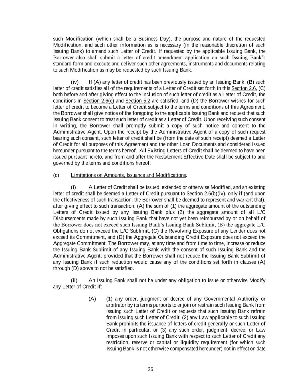 36 such Modification (which shall be a Business Day), the purpose and nature of the requested Modification, and such other information as is necessary (in the reasonable discretion of such Issuing Bank) to amend such Letter of Credit. If requested by the applicable Issuing Bank, the Borrower also shall submit a letter of credit amendment application on such Issuing Bank’s standard form and execute and deliver such other agreements, instruments and documents relating to such Modification as may be requested by such Issuing Bank. (iv) If (A) any letter of credit has been previously issued by an Issuing Bank, (B) such letter of credit satisfies all of the requirements of a Letter of Credit set forth in this Section 2.6, (C) both before and after giving effect to the inclusion of such letter of credit as a Letter of Credit, the conditions in Section 2.6(c) and Section 5.2 are satisfied, and (D) the Borrower wishes for such letter of credit to become a Letter of Credit subject to the terms and conditions of this Agreement, the Borrower shall give notice of the foregoing to the applicable Issuing Bank and request that such Issuing Bank consent to treat such letter of credit as a Letter of Credit. Upon receiving such consent in writing, the Borrower shall promptly submit a copy of such notice and consent to the Administrative Agent. Upon the receipt by the Administrative Agent of a copy of such request bearing such consent, such letter of credit shall be (from the date of such receipt) deemed a Letter of Credit for all purposes of this Agreement and the other Loan Documents and considered issued hereunder pursuant to the terms hereof. All Existing Letters of Credit shall be deemed to have been issued pursuant hereto, and from and after the Restatement Effective Date shall be subject to and governed by the terms and conditions hereof. (c) Limitations on Amounts, Issuance and Modifications. (i) A Letter of Credit shall be issued, extended or otherwise Modified, and an existing letter of credit shall be deemed a Letter of Credit pursuant to Section 2.6(b)(iv), only if (and upon the effectiveness of such transaction, the Borrower shall be deemed to represent and warrant that), after giving effect to such transaction, (A) the sum of (1) the aggregate amount of the outstanding Letters of Credit issued by any Issuing Bank plus (2) the aggregate amount of all L/C Disbursements made by such Issuing Bank that have not yet been reimbursed by or on behalf of the Borrower does not exceed such Issuing Bank’s Issuing Bank Sublimit, (B) the aggregate L/C Obligations do not exceed the L/C Sublimit, (C) the Revolving Exposure of any Lender does not exceed its Commitment, and (D) the Aggregate Outstanding Credit Exposure does not exceed the Aggregate Commitment. The Borrower may, at any time and from time to time, increase or reduce the Issuing Bank Sublimit of any Issuing Bank with the consent of such Issuing Bank and the Administrative Agent; provided that the Borrower shall not reduce the Issuing Bank Sublimit of any Issuing Bank if such reduction would cause any of the conditions set forth in clauses (A) through (D) above to not be satisfied. (ii) An Issuing Bank shall not be under any obligation to issue or otherwise Modify any Letter of Credit if: (A) (1) any order, judgment or decree of any Governmental Authority or arbitrator by its terms purports to enjoin or restrain such Issuing Bank from issuing such Letter of Credit or requests that such Issuing Bank refrain from issuing such Letter of Credit, (2) any Law applicable to such Issuing Bank prohibits the issuance of letters of credit generally or such Letter of Credit in particular, or (3) any such order, judgment, decree, or Law imposes upon such Issuing Bank with respect to such Letter of Credit any restriction, reserve or capital or liquidity requirement (for which such Issuing Bank is not otherwise compensated hereunder) not in effect on date