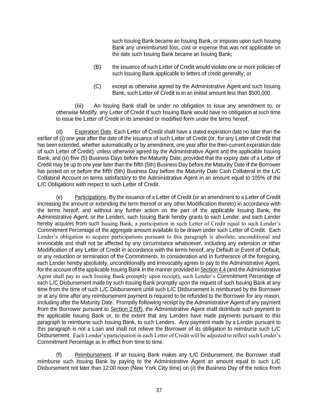 37 such Issuing Bank became an Issuing Bank, or imposes upon such Issuing Bank any unreimbursed loss, cost or expense that was not applicable on the date such Issuing Bank became an Issuing Bank; (B) the issuance of such Letter of Credit would violate one or more policies of such Issuing Bank applicable to letters of credit generally; or (C) except as otherwise agreed by the Administrative Agent and such Issuing Bank, such Letter of Credit is in an initial amount less than $500,000. (iii) An Issuing Bank shall be under no obligation to issue any amendment to, or otherwise Modify, any Letter of Credit if such Issuing Bank would have no obligation at such time to issue the Letter of Credit in its amended or modified form under the terms hereof. (d) Expiration Date. Each Letter of Credit shall have a stated expiration date no later than the earlier of (i) one year after the date of the issuance of such Letter of Credit (or, for any Letter of Credit that has been extended, whether automatically or by amendment, one year after the then-current expiration date of such Letter of Credit), unless otherwise agreed by the Administrative Agent and the applicable Issuing Bank, and (ii) five (5) Business Days before the Maturity Date; provided that the expiry date of a Letter of Credit may be up to one year later than the fifth (5th) Business Day before the Maturity Date if the Borrower has posted on or before the fifth (5th) Business Day before the Maturity Date Cash Collateral in the L/C Collateral Account on terms satisfactory to the Administrative Agent in an amount equal to 105% of the L/C Obligations with respect to such Letter of Credit. (e) Participations. By the issuance of a Letter of Credit (or an amendment to a Letter of Credit increasing the amount or extending the term thereof or any other Modification thereto) in accordance with the terms hereof, and without any further action on the part of the applicable Issuing Bank, the Administrative Agent, or the Lenders, such Issuing Bank hereby grants to each Lender, and each Lender hereby acquires from such Issuing Bank, a participation in such Letter of Credit equal to such Lender’s Commitment Percentage of the aggregate amount available to be drawn under such Letter of Credit. Each Lender’s obligation to acquire participations pursuant to this paragraph is absolute, unconditional and irrevocable and shall not be affected by any circumstance whatsoever, including any extension or other Modification of any Letter of Credit in accordance with the terms hereof, any Default or Event of Default, or any reduction or termination of the Commitments. In consideration and in furtherance of the foregoing, each Lender hereby absolutely, unconditionally and irrevocably agrees to pay to the Administrative Agent, for the account of the applicable Issuing Bank in the manner provided in Section 4.4 (and the Administrative Agent shall pay to such Issuing Bank promptly upon receipt), such Lender’s Commitment Percentage of each L/C Disbursement made by such Issuing Bank promptly upon the request of such Issuing Bank at any time from the time of such L/C Disbursement until such L/C Disbursement is reimbursed by the Borrower or at any time after any reimbursement payment is required to be refunded to the Borrower for any reason, including after the Maturity Date. Promptly following receipt by the Administrative Agent of any payment from the Borrower pursuant to Section 2.6(f), the Administrative Agent shall distribute such payment to the applicable Issuing Bank or, to the extent that any Lenders have made payments pursuant to this paragraph to reimburse such Issuing Bank, to such Lenders. Any payment made by a Lender pursuant to this paragraph is not a Loan and shall not relieve the Borrower of its obligation to reimburse such L/C Disbursement. Each Lender’s participation in each Letter of Credit will be adjusted to reflect such Lender’s Commitment Percentage as in effect from time to time. (f) Reimbursement. If an Issuing Bank makes any L/C Disbursement, the Borrower shall reimburse such Issuing Bank by paying to the Administrative Agent an amount equal to such L/C Disbursement not later than 12:00 noon (New York City time) on (i) the Business Day of the notice from