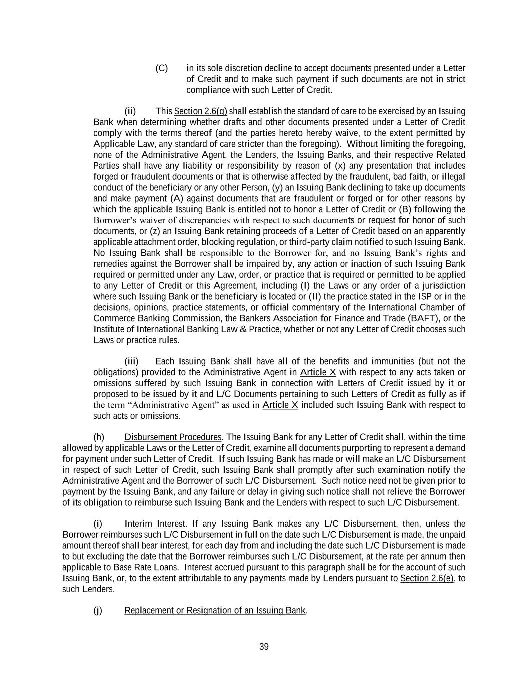 39 (C) in its sole discretion decline to accept documents presented under a Letter of Credit and to make such payment if such documents are not in strict compliance with such Letter of Credit. (ii) This Section 2.6(g) shall establish the standard of care to be exercised by an Issuing Bank when determining whether drafts and other documents presented under a Letter of Credit comply with the terms thereof (and the parties hereto hereby waive, to the extent permitted by Applicable Law, any standard of care stricter than the foregoing). Without limiting the foregoing, none of the Administrative Agent, the Lenders, the Issuing Banks, and their respective Related Parties shall have any liability or responsibility by reason of (x) any presentation that includes forged or fraudulent documents or that is otherwise affected by the fraudulent, bad faith, or illegal conduct of the beneficiary or any other Person, (y) an Issuing Bank declining to take up documents and make payment (A) against documents that are fraudulent or forged or for other reasons by which the applicable Issuing Bank is entitled not to honor a Letter of Credit or (B) following the Borrower’s waiver of discrepancies with respect to such documents or request for honor of such documents, or (z) an Issuing Bank retaining proceeds of a Letter of Credit based on an apparently applicable attachment order, blocking regulation, or third-party claim notified to such Issuing Bank. No Issuing Bank shall be responsible to the Borrower for, and no Issuing Bank’s rights and remedies against the Borrower shall be impaired by, any action or inaction of such Issuing Bank required or permitted under any Law, order, or practice that is required or permitted to be applied to any Letter of Credit or this Agreement, including (I) the Laws or any order of a jurisdiction where such Issuing Bank or the beneficiary is located or (II) the practice stated in the ISP or in the decisions, opinions, practice statements, or official commentary of the International Chamber of Commerce Banking Commission, the Bankers Association for Finance and Trade (BAFT), or the Institute of International Banking Law & Practice, whether or not any Letter of Credit chooses such Laws or practice rules. (iii) Each Issuing Bank shall have all of the benefits and immunities (but not the obligations) provided to the Administrative Agent in Article X with respect to any acts taken or omissions suffered by such Issuing Bank in connection with Letters of Credit issued by it or proposed to be issued by it and L/C Documents pertaining to such Letters of Credit as fully as if the term “Administrative Agent” as used in Article X included such Issuing Bank with respect to such acts or omissions. (h) Disbursement Procedures. The Issuing Bank for any Letter of Credit shall, within the time allowed by applicable Laws or the Letter of Credit, examine all documents purporting to represent a demand for payment under such Letter of Credit. If such Issuing Bank has made or will make an L/C Disbursement in respect of such Letter of Credit, such Issuing Bank shall promptly after such examination notify the Administrative Agent and the Borrower of such L/C Disbursement. Such notice need not be given prior to payment by the Issuing Bank, and any failure or delay in giving such notice shall not relieve the Borrower of its obligation to reimburse such Issuing Bank and the Lenders with respect to such L/C Disbursement. (i) Interim Interest. If any Issuing Bank makes any L/C Disbursement, then, unless the Borrower reimburses such L/C Disbursement in full on the date such L/C Disbursement is made, the unpaid amount thereof shall bear interest, for each day from and including the date such L/C Disbursement is made to but excluding the date that the Borrower reimburses such L/C Disbursement, at the rate per annum then applicable to Base Rate Loans. Interest accrued pursuant to this paragraph shall be for the account of such Issuing Bank, or, to the extent attributable to any payments made by Lenders pursuant to Section 2.6(e), to such Lenders. (j) Replacement or Resignation of an Issuing Bank.