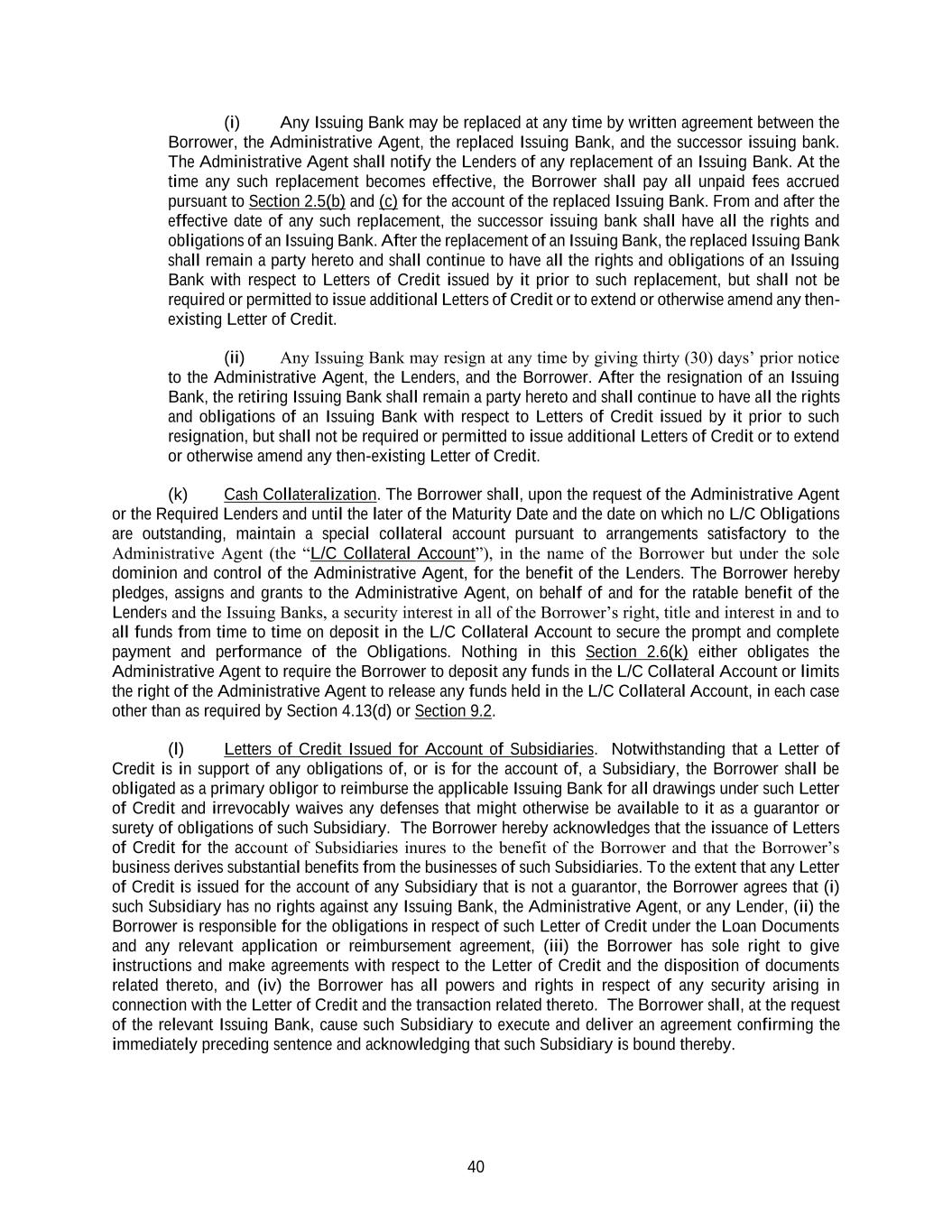 40 (i) Any Issuing Bank may be replaced at any time by written agreement between the Borrower, the Administrative Agent, the replaced Issuing Bank, and the successor issuing bank. The Administrative Agent shall notify the Lenders of any replacement of an Issuing Bank. At the time any such replacement becomes effective, the Borrower shall pay all unpaid fees accrued pursuant to Section 2.5(b) and (c) for the account of the replaced Issuing Bank. From and after the effective date of any such replacement, the successor issuing bank shall have all the rights and obligations of an Issuing Bank. After the replacement of an Issuing Bank, the replaced Issuing Bank shall remain a party hereto and shall continue to have all the rights and obligations of an Issuing Bank with respect to Letters of Credit issued by it prior to such replacement, but shall not be required or permitted to issue additional Letters of Credit or to extend or otherwise amend any then- existing Letter of Credit. (ii) Any Issuing Bank may resign at any time by giving thirty (30) days’ prior notice to the Administrative Agent, the Lenders, and the Borrower. After the resignation of an Issuing Bank, the retiring Issuing Bank shall remain a party hereto and shall continue to have all the rights and obligations of an Issuing Bank with respect to Letters of Credit issued by it prior to such resignation, but shall not be required or permitted to issue additional Letters of Credit or to extend or otherwise amend any then-existing Letter of Credit. (k) Cash Collateralization. The Borrower shall, upon the request of the Administrative Agent or the Required Lenders and until the later of the Maturity Date and the date on which no L/C Obligations are outstanding, maintain a special collateral account pursuant to arrangements satisfactory to the Administrative Agent (the “L/C Collateral Account”), in the name of the Borrower but under the sole dominion and control of the Administrative Agent, for the benefit of the Lenders. The Borrower hereby pledges, assigns and grants to the Administrative Agent, on behalf of and for the ratable benefit of the Lenders and the Issuing Banks, a security interest in all of the Borrower’s right, title and interest in and to all funds from time to time on deposit in the L/C Collateral Account to secure the prompt and complete payment and performance of the Obligations. Nothing in this Section 2.6(k) either obligates the Administrative Agent to require the Borrower to deposit any funds in the L/C Collateral Account or limits the right of the Administrative Agent to release any funds held in the L/C Collateral Account, in each case other than as required by Section 4.13(d) or Section 9.2. (l) Letters of Credit Issued for Account of Subsidiaries. Notwithstanding that a Letter of Credit is in support of any obligations of, or is for the account of, a Subsidiary, the Borrower shall be obligated as a primary obligor to reimburse the applicable Issuing Bank for all drawings under such Letter of Credit and irrevocably waives any defenses that might otherwise be available to it as a guarantor or surety of obligations of such Subsidiary. The Borrower hereby acknowledges that the issuance of Letters of Credit for the account of Subsidiaries inures to the benefit of the Borrower and that the Borrower’s business derives substantial benefits from the businesses of such Subsidiaries. To the extent that any Letter of Credit is issued for the account of any Subsidiary that is not a guarantor, the Borrower agrees that (i) such Subsidiary has no rights against any Issuing Bank, the Administrative Agent, or any Lender, (ii) the Borrower is responsible for the obligations in respect of such Letter of Credit under the Loan Documents and any relevant application or reimbursement agreement, (iii) the Borrower has sole right to give instructions and make agreements with respect to the Letter of Credit and the disposition of documents related thereto, and (iv) the Borrower has all powers and rights in respect of any security arising in connection with the Letter of Credit and the transaction related thereto. The Borrower shall, at the request of the relevant Issuing Bank, cause such Subsidiary to execute and deliver an agreement confirming the immediately preceding sentence and acknowledging that such Subsidiary is bound thereby.