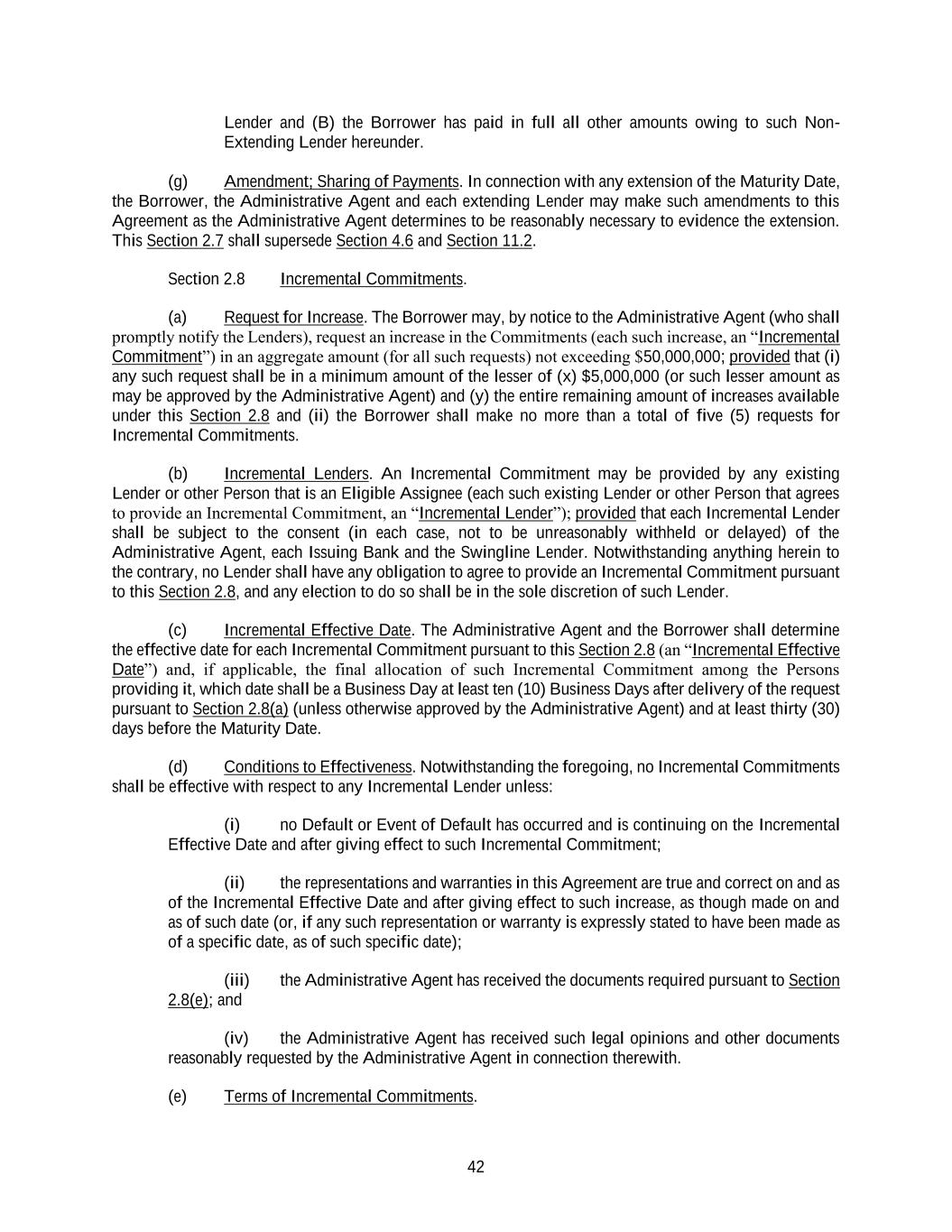 42 Lender and (B) the Borrower has paid in full all other amounts owing to such Non- Extending Lender hereunder. (g) Amendment; Sharing of Payments. In connection with any extension of the Maturity Date, the Borrower, the Administrative Agent and each extending Lender may make such amendments to this Agreement as the Administrative Agent determines to be reasonably necessary to evidence the extension. This Section 2.7 shall supersede Section 4.6 and Section 11.2. Section 2.8 Incremental Commitments. (a) Request for Increase. The Borrower may, by notice to the Administrative Agent (who shall promptly notify the Lenders), request an increase in the Commitments (each such increase, an “Incremental Commitment”) in an aggregate amount (for all such requests) not exceeding $50,000,000; provided that (i) any such request shall be in a minimum amount of the lesser of (x) $5,000,000 (or such lesser amount as may be approved by the Administrative Agent) and (y) the entire remaining amount of increases available under this Section 2.8 and (ii) the Borrower shall make no more than a total of five (5) requests for Incremental Commitments. (b) Incremental Lenders. An Incremental Commitment may be provided by any existing Lender or other Person that is an Eligible Assignee (each such existing Lender or other Person that agrees to provide an Incremental Commitment, an “Incremental Lender”); provided that each Incremental Lender shall be subject to the consent (in each case, not to be unreasonably withheld or delayed) of the Administrative Agent, each Issuing Bank and the Swingline Lender. Notwithstanding anything herein to the contrary, no Lender shall have any obligation to agree to provide an Incremental Commitment pursuant to this Section 2.8, and any election to do so shall be in the sole discretion of such Lender. (c) Incremental Effective Date. The Administrative Agent and the Borrower shall determine the effective date for each Incremental Commitment pursuant to this Section 2.8 (an “Incremental Effective Date”) and, if applicable, the final allocation of such Incremental Commitment among the Persons providing it, which date shall be a Business Day at least ten (10) Business Days after delivery of the request pursuant to Section 2.8(a) (unless otherwise approved by the Administrative Agent) and at least thirty (30) days before the Maturity Date. (d) Conditions to Effectiveness. Notwithstanding the foregoing, no Incremental Commitments shall be effective with respect to any Incremental Lender unless: (i) no Default or Event of Default has occurred and is continuing on the Incremental Effective Date and after giving effect to such Incremental Commitment; (ii) the representations and warranties in this Agreement are true and correct on and as of the Incremental Effective Date and after giving effect to such increase, as though made on and as of such date (or, if any such representation or warranty is expressly stated to have been made as of a specific date, as of such specific date); (iii) the Administrative Agent has received the documents required pursuant to Section 2.8(e); and (iv) the Administrative Agent has received such legal opinions and other documents reasonably requested by the Administrative Agent in connection therewith. (e) Terms of Incremental Commitments.