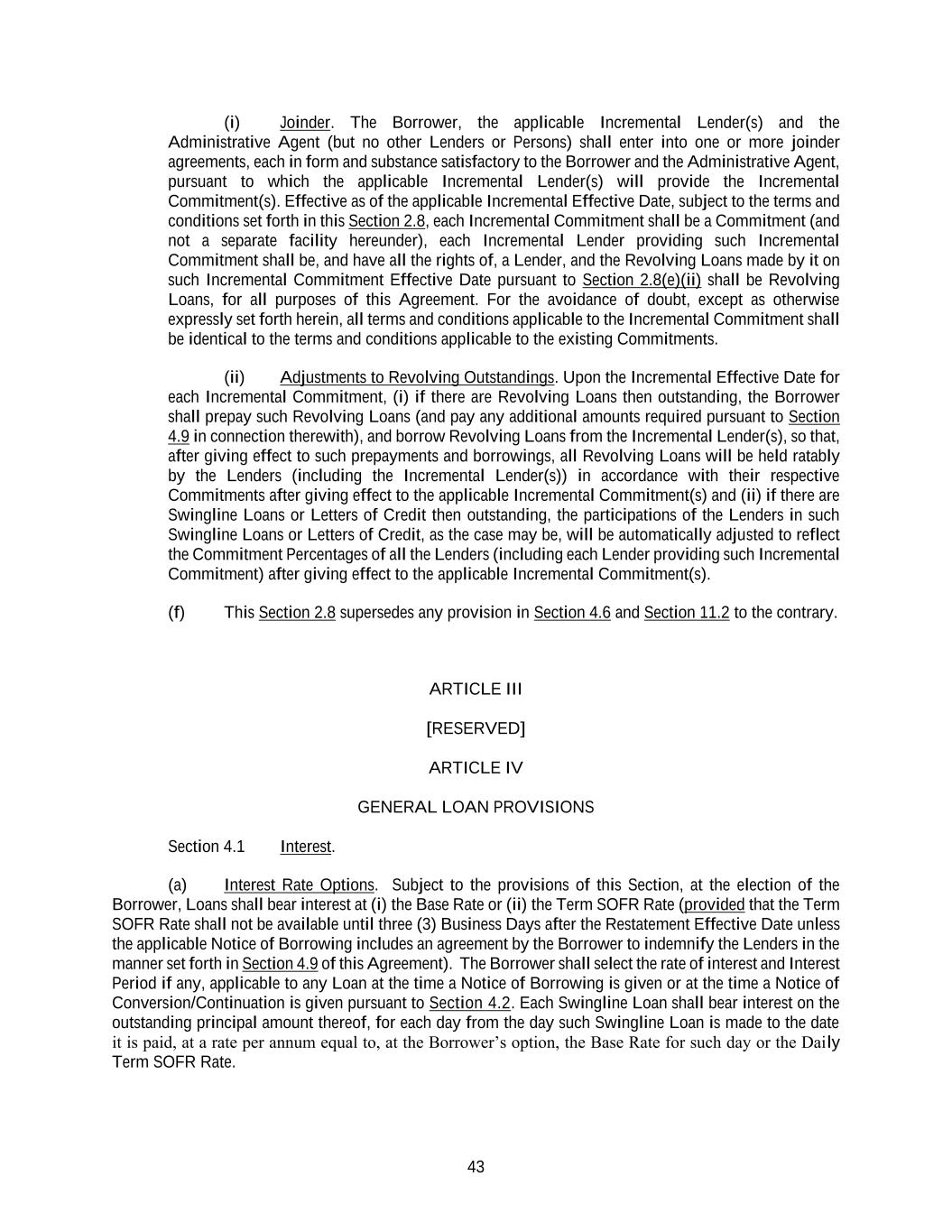43 (i) Joinder. The Borrower, the applicable Incremental Lender(s) and the Administrative Agent (but no other Lenders or Persons) shall enter into one or more joinder agreements, each in form and substance satisfactory to the Borrower and the Administrative Agent, pursuant to which the applicable Incremental Lender(s) will provide the Incremental Commitment(s). Effective as of the applicable Incremental Effective Date, subject to the terms and conditions set forth in this Section 2.8, each Incremental Commitment shall be a Commitment (and not a separate facility hereunder), each Incremental Lender providing such Incremental Commitment shall be, and have all the rights of, a Lender, and the Revolving Loans made by it on such Incremental Commitment Effective Date pursuant to Section 2.8(e)(ii) shall be Revolving Loans, for all purposes of this Agreement. For the avoidance of doubt, except as otherwise expressly set forth herein, all terms and conditions applicable to the Incremental Commitment shall be identical to the terms and conditions applicable to the existing Commitments. (ii) Adjustments to Revolving Outstandings. Upon the Incremental Effective Date for each Incremental Commitment, (i) if there are Revolving Loans then outstanding, the Borrower shall prepay such Revolving Loans (and pay any additional amounts required pursuant to Section 4.9 in connection therewith), and borrow Revolving Loans from the Incremental Lender(s), so that, after giving effect to such prepayments and borrowings, all Revolving Loans will be held ratably by the Lenders (including the Incremental Lender(s)) in accordance with their respective Commitments after giving effect to the applicable Incremental Commitment(s) and (ii) if there are Swingline Loans or Letters of Credit then outstanding, the participations of the Lenders in such Swingline Loans or Letters of Credit, as the case may be, will be automatically adjusted to reflect the Commitment Percentages of all the Lenders (including each Lender providing such Incremental Commitment) after giving effect to the applicable Incremental Commitment(s). (f) This Section 2.8 supersedes any provision in Section 4.6 and Section 11.2 to the contrary. ARTICLE III [RESERVED] ARTICLE IV GENERAL LOAN PROVISIONS Section 4.1 Interest. (a) Interest Rate Options. Subject to the provisions of this Section, at the election of the Borrower, Loans shall bear interest at (i) the Base Rate or (ii) the Term SOFR Rate (provided that the Term SOFR Rate shall not be available until three (3) Business Days after the Restatement Effective Date unless the applicable Notice of Borrowing includes an agreement by the Borrower to indemnify the Lenders in the manner set forth in Section 4.9 of this Agreement). The Borrower shall select the rate of interest and Interest Period if any, applicable to any Loan at the time a Notice of Borrowing is given or at the time a Notice of Conversion/Continuation is given pursuant to Section 4.2. Each Swingline Loan shall bear interest on the outstanding principal amount thereof, for each day from the day such Swingline Loan is made to the date it is paid, at a rate per annum equal to, at the Borrower’s option, the Base Rate for such day or the Daily Term SOFR Rate.