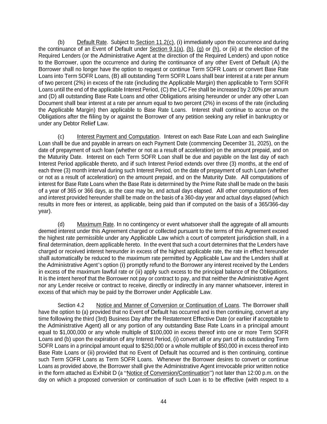 44 (b) Default Rate. Subject to Section 11.2(c), (i) immediately upon the occurrence and during the continuance of an Event of Default under Section 9.1(a), (b), (g) or (h), or (ii) at the election of the Required Lenders (or the Administrative Agent at the direction of the Required Lenders) and upon notice to the Borrower, upon the occurrence and during the continuance of any other Event of Default (A) the Borrower shall no longer have the option to request or continue Term SOFR Loans or convert Base Rate Loans into Term SOFR Loans, (B) all outstanding Term SOFR Loans shall bear interest at a rate per annum of two percent (2%) in excess of the rate (including the Applicable Margin) then applicable to Term SOFR Loans until the end of the applicable Interest Period, (C) the L/C Fee shall be increased by 2.00% per annum and (D) all outstanding Base Rate Loans and other Obligations arising hereunder or under any other Loan Document shall bear interest at a rate per annum equal to two percent (2%) in excess of the rate (including the Applicable Margin) then applicable to Base Rate Loans. Interest shall continue to accrue on the Obligations after the filing by or against the Borrower of any petition seeking any relief in bankruptcy or under any Debtor Relief Law. (c) Interest Payment and Computation. Interest on each Base Rate Loan and each Swingline Loan shall be due and payable in arrears on each Payment Date (commencing December 31, 2025), on the date of prepayment of such loan (whether or not as a result of acceleration) on the amount prepaid, and on the Maturity Date. Interest on each Term SOFR Loan shall be due and payable on the last day of each Interest Period applicable thereto, and if such Interest Period extends over three (3) months, at the end of each three (3) month interval during such Interest Period, on the date of prepayment of such Loan (whether or not as a result of acceleration) on the amount prepaid, and on the Maturity Date. All computations of interest for Base Rate Loans when the Base Rate is determined by the Prime Rate shall be made on the basis of a year of 365 or 366 days, as the case may be, and actual days elapsed. All other computations of fees and interest provided hereunder shall be made on the basis of a 360-day year and actual days elapsed (which results in more fees or interest, as applicable, being paid than if computed on the basis of a 365/366-day year). (d) Maximum Rate. In no contingency or event whatsoever shall the aggregate of all amounts deemed interest under this Agreement charged or collected pursuant to the terms of this Agreement exceed the highest rate permissible under any Applicable Law which a court of competent jurisdiction shall, in a final determination, deem applicable hereto. In the event that such a court determines that the Lenders have charged or received interest hereunder in excess of the highest applicable rate, the rate in effect hereunder shall automatically be reduced to the maximum rate permitted by Applicable Law and the Lenders shall at the Administrative Agent’s option (i) promptly refund to the Borrower any interest received by the Lenders in excess of the maximum lawful rate or (ii) apply such excess to the principal balance of the Obligations. It is the intent hereof that the Borrower not pay or contract to pay, and that neither the Administrative Agent nor any Lender receive or contract to receive, directly or indirectly in any manner whatsoever, interest in excess of that which may be paid by the Borrower under Applicable Law. Section 4.2 Notice and Manner of Conversion or Continuation of Loans. The Borrower shall have the option to (a) provided that no Event of Default has occurred and is then continuing, convert at any time following the third (3rd) Business Day after the Restatement Effective Date (or earlier if acceptable to the Administrative Agent) all or any portion of any outstanding Base Rate Loans in a principal amount equal to $1,000,000 or any whole multiple of $100,000 in excess thereof into one or more Term SOFR Loans and (b) upon the expiration of any Interest Period, (i) convert all or any part of its outstanding Term SOFR Loans in a principal amount equal to $250,000 or a whole multiple of $50,000 in excess thereof into Base Rate Loans or (ii) provided that no Event of Default has occurred and is then continuing, continue such Term SOFR Loans as Term SOFR Loans. Whenever the Borrower desires to convert or continue Loans as provided above, the Borrower shall give the Administrative Agent irrevocable prior written notice in the form attached as Exhibit D (a “Notice of Conversion/Continuation”) not later than 12:00 p.m. on the day on which a proposed conversion or continuation of such Loan is to be effective (with respect to a