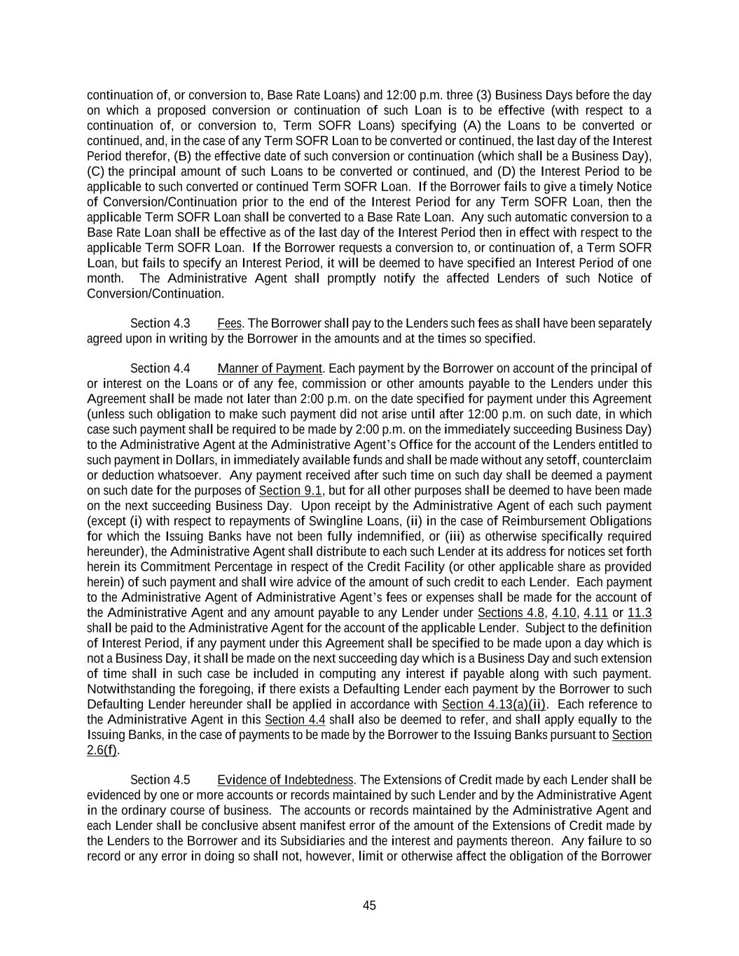 45 continuation of, or conversion to, Base Rate Loans) and 12:00 p.m. three (3) Business Days before the day on which a proposed conversion or continuation of such Loan is to be effective (with respect to a continuation of, or conversion to, Term SOFR Loans) specifying (A) the Loans to be converted or continued, and, in the case of any Term SOFR Loan to be converted or continued, the last day of the Interest Period therefor, (B) the effective date of such conversion or continuation (which shall be a Business Day), (C) the principal amount of such Loans to be converted or continued, and (D) the Interest Period to be applicable to such converted or continued Term SOFR Loan. If the Borrower fails to give a timely Notice of Conversion/Continuation prior to the end of the Interest Period for any Term SOFR Loan, then the applicable Term SOFR Loan shall be converted to a Base Rate Loan. Any such automatic conversion to a Base Rate Loan shall be effective as of the last day of the Interest Period then in effect with respect to the applicable Term SOFR Loan. If the Borrower requests a conversion to, or continuation of, a Term SOFR Loan, but fails to specify an Interest Period, it will be deemed to have specified an Interest Period of one month. The Administrative Agent shall promptly notify the affected Lenders of such Notice of Conversion/Continuation. Section 4.3 Fees. The Borrower shall pay to the Lenders such fees as shall have been separately agreed upon in writing by the Borrower in the amounts and at the times so specified. Section 4.4 Manner of Payment. Each payment by the Borrower on account of the principal of or interest on the Loans or of any fee, commission or other amounts payable to the Lenders under this Agreement shall be made not later than 2:00 p.m. on the date specified for payment under this Agreement (unless such obligation to make such payment did not arise until after 12:00 p.m. on such date, in which case such payment shall be required to be made by 2:00 p.m. on the immediately succeeding Business Day) to the Administrative Agent at the Administrative Agent’s Office for the account of the Lenders entitled to such payment in Dollars, in immediately available funds and shall be made without any setoff, counterclaim or deduction whatsoever. Any payment received after such time on such day shall be deemed a payment on such date for the purposes of Section 9.1, but for all other purposes shall be deemed to have been made on the next succeeding Business Day. Upon receipt by the Administrative Agent of each such payment (except (i) with respect to repayments of Swingline Loans, (ii) in the case of Reimbursement Obligations for which the Issuing Banks have not been fully indemnified, or (iii) as otherwise specifically required hereunder), the Administrative Agent shall distribute to each such Lender at its address for notices set forth herein its Commitment Percentage in respect of the Credit Facility (or other applicable share as provided herein) of such payment and shall wire advice of the amount of such credit to each Lender. Each payment to the Administrative Agent of Administrative Agent’s fees or expenses shall be made for the account of the Administrative Agent and any amount payable to any Lender under Sections 4.8, 4.10, 4.11 or 11.3 shall be paid to the Administrative Agent for the account of the applicable Lender. Subject to the definition of Interest Period, if any payment under this Agreement shall be specified to be made upon a day which is not a Business Day, it shall be made on the next succeeding day which is a Business Day and such extension of time shall in such case be included in computing any interest if payable along with such payment. Notwithstanding the foregoing, if there exists a Defaulting Lender each payment by the Borrower to such Defaulting Lender hereunder shall be applied in accordance with Section 4.13(a)(ii). Each reference to the Administrative Agent in this Section 4.4 shall also be deemed to refer, and shall apply equally to the Issuing Banks, in the case of payments to be made by the Borrower to the Issuing Banks pursuant to Section 2.6(f). Section 4.5 Evidence of Indebtedness. The Extensions of Credit made by each Lender shall be evidenced by one or more accounts or records maintained by such Lender and by the Administrative Agent in the ordinary course of business. The accounts or records maintained by the Administrative Agent and each Lender shall be conclusive absent manifest error of the amount of the Extensions of Credit made by the Lenders to the Borrower and its Subsidiaries and the interest and payments thereon. Any failure to so record or any error in doing so shall not, however, limit or otherwise affect the obligation of the Borrower