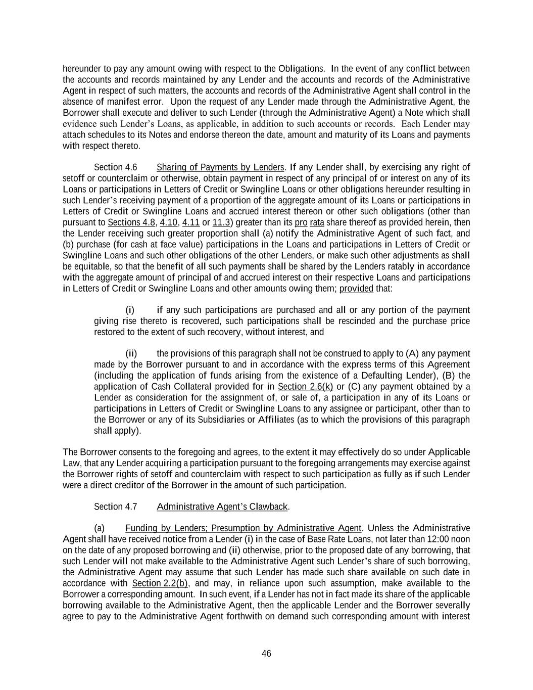 46 hereunder to pay any amount owing with respect to the Obligations. In the event of any conflict between the accounts and records maintained by any Lender and the accounts and records of the Administrative Agent in respect of such matters, the accounts and records of the Administrative Agent shall control in the absence of manifest error. Upon the request of any Lender made through the Administrative Agent, the Borrower shall execute and deliver to such Lender (through the Administrative Agent) a Note which shall evidence such Lender’s Loans, as applicable, in addition to such accounts or records. Each Lender may attach schedules to its Notes and endorse thereon the date, amount and maturity of its Loans and payments with respect thereto. Section 4.6 Sharing of Payments by Lenders. If any Lender shall, by exercising any right of setoff or counterclaim or otherwise, obtain payment in respect of any principal of or interest on any of its Loans or participations in Letters of Credit or Swingline Loans or other obligations hereunder resulting in such Lender’s receiving payment of a proportion of the aggregate amount of its Loans or participations in Letters of Credit or Swingline Loans and accrued interest thereon or other such obligations (other than pursuant to Sections 4.8, 4.10, 4.11 or 11.3) greater than its pro rata share thereof as provided herein, then the Lender receiving such greater proportion shall (a) notify the Administrative Agent of such fact, and (b) purchase (for cash at face value) participations in the Loans and participations in Letters of Credit or Swingline Loans and such other obligations of the other Lenders, or make such other adjustments as shall be equitable, so that the benefit of all such payments shall be shared by the Lenders ratably in accordance with the aggregate amount of principal of and accrued interest on their respective Loans and participations in Letters of Credit or Swingline Loans and other amounts owing them; provided that: (i) if any such participations are purchased and all or any portion of the payment giving rise thereto is recovered, such participations shall be rescinded and the purchase price restored to the extent of such recovery, without interest, and (ii) the provisions of this paragraph shall not be construed to apply to (A) any payment made by the Borrower pursuant to and in accordance with the express terms of this Agreement (including the application of funds arising from the existence of a Defaulting Lender), (B) the application of Cash Collateral provided for in Section 2.6(k) or (C) any payment obtained by a Lender as consideration for the assignment of, or sale of, a participation in any of its Loans or participations in Letters of Credit or Swingline Loans to any assignee or participant, other than to the Borrower or any of its Subsidiaries or Affiliates (as to which the provisions of this paragraph shall apply). The Borrower consents to the foregoing and agrees, to the extent it may effectively do so under Applicable Law, that any Lender acquiring a participation pursuant to the foregoing arrangements may exercise against the Borrower rights of setoff and counterclaim with respect to such participation as fully as if such Lender were a direct creditor of the Borrower in the amount of such participation. Section 4.7 Administrative Agent’s Clawback. (a) Funding by Lenders; Presumption by Administrative Agent. Unless the Administrative Agent shall have received notice from a Lender (i) in the case of Base Rate Loans, not later than 12:00 noon on the date of any proposed borrowing and (ii) otherwise, prior to the proposed date of any borrowing, that such Lender will not make available to the Administrative Agent such Lender’s share of such borrowing, the Administrative Agent may assume that such Lender has made such share available on such date in accordance with Section 2.2(b), and may, in reliance upon such assumption, make available to the Borrower a corresponding amount. In such event, if a Lender has not in fact made its share of the applicable borrowing available to the Administrative Agent, then the applicable Lender and the Borrower severally agree to pay to the Administrative Agent forthwith on demand such corresponding amount with interest
