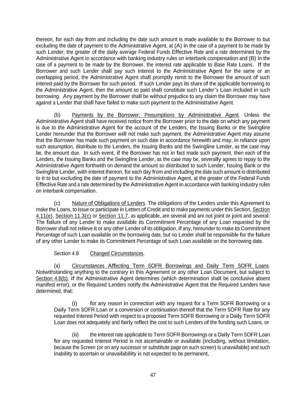 47 thereon, for each day from and including the date such amount is made available to the Borrower to but excluding the date of payment to the Administrative Agent, at (A) in the case of a payment to be made by such Lender, the greater of the daily average Federal Funds Effective Rate and a rate determined by the Administrative Agent in accordance with banking industry rules on interbank compensation and (B) in the case of a payment to be made by the Borrower, the interest rate applicable to Base Rate Loans. If the Borrower and such Lender shall pay such interest to the Administrative Agent for the same or an overlapping period, the Administrative Agent shall promptly remit to the Borrower the amount of such interest paid by the Borrower for such period. If such Lender pays its share of the applicable borrowing to the Administrative Agent, then the amount so paid shall constitute such Lender’s Loan included in such borrowing. Any payment by the Borrower shall be without prejudice to any claim the Borrower may have against a Lender that shall have failed to make such payment to the Administrative Agent. (b) Payments by the Borrower; Presumptions by Administrative Agent. Unless the Administrative Agent shall have received notice from the Borrower prior to the date on which any payment is due to the Administrative Agent for the account of the Lenders, the Issuing Banks or the Swingline Lender hereunder that the Borrower will not make such payment, the Administrative Agent may assume that the Borrower has made such payment on such date in accordance herewith and may, in reliance upon such assumption, distribute to the Lenders, the Issuing Banks and the Swingline Lender, as the case may be, the amount due. In such event, if the Borrower has not in fact made such payment, then each of the Lenders, the Issuing Banks and the Swingline Lender, as the case may be, severally agrees to repay to the Administrative Agent forthwith on demand the amount so distributed to such Lender, Issuing Bank or the Swingline Lender, with interest thereon, for each day from and including the date such amount is distributed to it to but excluding the date of payment to the Administrative Agent, at the greater of the Federal Funds Effective Rate and a rate determined by the Administrative Agent in accordance with banking industry rules on interbank compensation. (c) Nature of Obligations of Lenders. The obligations of the Lenders under this Agreement to make the Loans, to issue or participate in Letters of Credit and to make payments under this Section, Section 4.11(e), Section 11.3(c) or Section 11.7, as applicable, are several and are not joint or joint and several. The failure of any Lender to make available its Commitment Percentage of any Loan requested by the Borrower shall not relieve it or any other Lender of its obligation, if any, hereunder to make its Commitment Percentage of such Loan available on the borrowing date, but no Lender shall be responsible for the failure of any other Lender to make its Commitment Percentage of such Loan available on the borrowing date. Section 4.8 Changed Circumstances. (a) Circumstances Affecting Term SOFR Borrowings and Daily Term SOFR Loans. Notwithstanding anything to the contrary in this Agreement or any other Loan Document, but subject to Section 4.8(b), if the Administrative Agent determines (which determination shall be conclusive absent manifest error), or the Required Lenders notify the Administrative Agent that the Required Lenders have determined, that: (i) for any reason in connection with any request for a Term SOFR Borrowing or a Daily Term SOFR Loan or a conversion or continuation thereof that the Term SOFR Rate for any requested Interest Period with respect to a proposed Term SOFR Borrowing or a Daily Term SOFR Loan does not adequately and fairly reflect the cost to such Lenders of the funding such Loans, or (ii) the interest rate applicable to Term SOFR Borrowings or a Daily Term SOFR Loan for any requested Interest Period is not ascertainable or available (including, without limitation, because the Screen (or on any successor or substitute page on such screen) is unavailable) and such inability to ascertain or unavailability is not expected to be permanent,