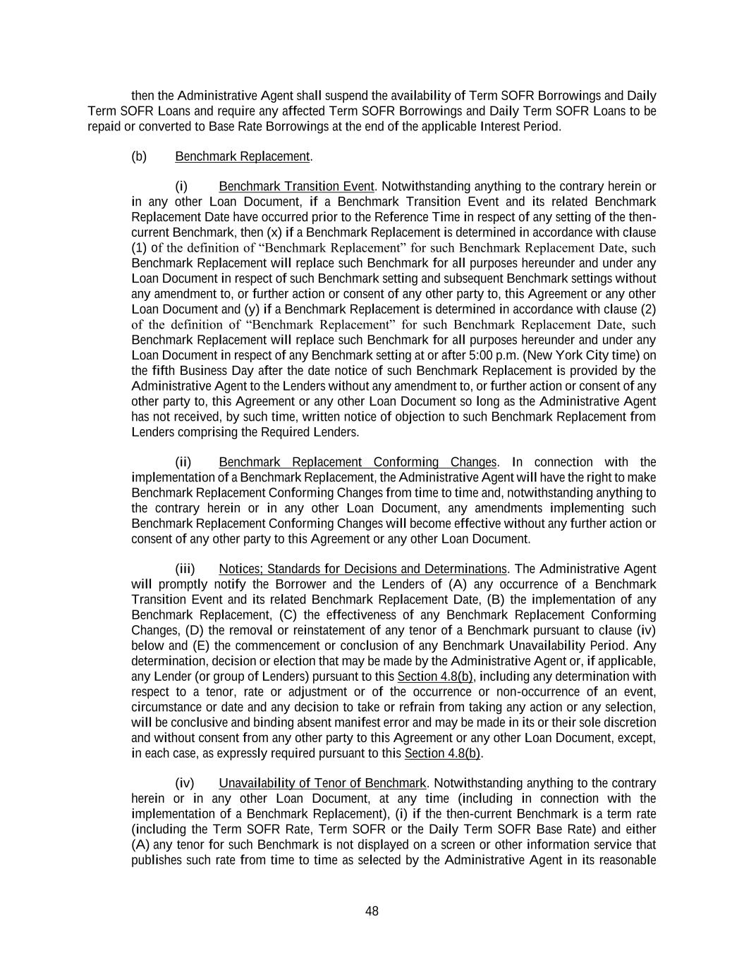 48 then the Administrative Agent shall suspend the availability of Term SOFR Borrowings and Daily Term SOFR Loans and require any affected Term SOFR Borrowings and Daily Term SOFR Loans to be repaid or converted to Base Rate Borrowings at the end of the applicable Interest Period. (b) Benchmark Replacement. (i) Benchmark Transition Event. Notwithstanding anything to the contrary herein or in any other Loan Document, if a Benchmark Transition Event and its related Benchmark Replacement Date have occurred prior to the Reference Time in respect of any setting of the then- current Benchmark, then (x) if a Benchmark Replacement is determined in accordance with clause (1) of the definition of “Benchmark Replacement” for such Benchmark Replacement Date, such Benchmark Replacement will replace such Benchmark for all purposes hereunder and under any Loan Document in respect of such Benchmark setting and subsequent Benchmark settings without any amendment to, or further action or consent of any other party to, this Agreement or any other Loan Document and (y) if a Benchmark Replacement is determined in accordance with clause (2) of the definition of “Benchmark Replacement” for such Benchmark Replacement Date, such Benchmark Replacement will replace such Benchmark for all purposes hereunder and under any Loan Document in respect of any Benchmark setting at or after 5:00 p.m. (New York City time) on the fifth Business Day after the date notice of such Benchmark Replacement is provided by the Administrative Agent to the Lenders without any amendment to, or further action or consent of any other party to, this Agreement or any other Loan Document so long as the Administrative Agent has not received, by such time, written notice of objection to such Benchmark Replacement from Lenders comprising the Required Lenders. (ii) Benchmark Replacement Conforming Changes. In connection with the implementation of a Benchmark Replacement, the Administrative Agent will have the right to make Benchmark Replacement Conforming Changes from time to time and, notwithstanding anything to the contrary herein or in any other Loan Document, any amendments implementing such Benchmark Replacement Conforming Changes will become effective without any further action or consent of any other party to this Agreement or any other Loan Document. (iii) Notices; Standards for Decisions and Determinations. The Administrative Agent will promptly notify the Borrower and the Lenders of (A) any occurrence of a Benchmark Transition Event and its related Benchmark Replacement Date, (B) the implementation of any Benchmark Replacement, (C) the effectiveness of any Benchmark Replacement Conforming Changes, (D) the removal or reinstatement of any tenor of a Benchmark pursuant to clause (iv) below and (E) the commencement or conclusion of any Benchmark Unavailability Period. Any determination, decision or election that may be made by the Administrative Agent or, if applicable, any Lender (or group of Lenders) pursuant to this Section 4.8(b), including any determination with respect to a tenor, rate or adjustment or of the occurrence or non-occurrence of an event, circumstance or date and any decision to take or refrain from taking any action or any selection, will be conclusive and binding absent manifest error and may be made in its or their sole discretion and without consent from any other party to this Agreement or any other Loan Document, except, in each case, as expressly required pursuant to this Section 4.8(b). (iv) Unavailability of Tenor of Benchmark. Notwithstanding anything to the contrary herein or in any other Loan Document, at any time (including in connection with the implementation of a Benchmark Replacement), (i) if the then-current Benchmark is a term rate (including the Term SOFR Rate, Term SOFR or the Daily Term SOFR Base Rate) and either (A) any tenor for such Benchmark is not displayed on a screen or other information service that publishes such rate from time to time as selected by the Administrative Agent in its reasonable