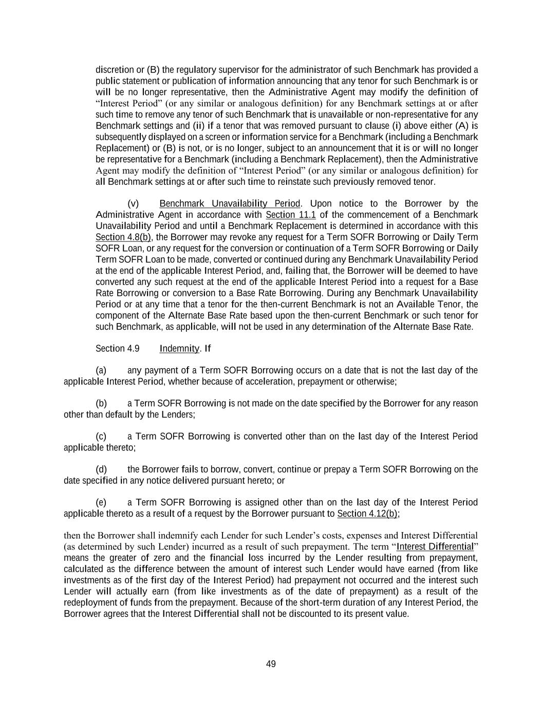 49 discretion or (B) the regulatory supervisor for the administrator of such Benchmark has provided a public statement or publication of information announcing that any tenor for such Benchmark is or will be no longer representative, then the Administrative Agent may modify the definition of “Interest Period” (or any similar or analogous definition) for any Benchmark settings at or after such time to remove any tenor of such Benchmark that is unavailable or non-representative for any Benchmark settings and (ii) if a tenor that was removed pursuant to clause (i) above either (A) is subsequently displayed on a screen or information service for a Benchmark (including a Benchmark Replacement) or (B) is not, or is no longer, subject to an announcement that it is or will no longer be representative for a Benchmark (including a Benchmark Replacement), then the Administrative Agent may modify the definition of “Interest Period” (or any similar or analogous definition) for all Benchmark settings at or after such time to reinstate such previously removed tenor. (v) Benchmark Unavailability Period. Upon notice to the Borrower by the Administrative Agent in accordance with Section 11.1 of the commencement of a Benchmark Unavailability Period and until a Benchmark Replacement is determined in accordance with this Section 4.8(b), the Borrower may revoke any request for a Term SOFR Borrowing or Daily Term SOFR Loan, or any request for the conversion or continuation of a Term SOFR Borrowing or Daily Term SOFR Loan to be made, converted or continued during any Benchmark Unavailability Period at the end of the applicable Interest Period, and, failing that, the Borrower will be deemed to have converted any such request at the end of the applicable Interest Period into a request for a Base Rate Borrowing or conversion to a Base Rate Borrowing. During any Benchmark Unavailability Period or at any time that a tenor for the then-current Benchmark is not an Available Tenor, the component of the Alternate Base Rate based upon the then-current Benchmark or such tenor for such Benchmark, as applicable, will not be used in any determination of the Alternate Base Rate. Section 4.9 Indemnity. If (a) any payment of a Term SOFR Borrowing occurs on a date that is not the last day of the applicable Interest Period, whether because of acceleration, prepayment or otherwise; (b) a Term SOFR Borrowing is not made on the date specified by the Borrower for any reason other than default by the Lenders; (c) a Term SOFR Borrowing is converted other than on the last day of the Interest Period applicable thereto; (d) the Borrower fails to borrow, convert, continue or prepay a Term SOFR Borrowing on the date specified in any notice delivered pursuant hereto; or (e) a Term SOFR Borrowing is assigned other than on the last day of the Interest Period applicable thereto as a result of a request by the Borrower pursuant to Section 4.12(b); then the Borrower shall indemnify each Lender for such Lender’s costs, expenses and Interest Differential (as determined by such Lender) incurred as a result of such prepayment. The term “Interest Differential” means the greater of zero and the financial loss incurred by the Lender resulting from prepayment, calculated as the difference between the amount of interest such Lender would have earned (from like investments as of the first day of the Interest Period) had prepayment not occurred and the interest such Lender will actually earn (from like investments as of the date of prepayment) as a result of the redeployment of funds from the prepayment. Because of the short-term duration of any Interest Period, the Borrower agrees that the Interest Differential shall not be discounted to its present value.