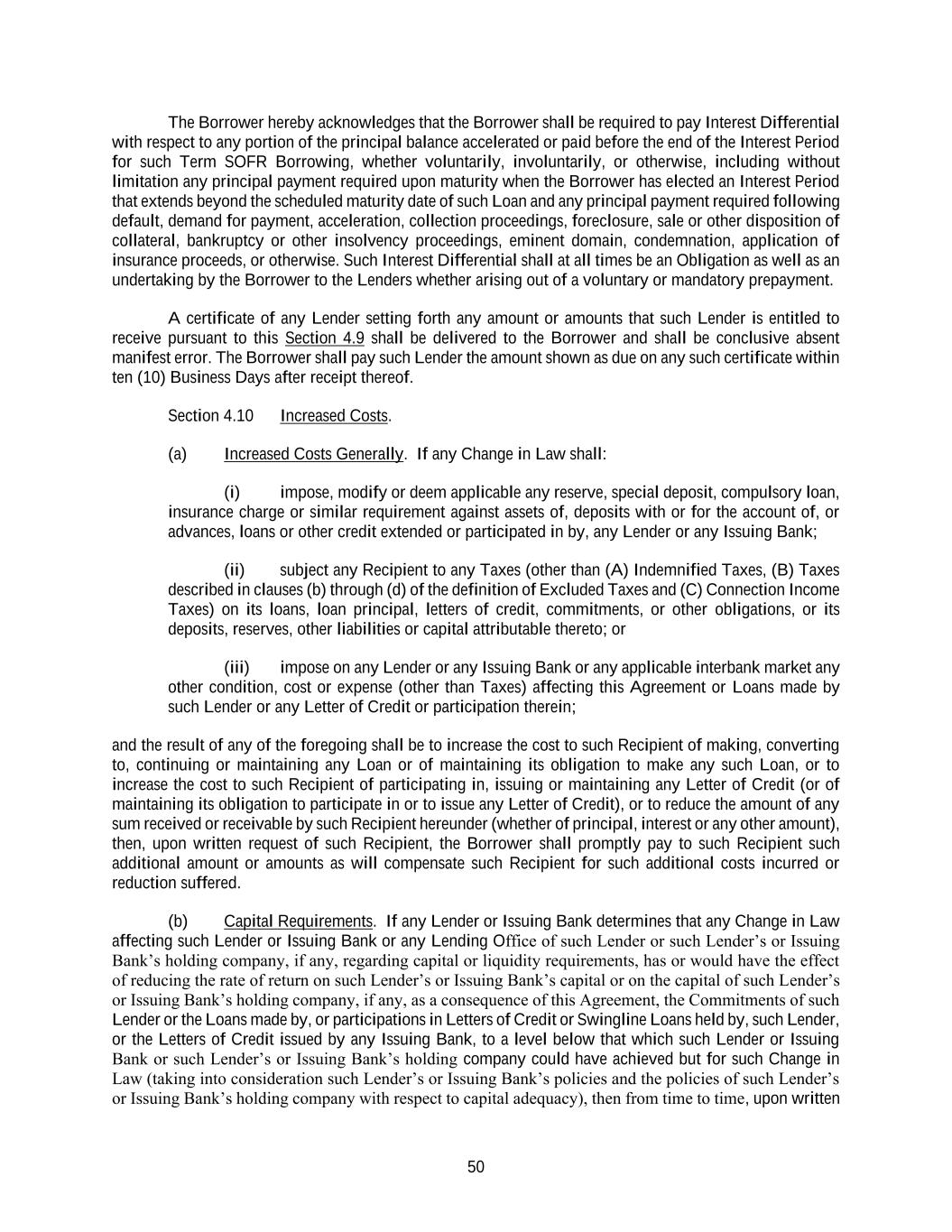 50 The Borrower hereby acknowledges that the Borrower shall be required to pay Interest Differential with respect to any portion of the principal balance accelerated or paid before the end of the Interest Period for such Term SOFR Borrowing, whether voluntarily, involuntarily, or otherwise, including without limitation any principal payment required upon maturity when the Borrower has elected an Interest Period that extends beyond the scheduled maturity date of such Loan and any principal payment required following default, demand for payment, acceleration, collection proceedings, foreclosure, sale or other disposition of collateral, bankruptcy or other insolvency proceedings, eminent domain, condemnation, application of insurance proceeds, or otherwise. Such Interest Differential shall at all times be an Obligation as well as an undertaking by the Borrower to the Lenders whether arising out of a voluntary or mandatory prepayment. A certificate of any Lender setting forth any amount or amounts that such Lender is entitled to receive pursuant to this Section 4.9 shall be delivered to the Borrower and shall be conclusive absent manifest error. The Borrower shall pay such Lender the amount shown as due on any such certificate within ten (10) Business Days after receipt thereof. Section 4.10 Increased Costs. (a) Increased Costs Generally. If any Change in Law shall: (i) impose, modify or deem applicable any reserve, special deposit, compulsory loan, insurance charge or similar requirement against assets of, deposits with or for the account of, or advances, loans or other credit extended or participated in by, any Lender or any Issuing Bank; (ii) subject any Recipient to any Taxes (other than (A) Indemnified Taxes, (B) Taxes described in clauses (b) through (d) of the definition of Excluded Taxes and (C) Connection Income Taxes) on its loans, loan principal, letters of credit, commitments, or other obligations, or its deposits, reserves, other liabilities or capital attributable thereto; or (iii) impose on any Lender or any Issuing Bank or any applicable interbank market any other condition, cost or expense (other than Taxes) affecting this Agreement or Loans made by such Lender or any Letter of Credit or participation therein; and the result of any of the foregoing shall be to increase the cost to such Recipient of making, converting to, continuing or maintaining any Loan or of maintaining its obligation to make any such Loan, or to increase the cost to such Recipient of participating in, issuing or maintaining any Letter of Credit (or of maintaining its obligation to participate in or to issue any Letter of Credit), or to reduce the amount of any sum received or receivable by such Recipient hereunder (whether of principal, interest or any other amount), then, upon written request of such Recipient, the Borrower shall promptly pay to such Recipient such additional amount or amounts as will compensate such Recipient for such additional costs incurred or reduction suffered. (b) Capital Requirements. If any Lender or Issuing Bank determines that any Change in Law affecting such Lender or Issuing Bank or any Lending Office of such Lender or such Lender’s or Issuing Bank’s holding company, if any, regarding capital or liquidity requirements, has or would have the effect of reducing the rate of return on such Lender’s or Issuing Bank’s capital or on the capital of such Lender’s or Issuing Bank’s holding company, if any, as a consequence of this Agreement, the Commitments of such Lender or the Loans made by, or participations in Letters of Credit or Swingline Loans held by, such Lender, or the Letters of Credit issued by any Issuing Bank, to a level below that which such Lender or Issuing Bank or such Lender’s or Issuing Bank’s holding company could have achieved but for such Change in Law (taking into consideration such Lender’s or Issuing Bank’s policies and the policies of such Lender’s or Issuing Bank’s holding company with respect to capital adequacy), then from time to time, upon written