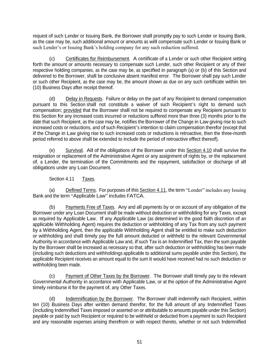 51 request of such Lender or Issuing Bank, the Borrower shall promptly pay to such Lender or Issuing Bank, as the case may be, such additional amount or amounts as will compensate such Lender or Issuing Bank or such Lender’s or Issuing Bank’s holding company for any such reduction suffered. (c) Certificates for Reimbursement. A certificate of a Lender or such other Recipient setting forth the amount or amounts necessary to compensate such Lender, such other Recipient or any of their respective holding companies, as the case may be, as specified in paragraph (a) or (b) of this Section and delivered to the Borrower, shall be conclusive absent manifest error. The Borrower shall pay such Lender or such other Recipient, as the case may be, the amount shown as due on any such certificate within ten (10) Business Days after receipt thereof. (d) Delay in Requests. Failure or delay on the part of any Recipient to demand compensation pursuant to this Section shall not constitute a waiver of such Recipient’s right to demand such compensation; provided that the Borrower shall not be required to compensate any Recipient pursuant to this Section for any increased costs incurred or reductions suffered more than three (3) months prior to the date that such Recipient, as the case may be, notifies the Borrower of the Change in Law giving rise to such increased costs or reductions, and of such Recipient’s intention to claim compensation therefor (except that if the Change in Law giving rise to such increased costs or reductions is retroactive, then the three-month period referred to above shall be extended to include the period of retroactive effect thereof). (e) Survival. All of the obligations of the Borrower under this Section 4.10 shall survive the resignation or replacement of the Administrative Agent or any assignment of rights by, or the replacement of, a Lender, the termination of the Commitments and the repayment, satisfaction or discharge of all obligations under any Loan Document. Section 4.11 Taxes. (a) Defined Terms. For purposes of this Section 4.11, the term “Lender” includes any Issuing Bank and the term “Applicable Law” includes FATCA. (b) Payments Free of Taxes. Any and all payments by or on account of any obligation of the Borrower under any Loan Document shall be made without deduction or withholding for any Taxes, except as required by Applicable Law. If any Applicable Law (as determined in the good faith discretion of an applicable Withholding Agent) requires the deduction or withholding of any Tax from any such payment by a Withholding Agent, then the applicable Withholding Agent shall be entitled to make such deduction or withholding and shall timely pay the full amount deducted or withheld to the relevant Governmental Authority in accordance with Applicable Law and, if such Tax is an Indemnified Tax, then the sum payable by the Borrower shall be increased as necessary so that, after such deduction or withholding has been made (including such deductions and withholdings applicable to additional sums payable under this Section), the applicable Recipient receives an amount equal to the sum it would have received had no such deduction or withholding been made. (c) Payment of Other Taxes by the Borrower. The Borrower shall timely pay to the relevant Governmental Authority in accordance with Applicable Law, or at the option of the Administrative Agent timely reimburse it for the payment of, any Other Taxes. (d) Indemnification by the Borrower. The Borrower shall indemnify each Recipient, within ten (10) Business Days after written demand therefor, for the full amount of any Indemnified Taxes (including Indemnified Taxes imposed or asserted on or attributable to amounts payable under this Section) payable or paid by such Recipient or required to be withheld or deducted from a payment to such Recipient and any reasonable expenses arising therefrom or with respect thereto, whether or not such Indemnified