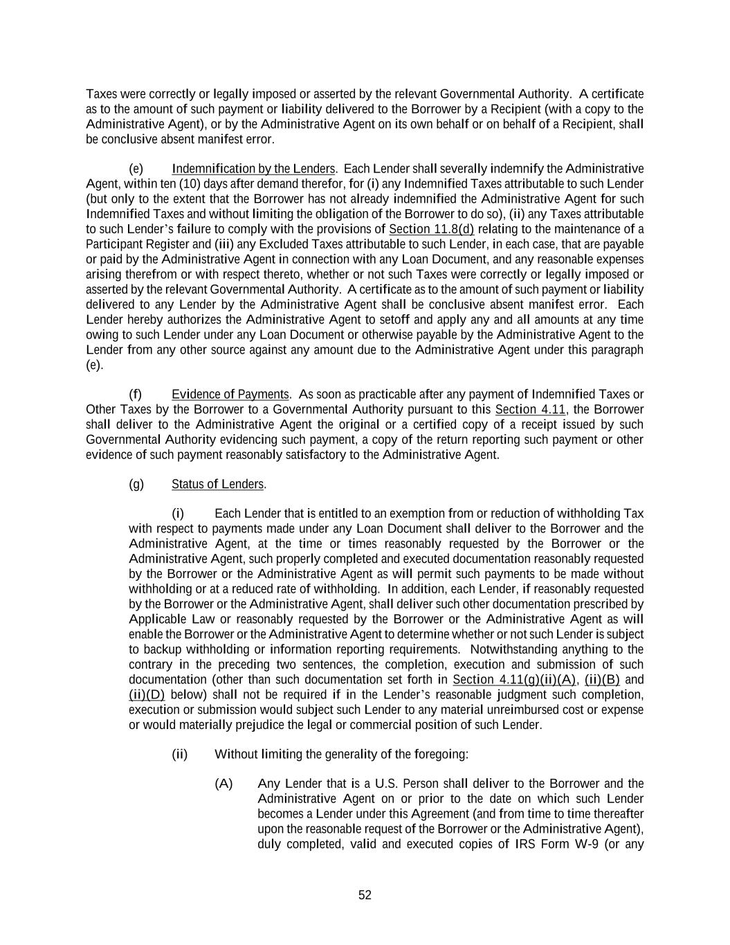 52 Taxes were correctly or legally imposed or asserted by the relevant Governmental Authority. A certificate as to the amount of such payment or liability delivered to the Borrower by a Recipient (with a copy to the Administrative Agent), or by the Administrative Agent on its own behalf or on behalf of a Recipient, shall be conclusive absent manifest error. (e) Indemnification by the Lenders. Each Lender shall severally indemnify the Administrative Agent, within ten (10) days after demand therefor, for (i) any Indemnified Taxes attributable to such Lender (but only to the extent that the Borrower has not already indemnified the Administrative Agent for such Indemnified Taxes and without limiting the obligation of the Borrower to do so), (ii) any Taxes attributable to such Lender’s failure to comply with the provisions of Section 11.8(d) relating to the maintenance of a Participant Register and (iii) any Excluded Taxes attributable to such Lender, in each case, that are payable or paid by the Administrative Agent in connection with any Loan Document, and any reasonable expenses arising therefrom or with respect thereto, whether or not such Taxes were correctly or legally imposed or asserted by the relevant Governmental Authority. A certificate as to the amount of such payment or liability delivered to any Lender by the Administrative Agent shall be conclusive absent manifest error. Each Lender hereby authorizes the Administrative Agent to setoff and apply any and all amounts at any time owing to such Lender under any Loan Document or otherwise payable by the Administrative Agent to the Lender from any other source against any amount due to the Administrative Agent under this paragraph (e). (f) Evidence of Payments. As soon as practicable after any payment of Indemnified Taxes or Other Taxes by the Borrower to a Governmental Authority pursuant to this Section 4.11, the Borrower shall deliver to the Administrative Agent the original or a certified copy of a receipt issued by such Governmental Authority evidencing such payment, a copy of the return reporting such payment or other evidence of such payment reasonably satisfactory to the Administrative Agent. (g) Status of Lenders. (i) Each Lender that is entitled to an exemption from or reduction of withholding Tax with respect to payments made under any Loan Document shall deliver to the Borrower and the Administrative Agent, at the time or times reasonably requested by the Borrower or the Administrative Agent, such properly completed and executed documentation reasonably requested by the Borrower or the Administrative Agent as will permit such payments to be made without withholding or at a reduced rate of withholding. In addition, each Lender, if reasonably requested by the Borrower or the Administrative Agent, shall deliver such other documentation prescribed by Applicable Law or reasonably requested by the Borrower or the Administrative Agent as will enable the Borrower or the Administrative Agent to determine whether or not such Lender is subject to backup withholding or information reporting requirements. Notwithstanding anything to the contrary in the preceding two sentences, the completion, execution and submission of such documentation (other than such documentation set forth in Section 4.11(g)(ii)(A), (ii)(B) and (ii)(D) below) shall not be required if in the Lender’s reasonable judgment such completion, execution or submission would subject such Lender to any material unreimbursed cost or expense or would materially prejudice the legal or commercial position of such Lender. (ii) Without limiting the generality of the foregoing: (A) Any Lender that is a U.S. Person shall deliver to the Borrower and the Administrative Agent on or prior to the date on which such Lender becomes a Lender under this Agreement (and from time to time thereafter upon the reasonable request of the Borrower or the Administrative Agent), duly completed, valid and executed copies of IRS Form W-9 (or any