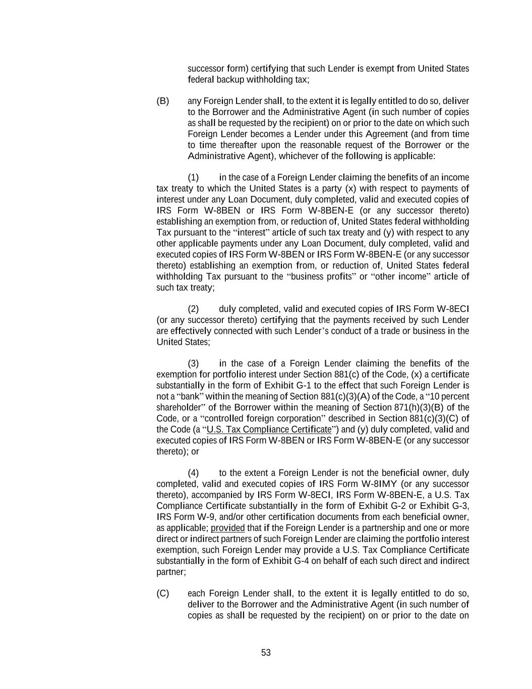 53 successor form) certifying that such Lender is exempt from United States federal backup withholding tax; (B) any Foreign Lender shall, to the extent it is legally entitled to do so, deliver to the Borrower and the Administrative Agent (in such number of copies as shall be requested by the recipient) on or prior to the date on which such Foreign Lender becomes a Lender under this Agreement (and from time to time thereafter upon the reasonable request of the Borrower or the Administrative Agent), whichever of the following is applicable: (1) in the case of a Foreign Lender claiming the benefits of an income tax treaty to which the United States is a party (x) with respect to payments of interest under any Loan Document, duly completed, valid and executed copies of IRS Form W-8BEN or IRS Form W-8BEN-E (or any successor thereto) establishing an exemption from, or reduction of, United States federal withholding Tax pursuant to the “interest” article of such tax treaty and (y) with respect to any other applicable payments under any Loan Document, duly completed, valid and executed copies of IRS Form W-8BEN or IRS Form W-8BEN-E (or any successor thereto) establishing an exemption from, or reduction of, United States federal withholding Tax pursuant to the “business profits” or “other income” article of such tax treaty; (2) duly completed, valid and executed copies of IRS Form W-8ECI (or any successor thereto) certifying that the payments received by such Lender are effectively connected with such Lender’s conduct of a trade or business in the United States; (3) in the case of a Foreign Lender claiming the benefits of the exemption for portfolio interest under Section 881(c) of the Code, (x) a certificate substantially in the form of Exhibit G-1 to the effect that such Foreign Lender is not a “bank” within the meaning of Section 881(c)(3)(A) of the Code, a “10 percent shareholder” of the Borrower within the meaning of Section 871(h)(3)(B) of the Code, or a “controlled foreign corporation” described in Section 881(c)(3)(C) of the Code (a “U.S. Tax Compliance Certificate”) and (y) duly completed, valid and executed copies of IRS Form W-8BEN or IRS Form W-8BEN-E (or any successor thereto); or (4) to the extent a Foreign Lender is not the beneficial owner, duly completed, valid and executed copies of IRS Form W-8IMY (or any successor thereto), accompanied by IRS Form W-8ECI, IRS Form W-8BEN-E, a U.S. Tax Compliance Certificate substantially in the form of Exhibit G-2 or Exhibit G-3, IRS Form W-9, and/or other certification documents from each beneficial owner, as applicable; provided that if the Foreign Lender is a partnership and one or more direct or indirect partners of such Foreign Lender are claiming the portfolio interest exemption, such Foreign Lender may provide a U.S. Tax Compliance Certificate substantially in the form of Exhibit G-4 on behalf of each such direct and indirect partner; (C) each Foreign Lender shall, to the extent it is legally entitled to do so, deliver to the Borrower and the Administrative Agent (in such number of copies as shall be requested by the recipient) on or prior to the date on