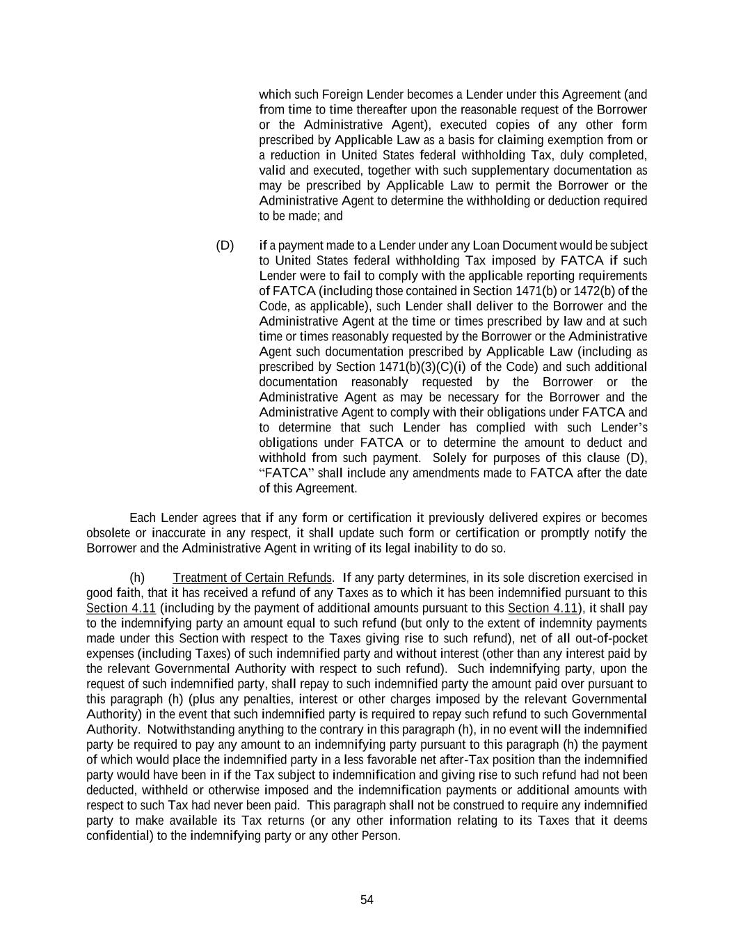 54 which such Foreign Lender becomes a Lender under this Agreement (and from time to time thereafter upon the reasonable request of the Borrower or the Administrative Agent), executed copies of any other form prescribed by Applicable Law as a basis for claiming exemption from or a reduction in United States federal withholding Tax, duly completed, valid and executed, together with such supplementary documentation as may be prescribed by Applicable Law to permit the Borrower or the Administrative Agent to determine the withholding or deduction required to be made; and (D) if a payment made to a Lender under any Loan Document would be subject to United States federal withholding Tax imposed by FATCA if such Lender were to fail to comply with the applicable reporting requirements of FATCA (including those contained in Section 1471(b) or 1472(b) of the Code, as applicable), such Lender shall deliver to the Borrower and the Administrative Agent at the time or times prescribed by law and at such time or times reasonably requested by the Borrower or the Administrative Agent such documentation prescribed by Applicable Law (including as prescribed by Section 1471(b)(3)(C)(i) of the Code) and such additional documentation reasonably requested by the Borrower or the Administrative Agent as may be necessary for the Borrower and the Administrative Agent to comply with their obligations under FATCA and to determine that such Lender has complied with such Lender’s obligations under FATCA or to determine the amount to deduct and withhold from such payment. Solely for purposes of this clause (D), “FATCA” shall include any amendments made to FATCA after the date of this Agreement. Each Lender agrees that if any form or certification it previously delivered expires or becomes obsolete or inaccurate in any respect, it shall update such form or certification or promptly notify the Borrower and the Administrative Agent in writing of its legal inability to do so. (h) Treatment of Certain Refunds. If any party determines, in its sole discretion exercised in good faith, that it has received a refund of any Taxes as to which it has been indemnified pursuant to this Section 4.11 (including by the payment of additional amounts pursuant to this Section 4.11), it shall pay to the indemnifying party an amount equal to such refund (but only to the extent of indemnity payments made under this Section with respect to the Taxes giving rise to such refund), net of all out-of-pocket expenses (including Taxes) of such indemnified party and without interest (other than any interest paid by the relevant Governmental Authority with respect to such refund). Such indemnifying party, upon the request of such indemnified party, shall repay to such indemnified party the amount paid over pursuant to this paragraph (h) (plus any penalties, interest or other charges imposed by the relevant Governmental Authority) in the event that such indemnified party is required to repay such refund to such Governmental Authority. Notwithstanding anything to the contrary in this paragraph (h), in no event will the indemnified party be required to pay any amount to an indemnifying party pursuant to this paragraph (h) the payment of which would place the indemnified party in a less favorable net after-Tax position than the indemnified party would have been in if the Tax subject to indemnification and giving rise to such refund had not been deducted, withheld or otherwise imposed and the indemnification payments or additional amounts with respect to such Tax had never been paid. This paragraph shall not be construed to require any indemnified party to make available its Tax returns (or any other information relating to its Taxes that it deems confidential) to the indemnifying party or any other Person.