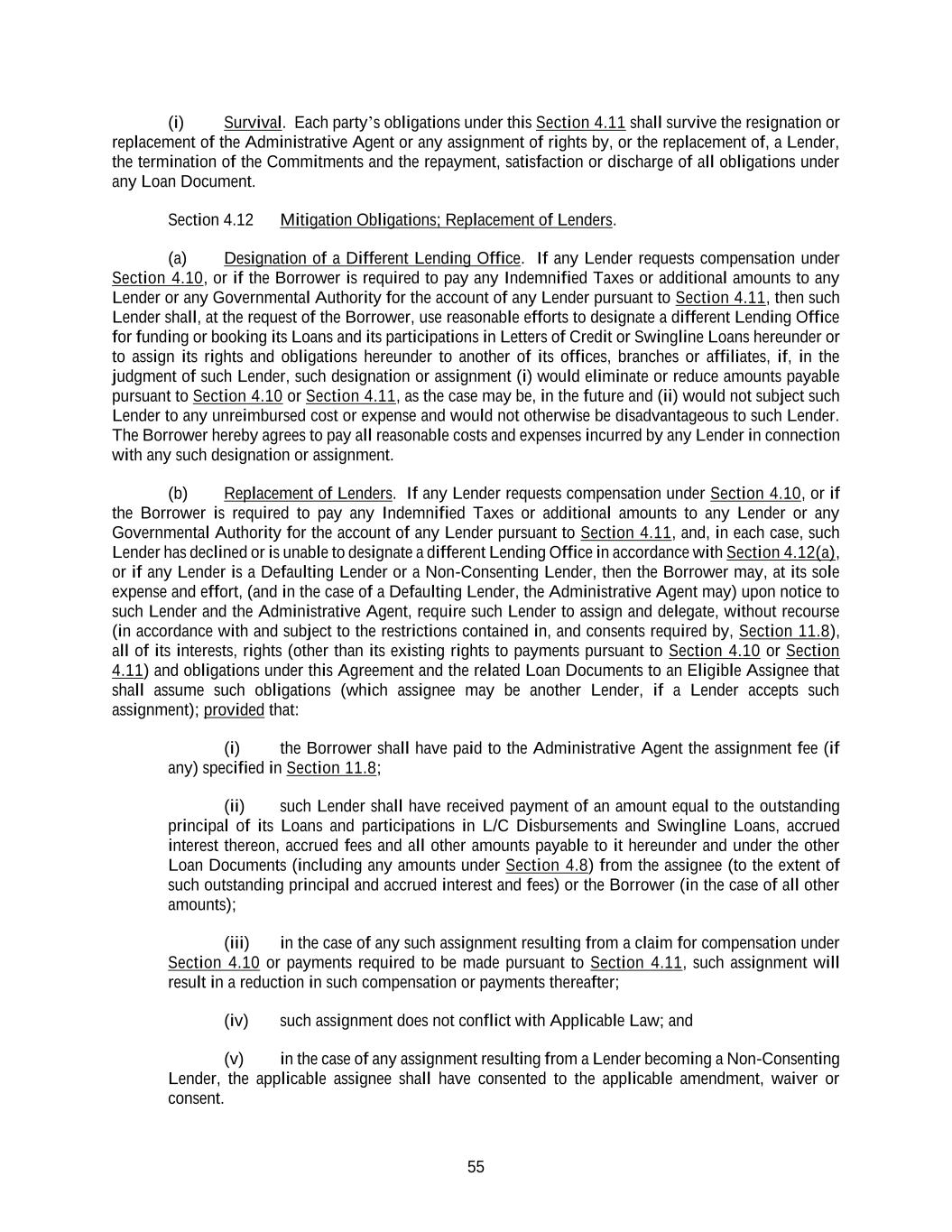 55 (i) Survival. Each party’s obligations under this Section 4.11 shall survive the resignation or replacement of the Administrative Agent or any assignment of rights by, or the replacement of, a Lender, the termination of the Commitments and the repayment, satisfaction or discharge of all obligations under any Loan Document. Section 4.12 Mitigation Obligations; Replacement of Lenders. (a) Designation of a Different Lending Office. If any Lender requests compensation under Section 4.10, or if the Borrower is required to pay any Indemnified Taxes or additional amounts to any Lender or any Governmental Authority for the account of any Lender pursuant to Section 4.11, then such Lender shall, at the request of the Borrower, use reasonable efforts to designate a different Lending Office for funding or booking its Loans and its participations in Letters of Credit or Swingline Loans hereunder or to assign its rights and obligations hereunder to another of its offices, branches or affiliates, if, in the judgment of such Lender, such designation or assignment (i) would eliminate or reduce amounts payable pursuant to Section 4.10 or Section 4.11, as the case may be, in the future and (ii) would not subject such Lender to any unreimbursed cost or expense and would not otherwise be disadvantageous to such Lender. The Borrower hereby agrees to pay all reasonable costs and expenses incurred by any Lender in connection with any such designation or assignment. (b) Replacement of Lenders. If any Lender requests compensation under Section 4.10, or if the Borrower is required to pay any Indemnified Taxes or additional amounts to any Lender or any Governmental Authority for the account of any Lender pursuant to Section 4.11, and, in each case, such Lender has declined or is unable to designate a different Lending Office in accordance with Section 4.12(a), or if any Lender is a Defaulting Lender or a Non-Consenting Lender, then the Borrower may, at its sole expense and effort, (and in the case of a Defaulting Lender, the Administrative Agent may) upon notice to such Lender and the Administrative Agent, require such Lender to assign and delegate, without recourse (in accordance with and subject to the restrictions contained in, and consents required by, Section 11.8), all of its interests, rights (other than its existing rights to payments pursuant to Section 4.10 or Section 4.11) and obligations under this Agreement and the related Loan Documents to an Eligible Assignee that shall assume such obligations (which assignee may be another Lender, if a Lender accepts such assignment); provided that: (i) the Borrower shall have paid to the Administrative Agent the assignment fee (if any) specified in Section 11.8; (ii) such Lender shall have received payment of an amount equal to the outstanding principal of its Loans and participations in L/C Disbursements and Swingline Loans, accrued interest thereon, accrued fees and all other amounts payable to it hereunder and under the other Loan Documents (including any amounts under Section 4.8) from the assignee (to the extent of such outstanding principal and accrued interest and fees) or the Borrower (in the case of all other amounts); (iii) in the case of any such assignment resulting from a claim for compensation under Section 4.10 or payments required to be made pursuant to Section 4.11, such assignment will result in a reduction in such compensation or payments thereafter; (iv) such assignment does not conflict with Applicable Law; and (v) in the case of any assignment resulting from a Lender becoming a Non-Consenting Lender, the applicable assignee shall have consented to the applicable amendment, waiver or consent.