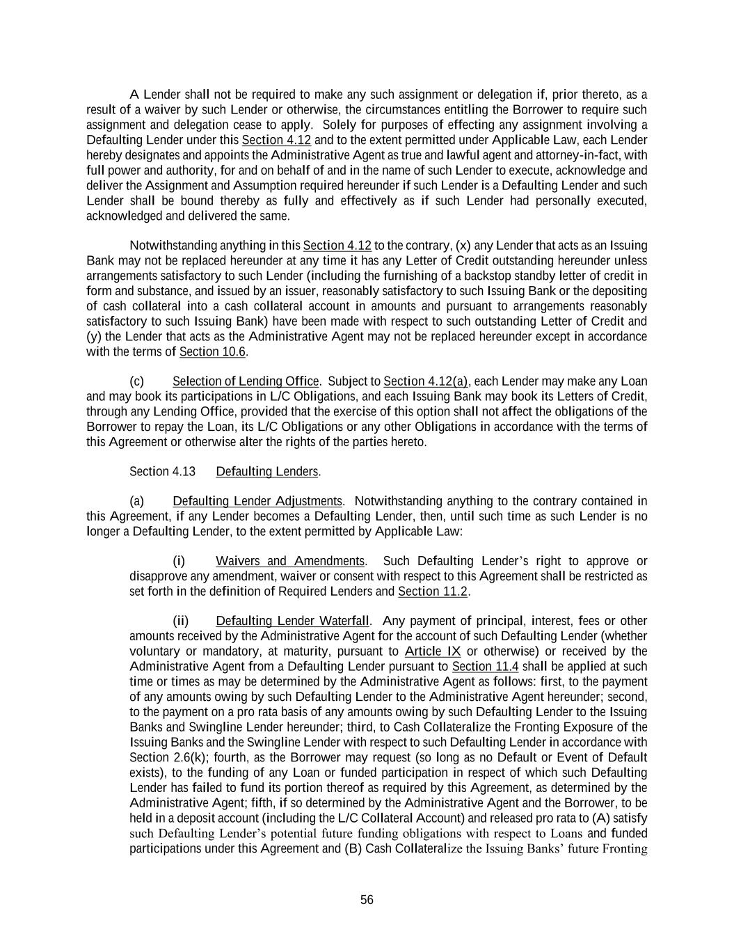 56 A Lender shall not be required to make any such assignment or delegation if, prior thereto, as a result of a waiver by such Lender or otherwise, the circumstances entitling the Borrower to require such assignment and delegation cease to apply. Solely for purposes of effecting any assignment involving a Defaulting Lender under this Section 4.12 and to the extent permitted under Applicable Law, each Lender hereby designates and appoints the Administrative Agent as true and lawful agent and attorney-in-fact, with full power and authority, for and on behalf of and in the name of such Lender to execute, acknowledge and deliver the Assignment and Assumption required hereunder if such Lender is a Defaulting Lender and such Lender shall be bound thereby as fully and effectively as if such Lender had personally executed, acknowledged and delivered the same. Notwithstanding anything in this Section 4.12 to the contrary, (x) any Lender that acts as an Issuing Bank may not be replaced hereunder at any time it has any Letter of Credit outstanding hereunder unless arrangements satisfactory to such Lender (including the furnishing of a backstop standby letter of credit in form and substance, and issued by an issuer, reasonably satisfactory to such Issuing Bank or the depositing of cash collateral into a cash collateral account in amounts and pursuant to arrangements reasonably satisfactory to such Issuing Bank) have been made with respect to such outstanding Letter of Credit and (y) the Lender that acts as the Administrative Agent may not be replaced hereunder except in accordance with the terms of Section 10.6. (c) Selection of Lending Office. Subject to Section 4.12(a), each Lender may make any Loan and may book its participations in L/C Obligations, and each Issuing Bank may book its Letters of Credit, through any Lending Office, provided that the exercise of this option shall not affect the obligations of the Borrower to repay the Loan, its L/C Obligations or any other Obligations in accordance with the terms of this Agreement or otherwise alter the rights of the parties hereto. Section 4.13 Defaulting Lenders. (a) Defaulting Lender Adjustments. Notwithstanding anything to the contrary contained in this Agreement, if any Lender becomes a Defaulting Lender, then, until such time as such Lender is no longer a Defaulting Lender, to the extent permitted by Applicable Law: (i) Waivers and Amendments. Such Defaulting Lender’s right to approve or disapprove any amendment, waiver or consent with respect to this Agreement shall be restricted as set forth in the definition of Required Lenders and Section 11.2. (ii) Defaulting Lender Waterfall. Any payment of principal, interest, fees or other amounts received by the Administrative Agent for the account of such Defaulting Lender (whether voluntary or mandatory, at maturity, pursuant to Article IX or otherwise) or received by the Administrative Agent from a Defaulting Lender pursuant to Section 11.4 shall be applied at such time or times as may be determined by the Administrative Agent as follows: first, to the payment of any amounts owing by such Defaulting Lender to the Administrative Agent hereunder; second, to the payment on a pro rata basis of any amounts owing by such Defaulting Lender to the Issuing Banks and Swingline Lender hereunder; third, to Cash Collateralize the Fronting Exposure of the Issuing Banks and the Swingline Lender with respect to such Defaulting Lender in accordance with Section 2.6(k); fourth, as the Borrower may request (so long as no Default or Event of Default exists), to the funding of any Loan or funded participation in respect of which such Defaulting Lender has failed to fund its portion thereof as required by this Agreement, as determined by the Administrative Agent; fifth, if so determined by the Administrative Agent and the Borrower, to be held in a deposit account (including the L/C Collateral Account) and released pro rata to (A) satisfy such Defaulting Lender’s potential future funding obligations with respect to Loans and funded participations under this Agreement and (B) Cash Collateralize the Issuing Banks’ future Fronting