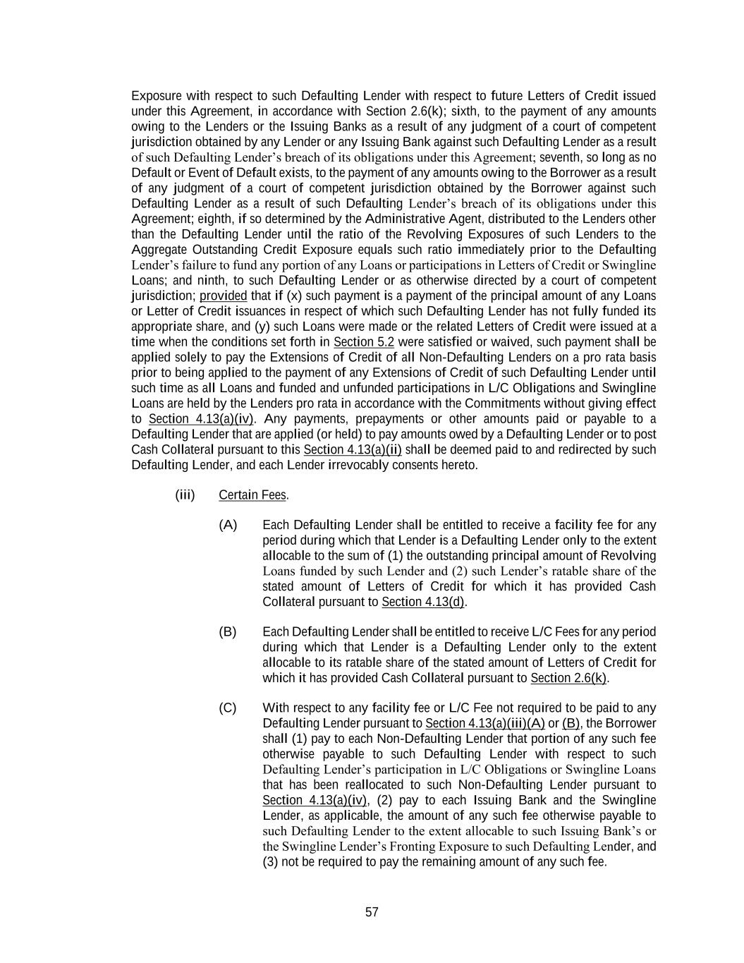 57 Exposure with respect to such Defaulting Lender with respect to future Letters of Credit issued under this Agreement, in accordance with Section 2.6(k); sixth, to the payment of any amounts owing to the Lenders or the Issuing Banks as a result of any judgment of a court of competent jurisdiction obtained by any Lender or any Issuing Bank against such Defaulting Lender as a result of such Defaulting Lender’s breach of its obligations under this Agreement; seventh, so long as no Default or Event of Default exists, to the payment of any amounts owing to the Borrower as a result of any judgment of a court of competent jurisdiction obtained by the Borrower against such Defaulting Lender as a result of such Defaulting Lender’s breach of its obligations under this Agreement; eighth, if so determined by the Administrative Agent, distributed to the Lenders other than the Defaulting Lender until the ratio of the Revolving Exposures of such Lenders to the Aggregate Outstanding Credit Exposure equals such ratio immediately prior to the Defaulting Lender’s failure to fund any portion of any Loans or participations in Letters of Credit or Swingline Loans; and ninth, to such Defaulting Lender or as otherwise directed by a court of competent jurisdiction; provided that if (x) such payment is a payment of the principal amount of any Loans or Letter of Credit issuances in respect of which such Defaulting Lender has not fully funded its appropriate share, and (y) such Loans were made or the related Letters of Credit were issued at a time when the conditions set forth in Section 5.2 were satisfied or waived, such payment shall be applied solely to pay the Extensions of Credit of all Non-Defaulting Lenders on a pro rata basis prior to being applied to the payment of any Extensions of Credit of such Defaulting Lender until such time as all Loans and funded and unfunded participations in L/C Obligations and Swingline Loans are held by the Lenders pro rata in accordance with the Commitments without giving effect to Section 4.13(a)(iv). Any payments, prepayments or other amounts paid or payable to a Defaulting Lender that are applied (or held) to pay amounts owed by a Defaulting Lender or to post Cash Collateral pursuant to this Section 4.13(a)(ii) shall be deemed paid to and redirected by such Defaulting Lender, and each Lender irrevocably consents hereto. (iii) Certain Fees. (A) Each Defaulting Lender shall be entitled to receive a facility fee for any period during which that Lender is a Defaulting Lender only to the extent allocable to the sum of (1) the outstanding principal amount of Revolving Loans funded by such Lender and (2) such Lender’s ratable share of the stated amount of Letters of Credit for which it has provided Cash Collateral pursuant to Section 4.13(d). (B) Each Defaulting Lender shall be entitled to receive L/C Fees for any period during which that Lender is a Defaulting Lender only to the extent allocable to its ratable share of the stated amount of Letters of Credit for which it has provided Cash Collateral pursuant to Section 2.6(k). (C) With respect to any facility fee or L/C Fee not required to be paid to any Defaulting Lender pursuant to Section 4.13(a)(iii)(A) or (B), the Borrower shall (1) pay to each Non-Defaulting Lender that portion of any such fee otherwise payable to such Defaulting Lender with respect to such Defaulting Lender’s participation in L/C Obligations or Swingline Loans that has been reallocated to such Non-Defaulting Lender pursuant to Section 4.13(a)(iv), (2) pay to each Issuing Bank and the Swingline Lender, as applicable, the amount of any such fee otherwise payable to such Defaulting Lender to the extent allocable to such Issuing Bank’s or the Swingline Lender’s Fronting Exposure to such Defaulting Lender, and (3) not be required to pay the remaining amount of any such fee.