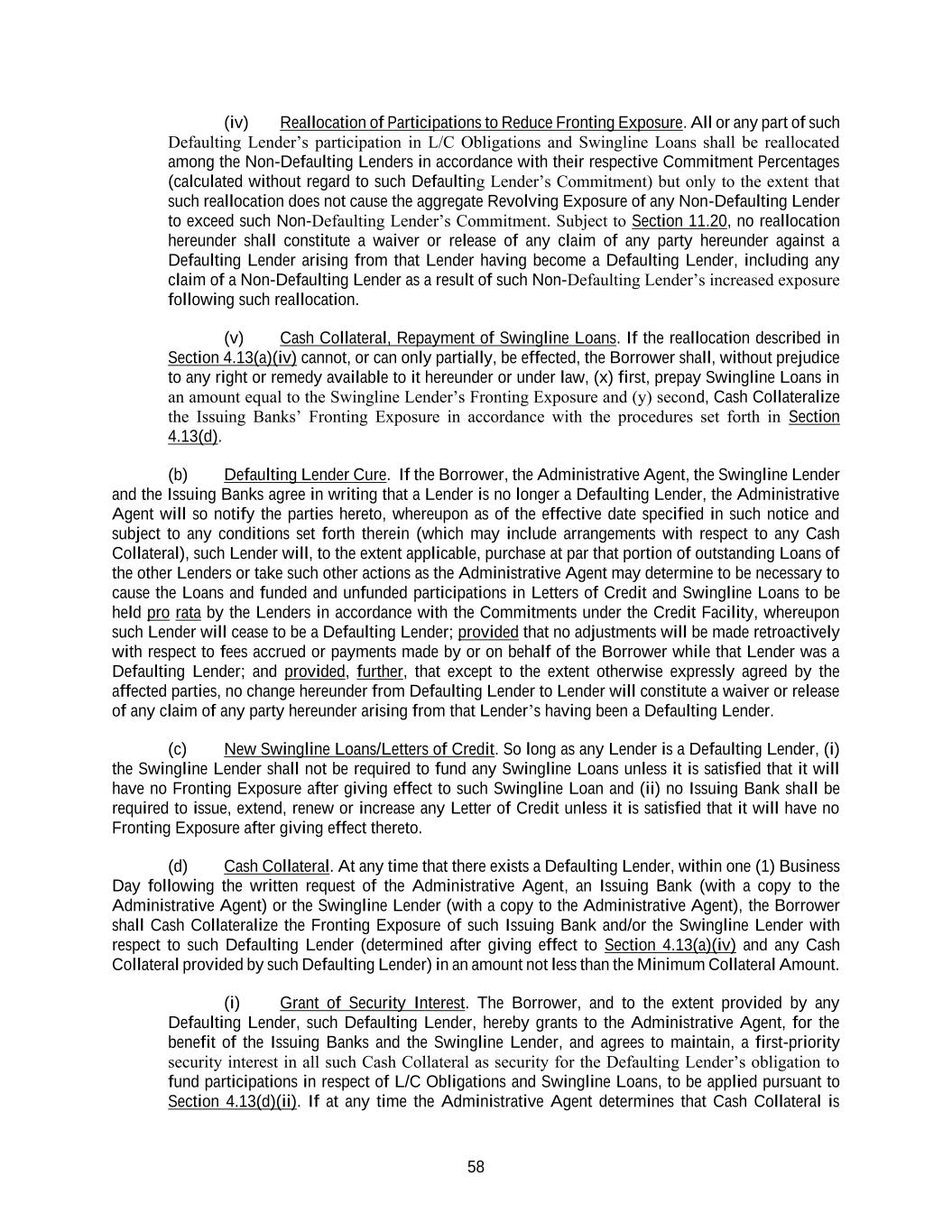 58 (iv) Reallocation of Participations to Reduce Fronting Exposure. All or any part of such Defaulting Lender’s participation in L/C Obligations and Swingline Loans shall be reallocated among the Non-Defaulting Lenders in accordance with their respective Commitment Percentages (calculated without regard to such Defaulting Lender’s Commitment) but only to the extent that such reallocation does not cause the aggregate Revolving Exposure of any Non-Defaulting Lender to exceed such Non-Defaulting Lender’s Commitment. Subject to Section 11.20, no reallocation hereunder shall constitute a waiver or release of any claim of any party hereunder against a Defaulting Lender arising from that Lender having become a Defaulting Lender, including any claim of a Non-Defaulting Lender as a result of such Non-Defaulting Lender’s increased exposure following such reallocation. (v) Cash Collateral, Repayment of Swingline Loans. If the reallocation described in Section 4.13(a)(iv) cannot, or can only partially, be effected, the Borrower shall, without prejudice to any right or remedy available to it hereunder or under law, (x) first, prepay Swingline Loans in an amount equal to the Swingline Lender’s Fronting Exposure and (y) second, Cash Collateralize the Issuing Banks’ Fronting Exposure in accordance with the procedures set forth in Section 4.13(d). (b) Defaulting Lender Cure. If the Borrower, the Administrative Agent, the Swingline Lender and the Issuing Banks agree in writing that a Lender is no longer a Defaulting Lender, the Administrative Agent will so notify the parties hereto, whereupon as of the effective date specified in such notice and subject to any conditions set forth therein (which may include arrangements with respect to any Cash Collateral), such Lender will, to the extent applicable, purchase at par that portion of outstanding Loans of the other Lenders or take such other actions as the Administrative Agent may determine to be necessary to cause the Loans and funded and unfunded participations in Letters of Credit and Swingline Loans to be held pro rata by the Lenders in accordance with the Commitments under the Credit Facility, whereupon such Lender will cease to be a Defaulting Lender; provided that no adjustments will be made retroactively with respect to fees accrued or payments made by or on behalf of the Borrower while that Lender was a Defaulting Lender; and provided, further, that except to the extent otherwise expressly agreed by the affected parties, no change hereunder from Defaulting Lender to Lender will constitute a waiver or release of any claim of any party hereunder arising from that Lender’s having been a Defaulting Lender. (c) New Swingline Loans/Letters of Credit. So long as any Lender is a Defaulting Lender, (i) the Swingline Lender shall not be required to fund any Swingline Loans unless it is satisfied that it will have no Fronting Exposure after giving effect to such Swingline Loan and (ii) no Issuing Bank shall be required to issue, extend, renew or increase any Letter of Credit unless it is satisfied that it will have no Fronting Exposure after giving effect thereto. (d) Cash Collateral. At any time that there exists a Defaulting Lender, within one (1) Business Day following the written request of the Administrative Agent, an Issuing Bank (with a copy to the Administrative Agent) or the Swingline Lender (with a copy to the Administrative Agent), the Borrower shall Cash Collateralize the Fronting Exposure of such Issuing Bank and/or the Swingline Lender with respect to such Defaulting Lender (determined after giving effect to Section 4.13(a)(iv) and any Cash Collateral provided by such Defaulting Lender) in an amount not less than the Minimum Collateral Amount. (i) Grant of Security Interest. The Borrower, and to the extent provided by any Defaulting Lender, such Defaulting Lender, hereby grants to the Administrative Agent, for the benefit of the Issuing Banks and the Swingline Lender, and agrees to maintain, a first-priority security interest in all such Cash Collateral as security for the Defaulting Lender’s obligation to fund participations in respect of L/C Obligations and Swingline Loans, to be applied pursuant to Section 4.13(d)(ii). If at any time the Administrative Agent determines that Cash Collateral is