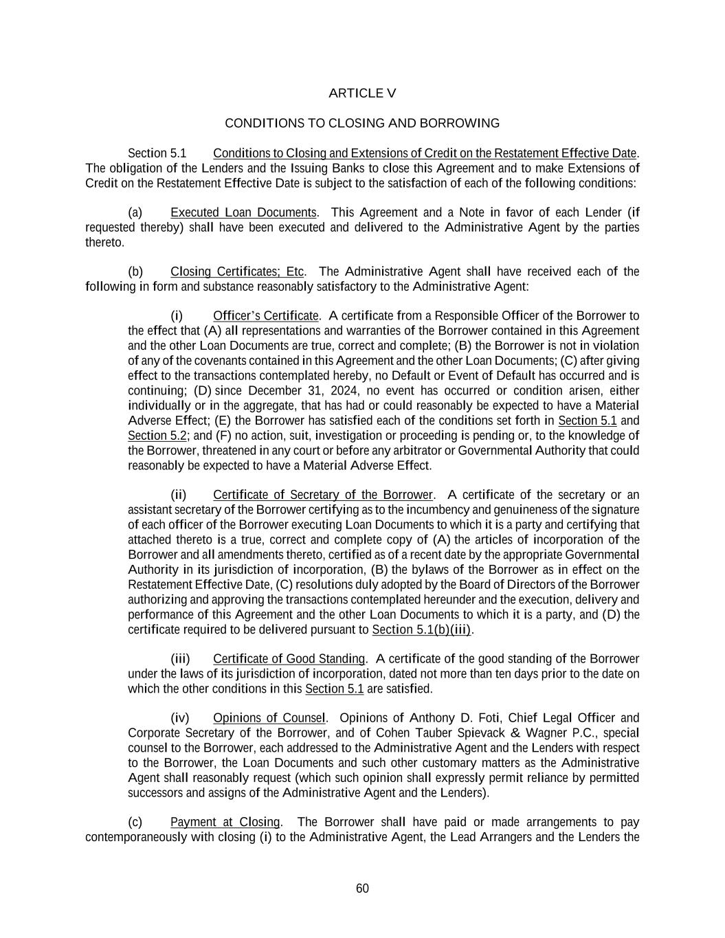 60 ARTICLE V CONDITIONS TO CLOSING AND BORROWING Section 5.1 Conditions to Closing and Extensions of Credit on the Restatement Effective Date. The obligation of the Lenders and the Issuing Banks to close this Agreement and to make Extensions of Credit on the Restatement Effective Date is subject to the satisfaction of each of the following conditions: (a) Executed Loan Documents. This Agreement and a Note in favor of each Lender (if requested thereby) shall have been executed and delivered to the Administrative Agent by the parties thereto. (b) Closing Certificates; Etc. The Administrative Agent shall have received each of the following in form and substance reasonably satisfactory to the Administrative Agent: (i) Officer’s Certificate. A certificate from a Responsible Officer of the Borrower to the effect that (A) all representations and warranties of the Borrower contained in this Agreement and the other Loan Documents are true, correct and complete; (B) the Borrower is not in violation of any of the covenants contained in this Agreement and the other Loan Documents; (C) after giving effect to the transactions contemplated hereby, no Default or Event of Default has occurred and is continuing; (D) since December 31, 2024, no event has occurred or condition arisen, either individually or in the aggregate, that has had or could reasonably be expected to have a Material Adverse Effect; (E) the Borrower has satisfied each of the conditions set forth in Section 5.1 and Section 5.2; and (F) no action, suit, investigation or proceeding is pending or, to the knowledge of the Borrower, threatened in any court or before any arbitrator or Governmental Authority that could reasonably be expected to have a Material Adverse Effect. (ii) Certificate of Secretary of the Borrower. A certificate of the secretary or an assistant secretary of the Borrower certifying as to the incumbency and genuineness of the signature of each officer of the Borrower executing Loan Documents to which it is a party and certifying that attached thereto is a true, correct and complete copy of (A) the articles of incorporation of the Borrower and all amendments thereto, certified as of a recent date by the appropriate Governmental Authority in its jurisdiction of incorporation, (B) the bylaws of the Borrower as in effect on the Restatement Effective Date, (C) resolutions duly adopted by the Board of Directors of the Borrower authorizing and approving the transactions contemplated hereunder and the execution, delivery and performance of this Agreement and the other Loan Documents to which it is a party, and (D) the certificate required to be delivered pursuant to Section 5.1(b)(iii). (iii) Certificate of Good Standing. A certificate of the good standing of the Borrower under the laws of its jurisdiction of incorporation, dated not more than ten days prior to the date on which the other conditions in this Section 5.1 are satisfied. (iv) Opinions of Counsel. Opinions of Anthony D. Foti, Chief Legal Officer and Corporate Secretary of the Borrower, and of Cohen Tauber Spievack & Wagner P.C., special counsel to the Borrower, each addressed to the Administrative Agent and the Lenders with respect to the Borrower, the Loan Documents and such other customary matters as the Administrative Agent shall reasonably request (which such opinion shall expressly permit reliance by permitted successors and assigns of the Administrative Agent and the Lenders). (c) Payment at Closing. The Borrower shall have paid or made arrangements to pay contemporaneously with closing (i) to the Administrative Agent, the Lead Arrangers and the Lenders the