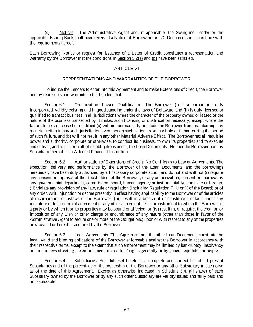 62 (c) Notices. The Administrative Agent and, if applicable, the Swingline Lender or the applicable Issuing Bank shall have received a Notice of Borrowing or L/C Documents in accordance with the requirements hereof. Each Borrowing Notice or request for issuance of a Letter of Credit constitutes a representation and warranty by the Borrower that the conditions in Section 5.2(a) and (b) have been satisfied. ARTICLE VI REPRESENTATIONS AND WARRANTIES OF THE BORROWER To induce the Lenders to enter into this Agreement and to make Extensions of Credit, the Borrower hereby represents and warrants to the Lenders that: Section 6.1 Organization; Power; Qualification. The Borrower (i) is a corporation duly incorporated, validly existing and in good standing under the laws of Delaware, and (ii) is duly licensed or qualified to transact business in all jurisdictions where the character of the property owned or leased or the nature of the business transacted by it makes such licensing or qualification necessary, except where the failure to be so licensed or qualified (a) will not permanently preclude the Borrower from maintaining any material action in any such jurisdiction even though such action arose in whole or in part during the period of such failure, and (b) will not result in any other Material Adverse Effect. The Borrower has all requisite power and authority, corporate or otherwise, to conduct its business, to own its properties and to execute and deliver, and to perform all of its obligations under, the Loan Documents. Neither the Borrower nor any Subsidiary thereof is an Affected Financial Institution. Section 6.2 Authorization of Extensions of Credit; No Conflict as to Law or Agreements. The execution, delivery and performance by the Borrower of the Loan Documents, and the borrowings hereunder, have been duly authorized by all necessary corporate action and do not and will not (i) require any consent or approval of the stockholders of the Borrower, or any authorization, consent or approval by any governmental department, commission, board, bureau, agency or instrumentality, domestic or foreign, (ii) violate any provision of any law, rule or regulation (including Regulation T, U or X of the Board) or of any order, writ, injunction or decree presently in effect having applicability to the Borrower or of the articles of incorporation or bylaws of the Borrower, (iii) result in a breach of or constitute a default under any indenture or loan or credit agreement or any other agreement, lease or instrument to which the Borrower is a party or by which it or its properties may be bound or affected, or (iv) result in, or require, the creation or imposition of any Lien or other charge or encumbrance of any nature (other than those in favor of the Administrative Agent to secure one or more of the Obligations) upon or with respect to any of the properties now owned or hereafter acquired by the Borrower. Section 6.3 Legal Agreements. This Agreement and the other Loan Documents constitute the legal, valid and binding obligations of the Borrower enforceable against the Borrower in accordance with their respective terms, except to the extent that such enforcement may be limited by bankruptcy, insolvency or similar laws affecting the enforcement of creditors’ rights generally or by general equitable principles. Section 6.4 Subsidiaries. Schedule 6.4 hereto is a complete and correct list of all present Subsidiaries and of the percentage of the ownership of the Borrower or any other Subsidiary in each case as of the date of this Agreement. Except as otherwise indicated in Schedule 6.4, all shares of each Subsidiary owned by the Borrower or by any such other Subsidiary are validly issued and fully paid and nonassessable.