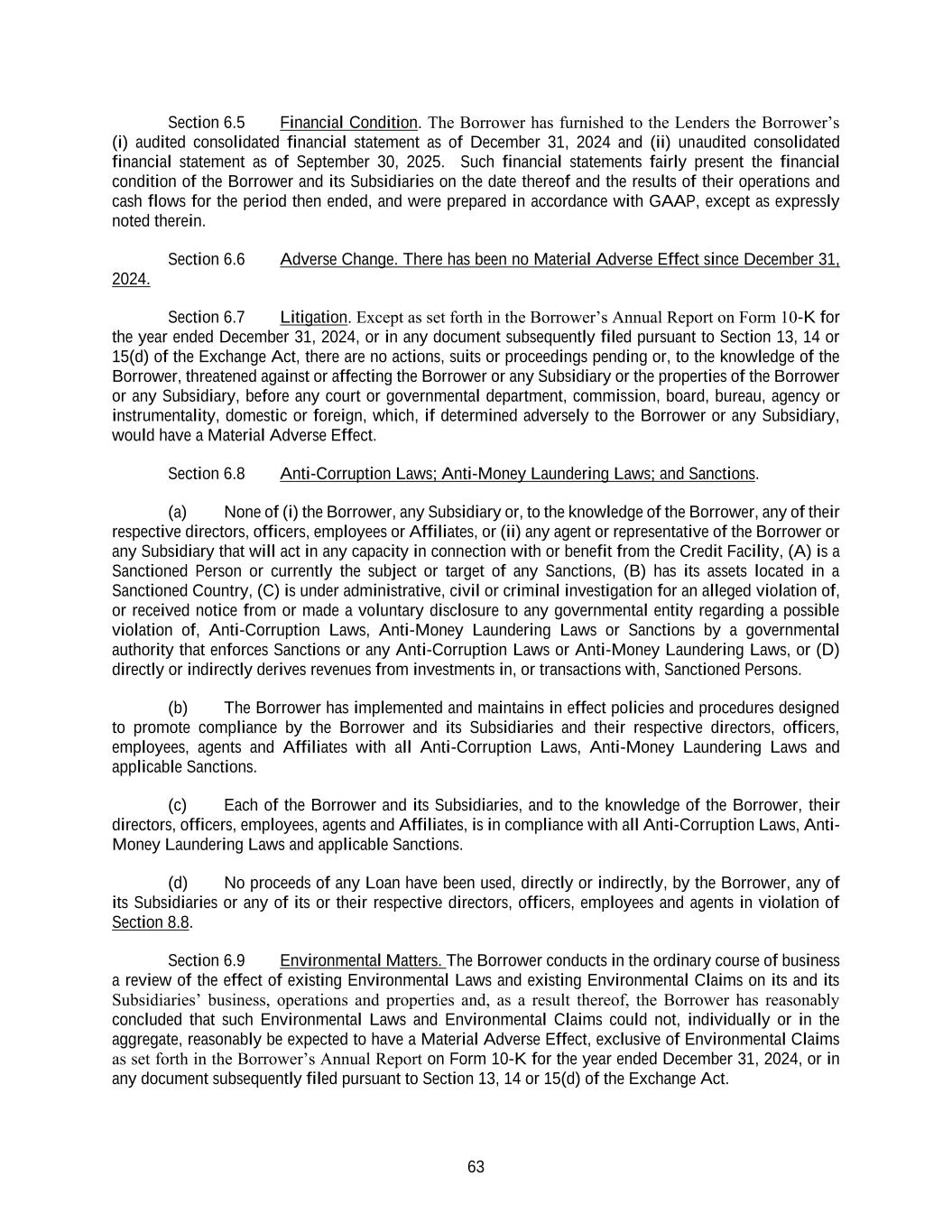 63 Section 6.5 Financial Condition. The Borrower has furnished to the Lenders the Borrower’s (i) audited consolidated financial statement as of December 31, 2024 and (ii) unaudited consolidated financial statement as of September 30, 2025. Such financial statements fairly present the financial condition of the Borrower and its Subsidiaries on the date thereof and the results of their operations and cash flows for the period then ended, and were prepared in accordance with GAAP, except as expressly noted therein. Section 6.6 Adverse Change. There has been no Material Adverse Effect since December 31, 2024. Section 6.7 Litigation. Except as set forth in the Borrower’s Annual Report on Form 10-K for the year ended December 31, 2024, or in any document subsequently filed pursuant to Section 13, 14 or 15(d) of the Exchange Act, there are no actions, suits or proceedings pending or, to the knowledge of the Borrower, threatened against or affecting the Borrower or any Subsidiary or the properties of the Borrower or any Subsidiary, before any court or governmental department, commission, board, bureau, agency or instrumentality, domestic or foreign, which, if determined adversely to the Borrower or any Subsidiary, would have a Material Adverse Effect. Section 6.8 Anti-Corruption Laws; Anti-Money Laundering Laws; and Sanctions. (a) None of (i) the Borrower, any Subsidiary or, to the knowledge of the Borrower, any of their respective directors, officers, employees or Affiliates, or (ii) any agent or representative of the Borrower or any Subsidiary that will act in any capacity in connection with or benefit from the Credit Facility, (A) is a Sanctioned Person or currently the subject or target of any Sanctions, (B) has its assets located in a Sanctioned Country, (C) is under administrative, civil or criminal investigation for an alleged violation of, or received notice from or made a voluntary disclosure to any governmental entity regarding a possible violation of, Anti-Corruption Laws, Anti-Money Laundering Laws or Sanctions by a governmental authority that enforces Sanctions or any Anti-Corruption Laws or Anti-Money Laundering Laws, or (D) directly or indirectly derives revenues from investments in, or transactions with, Sanctioned Persons. (b) The Borrower has implemented and maintains in effect policies and procedures designed to promote compliance by the Borrower and its Subsidiaries and their respective directors, officers, employees, agents and Affiliates with all Anti-Corruption Laws, Anti-Money Laundering Laws and applicable Sanctions. (c) Each of the Borrower and its Subsidiaries, and to the knowledge of the Borrower, their directors, officers, employees, agents and Affiliates, is in compliance with all Anti-Corruption Laws, Anti- Money Laundering Laws and applicable Sanctions. (d) No proceeds of any Loan have been used, directly or indirectly, by the Borrower, any of its Subsidiaries or any of its or their respective directors, officers, employees and agents in violation of Section 8.8. Section 6.9 Environmental Matters. The Borrower conducts in the ordinary course of business a review of the effect of existing Environmental Laws and existing Environmental Claims on its and its Subsidiaries’ business, operations and properties and, as a result thereof, the Borrower has reasonably concluded that such Environmental Laws and Environmental Claims could not, individually or in the aggregate, reasonably be expected to have a Material Adverse Effect, exclusive of Environmental Claims as set forth in the Borrower’s Annual Report on Form 10-K for the year ended December 31, 2024, or in any document subsequently filed pursuant to Section 13, 14 or 15(d) of the Exchange Act.
