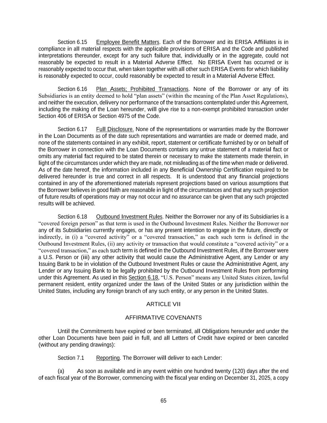 65 Section 6.15 Employee Benefit Matters. Each of the Borrower and its ERISA Affiliates is in compliance in all material respects with the applicable provisions of ERISA and the Code and published interpretations thereunder, except for any such failure that, individually or in the aggregate, could not reasonably be expected to result in a Material Adverse Effect. No ERISA Event has occurred or is reasonably expected to occur that, when taken together with all other such ERISA Events for which liability is reasonably expected to occur, could reasonably be expected to result in a Material Adverse Effect. Section 6.16 Plan Assets; Prohibited Transactions. None of the Borrower or any of its Subsidiaries is an entity deemed to hold “plan assets” (within the meaning of the Plan Asset Regulations), and neither the execution, delivery nor performance of the transactions contemplated under this Agreement, including the making of the Loan hereunder, will give rise to a non-exempt prohibited transaction under Section 406 of ERISA or Section 4975 of the Code. Section 6.17 Full Disclosure. None of the representations or warranties made by the Borrower in the Loan Documents as of the date such representations and warranties are made or deemed made, and none of the statements contained in any exhibit, report, statement or certificate furnished by or on behalf of the Borrower in connection with the Loan Documents contains any untrue statement of a material fact or omits any material fact required to be stated therein or necessary to make the statements made therein, in light of the circumstances under which they are made, not misleading as of the time when made or delivered. As of the date hereof, the information included in any Beneficial Ownership Certification required to be delivered hereunder is true and correct in all respects. It is understood that any financial projections contained in any of the aforementioned materials represent projections based on various assumptions that the Borrower believes in good faith are reasonable in light of the circumstances and that any such projection of future results of operations may or may not occur and no assurance can be given that any such projected results will be achieved. Section 6.18 Outbound Investment Rules. Neither the Borrower nor any of its Subsidiaries is a “covered foreign person” as that term is used in the Outbound Investment Rules. Neither the Borrower nor any of its Subsidiaries currently engages, or has any present intention to engage in the future, directly or indirectly, in (i) a “covered activity” or a “covered transaction,” as each such term is defined in the Outbound Investment Rules, (ii) any activity or transaction that would constitute a “covered activity” or a “covered transaction,” as each such term is defined in the Outbound Investment Rules, if the Borrower were a U.S. Person or (iii) any other activity that would cause the Administrative Agent, any Lender or any Issuing Bank to be in violation of the Outbound Investment Rules or cause the Administrative Agent, any Lender or any Issuing Bank to be legally prohibited by the Outbound Investment Rules from performing under this Agreement. As used in this Section 6.18, “U.S. Person” means any United States citizen, lawful permanent resident, entity organized under the laws of the United States or any jurisdiction within the United States, including any foreign branch of any such entity, or any person in the United States. ARTICLE VII AFFIRMATIVE COVENANTS Until the Commitments have expired or been terminated, all Obligations hereunder and under the other Loan Documents have been paid in full, and all Letters of Credit have expired or been canceled (without any pending drawings): Section 7.1 Reporting. The Borrower will deliver to each Lender: (a) As soon as available and in any event within one hundred twenty (120) days after the end of each fiscal year of the Borrower, commencing with the fiscal year ending on December 31, 2025, a copy