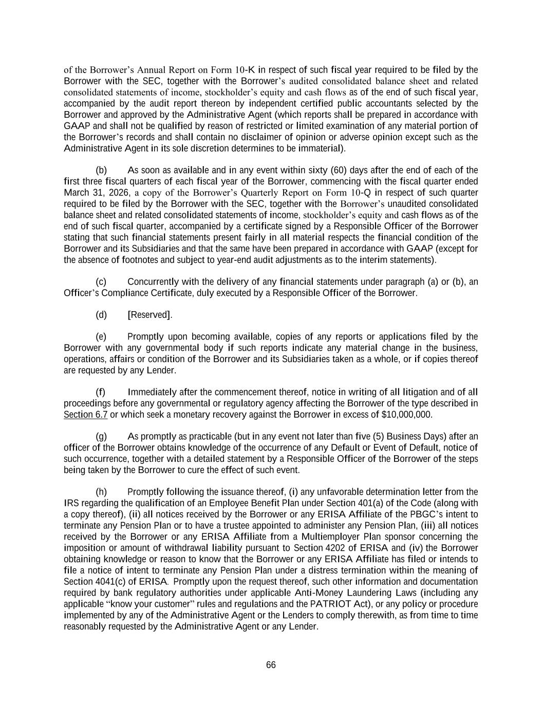 66 of the Borrower’s Annual Report on Form 10-K in respect of such fiscal year required to be filed by the Borrower with the SEC, together with the Borrower’s audited consolidated balance sheet and related consolidated statements of income, stockholder’s equity and cash flows as of the end of such fiscal year, accompanied by the audit report thereon by independent certified public accountants selected by the Borrower and approved by the Administrative Agent (which reports shall be prepared in accordance with GAAP and shall not be qualified by reason of restricted or limited examination of any material portion of the Borrower’s records and shall contain no disclaimer of opinion or adverse opinion except such as the Administrative Agent in its sole discretion determines to be immaterial). (b) As soon as available and in any event within sixty (60) days after the end of each of the first three fiscal quarters of each fiscal year of the Borrower, commencing with the fiscal quarter ended March 31, 2026, a copy of the Borrower’s Quarterly Report on Form 10-Q in respect of such quarter required to be filed by the Borrower with the SEC, together with the Borrower’s unaudited consolidated balance sheet and related consolidated statements of income, stockholder’s equity and cash flows as of the end of such fiscal quarter, accompanied by a certificate signed by a Responsible Officer of the Borrower stating that such financial statements present fairly in all material respects the financial condition of the Borrower and its Subsidiaries and that the same have been prepared in accordance with GAAP (except for the absence of footnotes and subject to year-end audit adjustments as to the interim statements). (c) Concurrently with the delivery of any financial statements under paragraph (a) or (b), an Officer’s Compliance Certificate, duly executed by a Responsible Officer of the Borrower. (d) [Reserved]. (e) Promptly upon becoming available, copies of any reports or applications filed by the Borrower with any governmental body if such reports indicate any material change in the business, operations, affairs or condition of the Borrower and its Subsidiaries taken as a whole, or if copies thereof are requested by any Lender. (f) Immediately after the commencement thereof, notice in writing of all litigation and of all proceedings before any governmental or regulatory agency affecting the Borrower of the type described in Section 6.7 or which seek a monetary recovery against the Borrower in excess of $10,000,000. (g) As promptly as practicable (but in any event not later than five (5) Business Days) after an officer of the Borrower obtains knowledge of the occurrence of any Default or Event of Default, notice of such occurrence, together with a detailed statement by a Responsible Officer of the Borrower of the steps being taken by the Borrower to cure the effect of such event. (h) Promptly following the issuance thereof, (i) any unfavorable determination letter from the IRS regarding the qualification of an Employee Benefit Plan under Section 401(a) of the Code (along with a copy thereof), (ii) all notices received by the Borrower or any ERISA Affiliate of the PBGC’s intent to terminate any Pension Plan or to have a trustee appointed to administer any Pension Plan, (iii) all notices received by the Borrower or any ERISA Affiliate from a Multiemployer Plan sponsor concerning the imposition or amount of withdrawal liability pursuant to Section 4202 of ERISA and (iv) the Borrower obtaining knowledge or reason to know that the Borrower or any ERISA Affiliate has filed or intends to file a notice of intent to terminate any Pension Plan under a distress termination within the meaning of Section 4041(c) of ERISA. Promptly upon the request thereof, such other information and documentation required by bank regulatory authorities under applicable Anti-Money Laundering Laws (including any applicable “know your customer” rules and regulations and the PATRIOT Act), or any policy or procedure implemented by any of the Administrative Agent or the Lenders to comply therewith, as from time to time reasonably requested by the Administrative Agent or any Lender.
