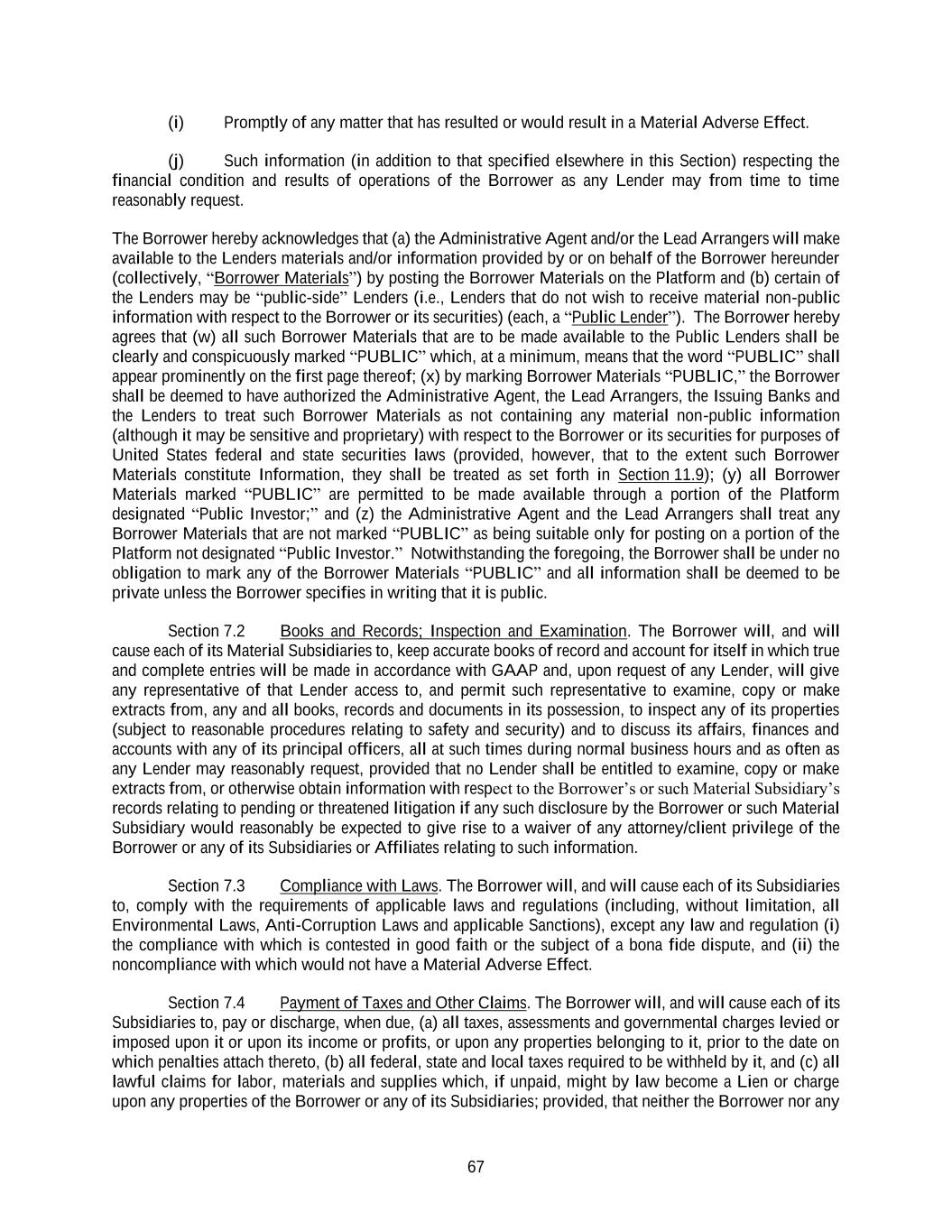 67 (i) Promptly of any matter that has resulted or would result in a Material Adverse Effect. (j) Such information (in addition to that specified elsewhere in this Section) respecting the financial condition and results of operations of the Borrower as any Lender may from time to time reasonably request. The Borrower hereby acknowledges that (a) the Administrative Agent and/or the Lead Arrangers will make available to the Lenders materials and/or information provided by or on behalf of the Borrower hereunder (collectively, “Borrower Materials”) by posting the Borrower Materials on the Platform and (b) certain of the Lenders may be “public-side” Lenders (i.e., Lenders that do not wish to receive material non-public information with respect to the Borrower or its securities) (each, a “Public Lender”). The Borrower hereby agrees that (w) all such Borrower Materials that are to be made available to the Public Lenders shall be clearly and conspicuously marked “PUBLIC” which, at a minimum, means that the word “PUBLIC” shall appear prominently on the first page thereof; (x) by marking Borrower Materials “PUBLIC,” the Borrower shall be deemed to have authorized the Administrative Agent, the Lead Arrangers, the Issuing Banks and the Lenders to treat such Borrower Materials as not containing any material non-public information (although it may be sensitive and proprietary) with respect to the Borrower or its securities for purposes of United States federal and state securities laws (provided, however, that to the extent such Borrower Materials constitute Information, they shall be treated as set forth in Section 11.9); (y) all Borrower Materials marked “PUBLIC” are permitted to be made available through a portion of the Platform designated “Public Investor;” and (z) the Administrative Agent and the Lead Arrangers shall treat any Borrower Materials that are not marked “PUBLIC” as being suitable only for posting on a portion of the Platform not designated “Public Investor.” Notwithstanding the foregoing, the Borrower shall be under no obligation to mark any of the Borrower Materials “PUBLIC” and all information shall be deemed to be private unless the Borrower specifies in writing that it is public. Section 7.2 Books and Records; Inspection and Examination. The Borrower will, and will cause each of its Material Subsidiaries to, keep accurate books of record and account for itself in which true and complete entries will be made in accordance with GAAP and, upon request of any Lender, will give any representative of that Lender access to, and permit such representative to examine, copy or make extracts from, any and all books, records and documents in its possession, to inspect any of its properties (subject to reasonable procedures relating to safety and security) and to discuss its affairs, finances and accounts with any of its principal officers, all at such times during normal business hours and as often as any Lender may reasonably request, provided that no Lender shall be entitled to examine, copy or make extracts from, or otherwise obtain information with respect to the Borrower’s or such Material Subsidiary’s records relating to pending or threatened litigation if any such disclosure by the Borrower or such Material Subsidiary would reasonably be expected to give rise to a waiver of any attorney/client privilege of the Borrower or any of its Subsidiaries or Affiliates relating to such information. Section 7.3 Compliance with Laws. The Borrower will, and will cause each of its Subsidiaries to, comply with the requirements of applicable laws and regulations (including, without limitation, all Environmental Laws, Anti-Corruption Laws and applicable Sanctions), except any law and regulation (i) the compliance with which is contested in good faith or the subject of a bona fide dispute, and (ii) the noncompliance with which would not have a Material Adverse Effect. Section 7.4 Payment of Taxes and Other Claims. The Borrower will, and will cause each of its Subsidiaries to, pay or discharge, when due, (a) all taxes, assessments and governmental charges levied or imposed upon it or upon its income or profits, or upon any properties belonging to it, prior to the date on which penalties attach thereto, (b) all federal, state and local taxes required to be withheld by it, and (c) all lawful claims for labor, materials and supplies which, if unpaid, might by law become a Lien or charge upon any properties of the Borrower or any of its Subsidiaries; provided, that neither the Borrower nor any