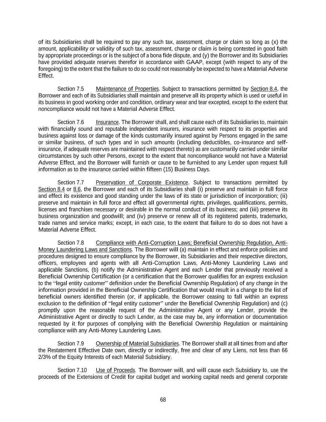 68 of its Subsidiaries shall be required to pay any such tax, assessment, charge or claim so long as (x) the amount, applicability or validity of such tax, assessment, charge or claim is being contested in good faith by appropriate proceedings or is the subject of a bona fide dispute, and (y) the Borrower and its Subsidiaries have provided adequate reserves therefor in accordance with GAAP, except (with respect to any of the foregoing) to the extent that the failure to do so could not reasonably be expected to have a Material Adverse Effect. Section 7.5 Maintenance of Properties. Subject to transactions permitted by Section 8.4, the Borrower and each of its Subsidiaries shall maintain and preserve all its property which is used or useful in its business in good working order and condition, ordinary wear and tear excepted, except to the extent that noncompliance would not have a Material Adverse Effect. Section 7.6 Insurance. The Borrower shall, and shall cause each of its Subsidiaries to, maintain with financially sound and reputable independent insurers, insurance with respect to its properties and business against loss or damage of the kinds customarily insured against by Persons engaged in the same or similar business, of such types and in such amounts (including deductibles, co-insurance and self- insurance, if adequate reserves are maintained with respect thereto) as are customarily carried under similar circumstances by such other Persons, except to the extent that noncompliance would not have a Material Adverse Effect, and the Borrower will furnish or cause to be furnished to any Lender upon request full information as to the insurance carried within fifteen (15) Business Days. Section 7.7 Preservation of Corporate Existence. Subject to transactions permitted by Section 8.4 or 8.6, the Borrower and each of its Subsidiaries shall (i) preserve and maintain in full force and effect its existence and good standing under the laws of its state or jurisdiction of incorporation; (ii) preserve and maintain in full force and effect all governmental rights, privileges, qualifications, permits, licenses and franchises necessary or desirable in the normal conduct of its business; and (iii) preserve its business organization and goodwill; and (iv) preserve or renew all of its registered patents, trademarks, trade names and service marks; except, in each case, to the extent that failure to do so does not have a Material Adverse Effect. Section 7.8 Compliance with Anti-Corruption Laws; Beneficial Ownership Regulation, Anti- Money Laundering Laws and Sanctions. The Borrower will (a) maintain in effect and enforce policies and procedures designed to ensure compliance by the Borrower, its Subsidiaries and their respective directors, officers, employees and agents with all Anti-Corruption Laws, Anti-Money Laundering Laws and applicable Sanctions, (b) notify the Administrative Agent and each Lender that previously received a Beneficial Ownership Certification (or a certification that the Borrower qualifies for an express exclusion to the “legal entity customer” definition under the Beneficial Ownership Regulation) of any change in the information provided in the Beneficial Ownership Certification that would result in a change to the list of beneficial owners identified therein (or, if applicable, the Borrower ceasing to fall within an express exclusion to the definition of “legal entity customer” under the Beneficial Ownership Regulation) and (c) promptly upon the reasonable request of the Administrative Agent or any Lender, provide the Administrative Agent or directly to such Lender, as the case may be, any information or documentation requested by it for purposes of complying with the Beneficial Ownership Regulation or maintaining compliance with any Anti-Money Laundering Laws. Section 7.9 Ownership of Material Subsidiaries. The Borrower shall at all times from and after the Restatement Effective Date own, directly or indirectly, free and clear of any Liens, not less than 66 2/3% of the Equity Interests of each Material Subsidiary. Section 7.10 Use of Proceeds. The Borrower will, and will cause each Subsidiary to, use the proceeds of the Extensions of Credit for capital budget and working capital needs and general corporate