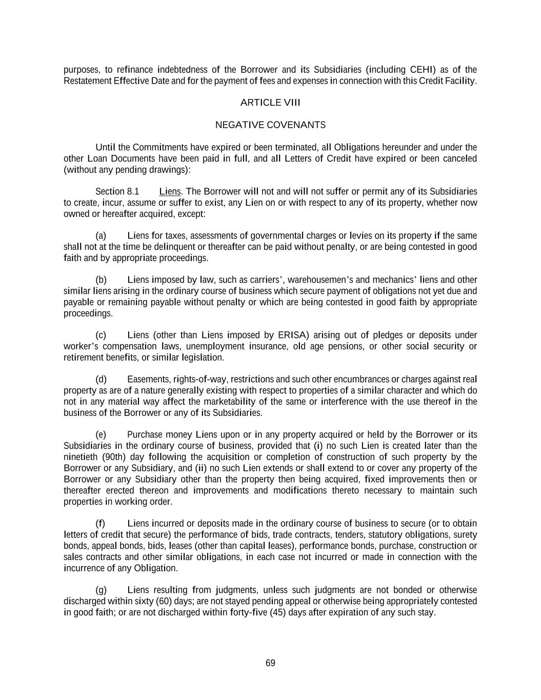 69 purposes, to refinance indebtedness of the Borrower and its Subsidiaries (including CEHI) as of the Restatement Effective Date and for the payment of fees and expenses in connection with this Credit Facility. ARTICLE VIII NEGATIVE COVENANTS Until the Commitments have expired or been terminated, all Obligations hereunder and under the other Loan Documents have been paid in full, and all Letters of Credit have expired or been canceled (without any pending drawings): Section 8.1 Liens. The Borrower will not and will not suffer or permit any of its Subsidiaries to create, incur, assume or suffer to exist, any Lien on or with respect to any of its property, whether now owned or hereafter acquired, except: (a) Liens for taxes, assessments of governmental charges or levies on its property if the same shall not at the time be delinquent or thereafter can be paid without penalty, or are being contested in good faith and by appropriate proceedings. (b) Liens imposed by law, such as carriers’, warehousemen’s and mechanics’ liens and other similar liens arising in the ordinary course of business which secure payment of obligations not yet due and payable or remaining payable without penalty or which are being contested in good faith by appropriate proceedings. (c) Liens (other than Liens imposed by ERISA) arising out of pledges or deposits under worker’s compensation laws, unemployment insurance, old age pensions, or other social security or retirement benefits, or similar legislation. (d) Easements, rights-of-way, restrictions and such other encumbrances or charges against real property as are of a nature generally existing with respect to properties of a similar character and which do not in any material way affect the marketability of the same or interference with the use thereof in the business of the Borrower or any of its Subsidiaries. (e) Purchase money Liens upon or in any property acquired or held by the Borrower or its Subsidiaries in the ordinary course of business, provided that (i) no such Lien is created later than the ninetieth (90th) day following the acquisition or completion of construction of such property by the Borrower or any Subsidiary, and (ii) no such Lien extends or shall extend to or cover any property of the Borrower or any Subsidiary other than the property then being acquired, fixed improvements then or thereafter erected thereon and improvements and modifications thereto necessary to maintain such properties in working order. (f) Liens incurred or deposits made in the ordinary course of business to secure (or to obtain letters of credit that secure) the performance of bids, trade contracts, tenders, statutory obligations, surety bonds, appeal bonds, bids, leases (other than capital leases), performance bonds, purchase, construction or sales contracts and other similar obligations, in each case not incurred or made in connection with the incurrence of any Obligation. (g) Liens resulting from judgments, unless such judgments are not bonded or otherwise discharged within sixty (60) days; are not stayed pending appeal or otherwise being appropriately contested in good faith; or are not discharged within forty-five (45) days after expiration of any such stay.