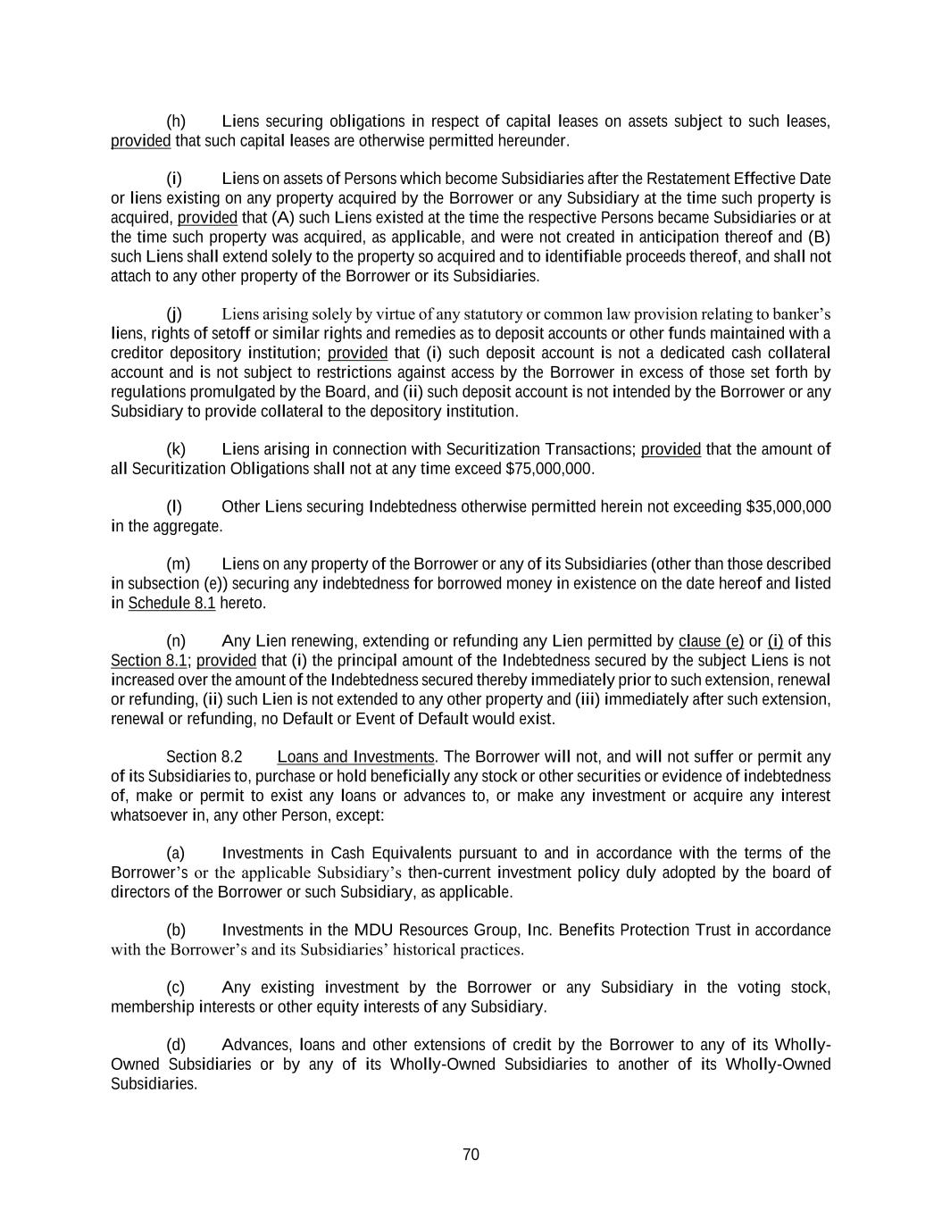 70 (h) Liens securing obligations in respect of capital leases on assets subject to such leases, provided that such capital leases are otherwise permitted hereunder. (i) Liens on assets of Persons which become Subsidiaries after the Restatement Effective Date or liens existing on any property acquired by the Borrower or any Subsidiary at the time such property is acquired, provided that (A) such Liens existed at the time the respective Persons became Subsidiaries or at the time such property was acquired, as applicable, and were not created in anticipation thereof and (B) such Liens shall extend solely to the property so acquired and to identifiable proceeds thereof, and shall not attach to any other property of the Borrower or its Subsidiaries. (j) Liens arising solely by virtue of any statutory or common law provision relating to banker’s liens, rights of setoff or similar rights and remedies as to deposit accounts or other funds maintained with a creditor depository institution; provided that (i) such deposit account is not a dedicated cash collateral account and is not subject to restrictions against access by the Borrower in excess of those set forth by regulations promulgated by the Board, and (ii) such deposit account is not intended by the Borrower or any Subsidiary to provide collateral to the depository institution. (k) Liens arising in connection with Securitization Transactions; provided that the amount of all Securitization Obligations shall not at any time exceed $75,000,000. (l) Other Liens securing Indebtedness otherwise permitted herein not exceeding $35,000,000 in the aggregate. (m) Liens on any property of the Borrower or any of its Subsidiaries (other than those described in subsection (e)) securing any indebtedness for borrowed money in existence on the date hereof and listed in Schedule 8.1 hereto. (n) Any Lien renewing, extending or refunding any Lien permitted by clause (e) or (i) of this Section 8.1; provided that (i) the principal amount of the Indebtedness secured by the subject Liens is not increased over the amount of the Indebtedness secured thereby immediately prior to such extension, renewal or refunding, (ii) such Lien is not extended to any other property and (iii) immediately after such extension, renewal or refunding, no Default or Event of Default would exist. Section 8.2 Loans and Investments. The Borrower will not, and will not suffer or permit any of its Subsidiaries to, purchase or hold beneficially any stock or other securities or evidence of indebtedness of, make or permit to exist any loans or advances to, or make any investment or acquire any interest whatsoever in, any other Person, except: (a) Investments in Cash Equivalents pursuant to and in accordance with the terms of the Borrower’s or the applicable Subsidiary’s then-current investment policy duly adopted by the board of directors of the Borrower or such Subsidiary, as applicable. (b) Investments in the MDU Resources Group, Inc. Benefits Protection Trust in accordance with the Borrower’s and its Subsidiaries’ historical practices. (c) Any existing investment by the Borrower or any Subsidiary in the voting stock, membership interests or other equity interests of any Subsidiary. (d) Advances, loans and other extensions of credit by the Borrower to any of its Wholly- Owned Subsidiaries or by any of its Wholly-Owned Subsidiaries to another of its Wholly-Owned Subsidiaries.