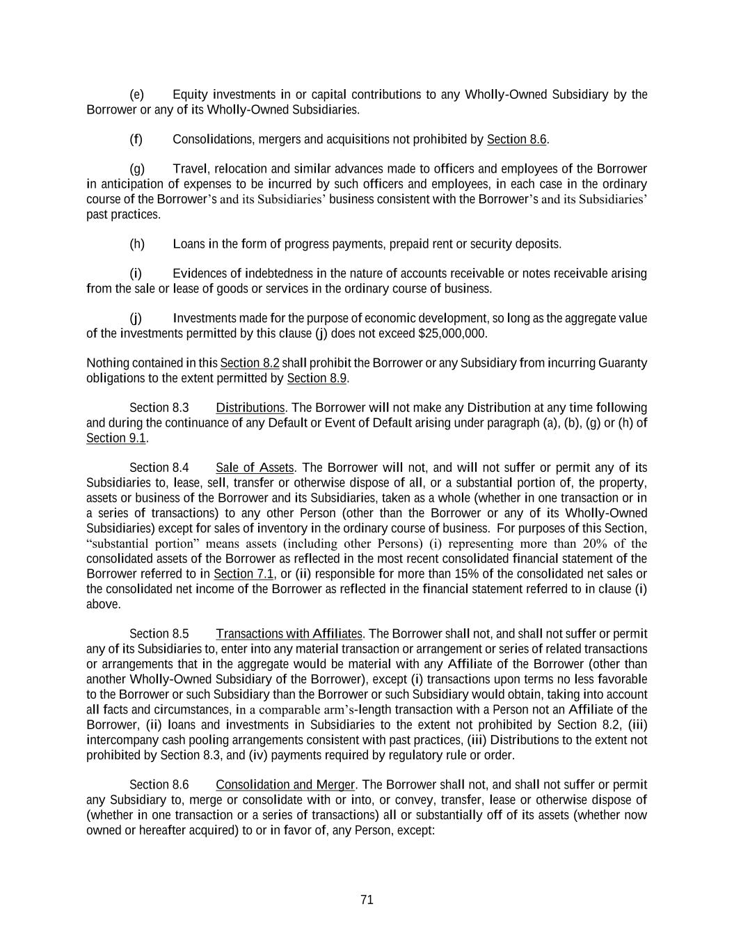 71 (e) Equity investments in or capital contributions to any Wholly-Owned Subsidiary by the Borrower or any of its Wholly-Owned Subsidiaries. (f) Consolidations, mergers and acquisitions not prohibited by Section 8.6. (g) Travel, relocation and similar advances made to officers and employees of the Borrower in anticipation of expenses to be incurred by such officers and employees, in each case in the ordinary course of the Borrower’s and its Subsidiaries’ business consistent with the Borrower’s and its Subsidiaries’ past practices. (h) Loans in the form of progress payments, prepaid rent or security deposits. (i) Evidences of indebtedness in the nature of accounts receivable or notes receivable arising from the sale or lease of goods or services in the ordinary course of business. (j) Investments made for the purpose of economic development, so long as the aggregate value of the investments permitted by this clause (j) does not exceed $25,000,000. Nothing contained in this Section 8.2 shall prohibit the Borrower or any Subsidiary from incurring Guaranty obligations to the extent permitted by Section 8.9. Section 8.3 Distributions. The Borrower will not make any Distribution at any time following and during the continuance of any Default or Event of Default arising under paragraph (a), (b), (g) or (h) of Section 9.1. Section 8.4 Sale of Assets. The Borrower will not, and will not suffer or permit any of its Subsidiaries to, lease, sell, transfer or otherwise dispose of all, or a substantial portion of, the property, assets or business of the Borrower and its Subsidiaries, taken as a whole (whether in one transaction or in a series of transactions) to any other Person (other than the Borrower or any of its Wholly-Owned Subsidiaries) except for sales of inventory in the ordinary course of business. For purposes of this Section, “substantial portion” means assets (including other Persons) (i) representing more than 20% of the consolidated assets of the Borrower as reflected in the most recent consolidated financial statement of the Borrower referred to in Section 7.1, or (ii) responsible for more than 15% of the consolidated net sales or the consolidated net income of the Borrower as reflected in the financial statement referred to in clause (i) above. Section 8.5 Transactions with Affiliates. The Borrower shall not, and shall not suffer or permit any of its Subsidiaries to, enter into any material transaction or arrangement or series of related transactions or arrangements that in the aggregate would be material with any Affiliate of the Borrower (other than another Wholly-Owned Subsidiary of the Borrower), except (i) transactions upon terms no less favorable to the Borrower or such Subsidiary than the Borrower or such Subsidiary would obtain, taking into account all facts and circumstances, in a comparable arm’s-length transaction with a Person not an Affiliate of the Borrower, (ii) loans and investments in Subsidiaries to the extent not prohibited by Section 8.2, (iii) intercompany cash pooling arrangements consistent with past practices, (iii) Distributions to the extent not prohibited by Section 8.3, and (iv) payments required by regulatory rule or order. Section 8.6 Consolidation and Merger. The Borrower shall not, and shall not suffer or permit any Subsidiary to, merge or consolidate with or into, or convey, transfer, lease or otherwise dispose of (whether in one transaction or a series of transactions) all or substantially off of its assets (whether now owned or hereafter acquired) to or in favor of, any Person, except: