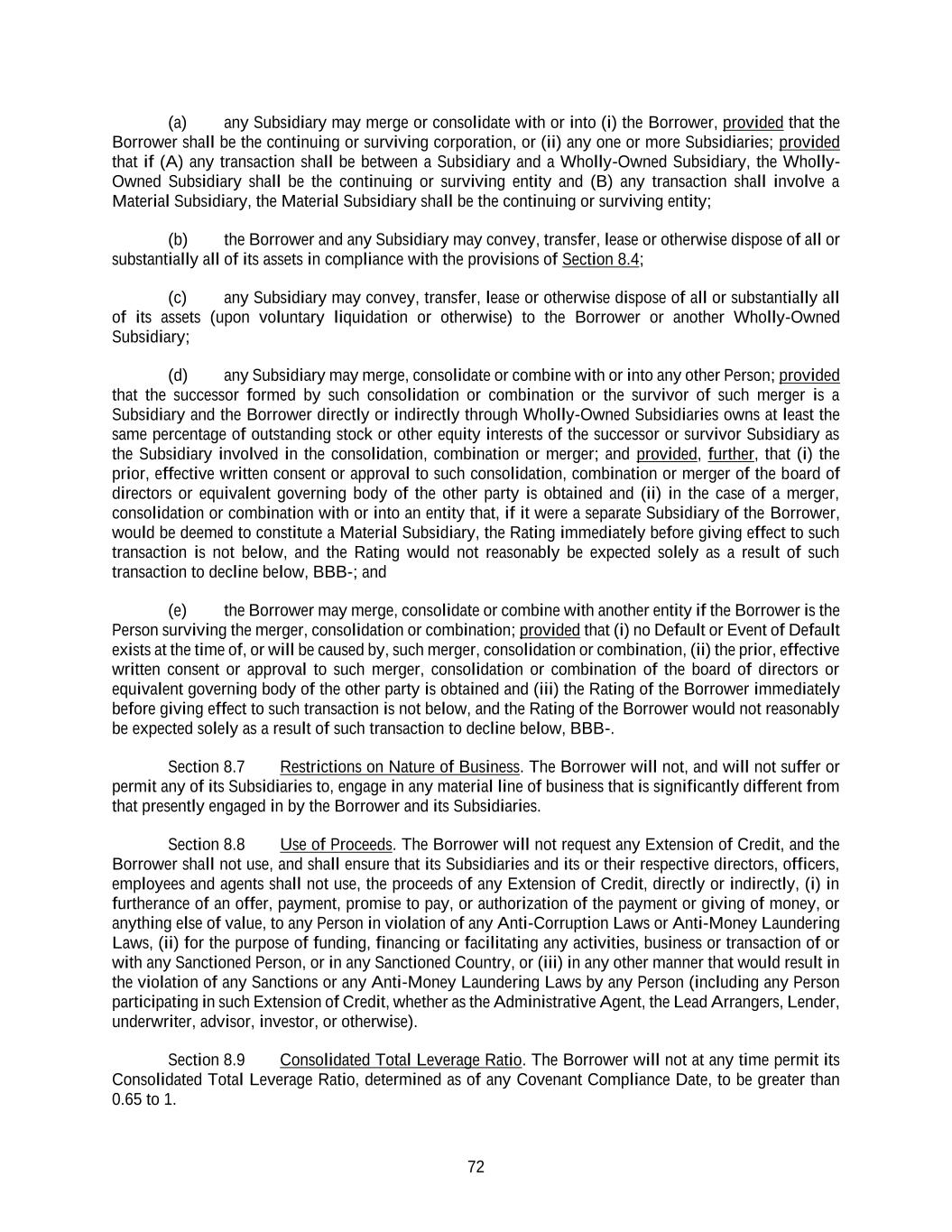 72 (a) any Subsidiary may merge or consolidate with or into (i) the Borrower, provided that the Borrower shall be the continuing or surviving corporation, or (ii) any one or more Subsidiaries; provided that if (A) any transaction shall be between a Subsidiary and a Wholly-Owned Subsidiary, the Wholly- Owned Subsidiary shall be the continuing or surviving entity and (B) any transaction shall involve a Material Subsidiary, the Material Subsidiary shall be the continuing or surviving entity; (b) the Borrower and any Subsidiary may convey, transfer, lease or otherwise dispose of all or substantially all of its assets in compliance with the provisions of Section 8.4; (c) any Subsidiary may convey, transfer, lease or otherwise dispose of all or substantially all of its assets (upon voluntary liquidation or otherwise) to the Borrower or another Wholly-Owned Subsidiary; (d) any Subsidiary may merge, consolidate or combine with or into any other Person; provided that the successor formed by such consolidation or combination or the survivor of such merger is a Subsidiary and the Borrower directly or indirectly through Wholly-Owned Subsidiaries owns at least the same percentage of outstanding stock or other equity interests of the successor or survivor Subsidiary as the Subsidiary involved in the consolidation, combination or merger; and provided, further, that (i) the prior, effective written consent or approval to such consolidation, combination or merger of the board of directors or equivalent governing body of the other party is obtained and (ii) in the case of a merger, consolidation or combination with or into an entity that, if it were a separate Subsidiary of the Borrower, would be deemed to constitute a Material Subsidiary, the Rating immediately before giving effect to such transaction is not below, and the Rating would not reasonably be expected solely as a result of such transaction to decline below, BBB-; and (e) the Borrower may merge, consolidate or combine with another entity if the Borrower is the Person surviving the merger, consolidation or combination; provided that (i) no Default or Event of Default exists at the time of, or will be caused by, such merger, consolidation or combination, (ii) the prior, effective written consent or approval to such merger, consolidation or combination of the board of directors or equivalent governing body of the other party is obtained and (iii) the Rating of the Borrower immediately before giving effect to such transaction is not below, and the Rating of the Borrower would not reasonably be expected solely as a result of such transaction to decline below, BBB-. Section 8.7 Restrictions on Nature of Business. The Borrower will not, and will not suffer or permit any of its Subsidiaries to, engage in any material line of business that is significantly different from that presently engaged in by the Borrower and its Subsidiaries. Section 8.8 Use of Proceeds. The Borrower will not request any Extension of Credit, and the Borrower shall not use, and shall ensure that its Subsidiaries and its or their respective directors, officers, employees and agents shall not use, the proceeds of any Extension of Credit, directly or indirectly, (i) in furtherance of an offer, payment, promise to pay, or authorization of the payment or giving of money, or anything else of value, to any Person in violation of any Anti-Corruption Laws or Anti-Money Laundering Laws, (ii) for the purpose of funding, financing or facilitating any activities, business or transaction of or with any Sanctioned Person, or in any Sanctioned Country, or (iii) in any other manner that would result in the violation of any Sanctions or any Anti-Money Laundering Laws by any Person (including any Person participating in such Extension of Credit, whether as the Administrative Agent, the Lead Arrangers, Lender, underwriter, advisor, investor, or otherwise). Section 8.9 Consolidated Total Leverage Ratio. The Borrower will not at any time permit its Consolidated Total Leverage Ratio, determined as of any Covenant Compliance Date, to be greater than 0.65 to 1.