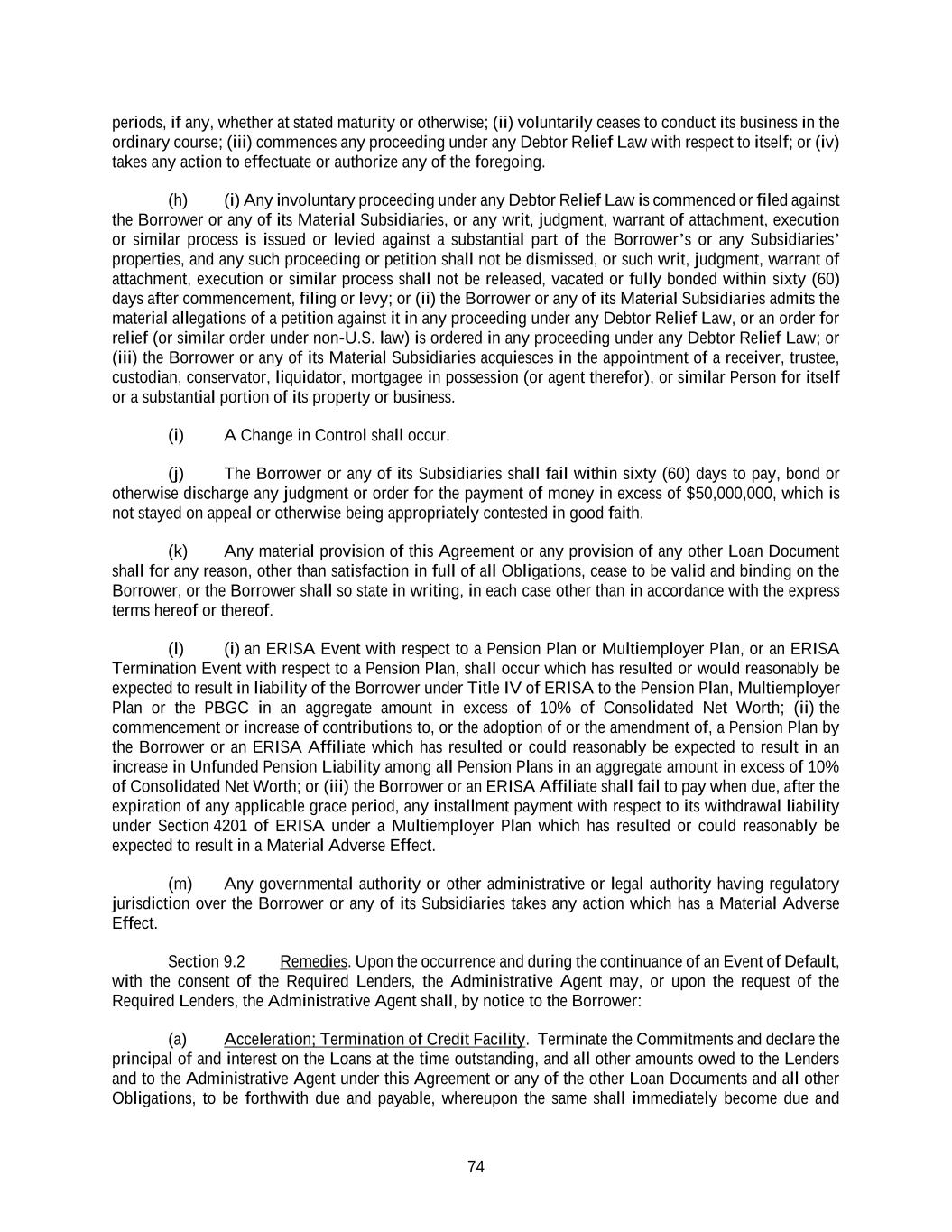 74 periods, if any, whether at stated maturity or otherwise; (ii) voluntarily ceases to conduct its business in the ordinary course; (iii) commences any proceeding under any Debtor Relief Law with respect to itself; or (iv) takes any action to effectuate or authorize any of the foregoing. (h) (i) Any involuntary proceeding under any Debtor Relief Law is commenced or filed against the Borrower or any of its Material Subsidiaries, or any writ, judgment, warrant of attachment, execution or similar process is issued or levied against a substantial part of the Borrower’s or any Subsidiaries’ properties, and any such proceeding or petition shall not be dismissed, or such writ, judgment, warrant of attachment, execution or similar process shall not be released, vacated or fully bonded within sixty (60) days after commencement, filing or levy; or (ii) the Borrower or any of its Material Subsidiaries admits the material allegations of a petition against it in any proceeding under any Debtor Relief Law, or an order for relief (or similar order under non-U.S. law) is ordered in any proceeding under any Debtor Relief Law; or (iii) the Borrower or any of its Material Subsidiaries acquiesces in the appointment of a receiver, trustee, custodian, conservator, liquidator, mortgagee in possession (or agent therefor), or similar Person for itself or a substantial portion of its property or business. (i) A Change in Control shall occur. (j) The Borrower or any of its Subsidiaries shall fail within sixty (60) days to pay, bond or otherwise discharge any judgment or order for the payment of money in excess of $50,000,000, which is not stayed on appeal or otherwise being appropriately contested in good faith. (k) Any material provision of this Agreement or any provision of any other Loan Document shall for any reason, other than satisfaction in full of all Obligations, cease to be valid and binding on the Borrower, or the Borrower shall so state in writing, in each case other than in accordance with the express terms hereof or thereof. (l) (i) an ERISA Event with respect to a Pension Plan or Multiemployer Plan, or an ERISA Termination Event with respect to a Pension Plan, shall occur which has resulted or would reasonably be expected to result in liability of the Borrower under Title IV of ERISA to the Pension Plan, Multiemployer Plan or the PBGC in an aggregate amount in excess of 10% of Consolidated Net Worth; (ii) the commencement or increase of contributions to, or the adoption of or the amendment of, a Pension Plan by the Borrower or an ERISA Affiliate which has resulted or could reasonably be expected to result in an increase in Unfunded Pension Liability among all Pension Plans in an aggregate amount in excess of 10% of Consolidated Net Worth; or (iii) the Borrower or an ERISA Affiliate shall fail to pay when due, after the expiration of any applicable grace period, any installment payment with respect to its withdrawal liability under Section 4201 of ERISA under a Multiemployer Plan which has resulted or could reasonably be expected to result in a Material Adverse Effect. (m) Any governmental authority or other administrative or legal authority having regulatory jurisdiction over the Borrower or any of its Subsidiaries takes any action which has a Material Adverse Effect. Section 9.2 Remedies. Upon the occurrence and during the continuance of an Event of Default, with the consent of the Required Lenders, the Administrative Agent may, or upon the request of the Required Lenders, the Administrative Agent shall, by notice to the Borrower: (a) Acceleration; Termination of Credit Facility. Terminate the Commitments and declare the principal of and interest on the Loans at the time outstanding, and all other amounts owed to the Lenders and to the Administrative Agent under this Agreement or any of the other Loan Documents and all other Obligations, to be forthwith due and payable, whereupon the same shall immediately become due and