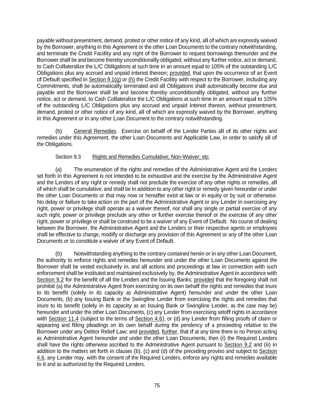 75 payable without presentment, demand, protest or other notice of any kind, all of which are expressly waived by the Borrower, anything in this Agreement or the other Loan Documents to the contrary notwithstanding, and terminate the Credit Facility and any right of the Borrower to request borrowings thereunder and the Borrower shall be and become thereby unconditionally obligated, without any further notice, act or demand, to Cash Collateralize the L/C Obligations at such time in an amount equal to 105% of the outstanding L/C Obligations plus any accrued and unpaid interest thereon; provided, that upon the occurrence of an Event of Default specified in Section 9.1(g) or (h) the Credit Facility with respect to the Borrower, including any Commitments, shall be automatically terminated and all Obligations shall automatically become due and payable and the Borrower shall be and become thereby unconditionally obligated, without any further notice, act or demand, to Cash Collateralize the L/C Obligations at such time in an amount equal to 105% of the outstanding L/C Obligations plus any accrued and unpaid interest thereon, without presentment, demand, protest or other notice of any kind, all of which are expressly waived by the Borrower, anything in this Agreement or in any other Loan Document to the contrary notwithstanding. (b) General Remedies. Exercise on behalf of the Lender Parties all of its other rights and remedies under this Agreement, the other Loan Documents and Applicable Law, in order to satisfy all of the Obligations. Section 9.3 Rights and Remedies Cumulative; Non-Waiver; etc. (a) The enumeration of the rights and remedies of the Administrative Agent and the Lenders set forth in this Agreement is not intended to be exhaustive and the exercise by the Administrative Agent and the Lenders of any right or remedy shall not preclude the exercise of any other rights or remedies, all of which shall be cumulative, and shall be in addition to any other right or remedy given hereunder or under the other Loan Documents or that may now or hereafter exist at law or in equity or by suit or otherwise. No delay or failure to take action on the part of the Administrative Agent or any Lender in exercising any right, power or privilege shall operate as a waiver thereof, nor shall any single or partial exercise of any such right, power or privilege preclude any other or further exercise thereof or the exercise of any other right, power or privilege or shall be construed to be a waiver of any Event of Default. No course of dealing between the Borrower, the Administrative Agent and the Lenders or their respective agents or employees shall be effective to change, modify or discharge any provision of this Agreement or any of the other Loan Documents or to constitute a waiver of any Event of Default. (b) Notwithstanding anything to the contrary contained herein or in any other Loan Document, the authority to enforce rights and remedies hereunder and under the other Loan Documents against the Borrower shall be vested exclusively in, and all actions and proceedings at law in connection with such enforcement shall be instituted and maintained exclusively by, the Administrative Agent in accordance with Section 9.2 for the benefit of all the Lenders and the Issuing Banks; provided that the foregoing shall not prohibit (a) the Administrative Agent from exercising on its own behalf the rights and remedies that inure to its benefit (solely in its capacity as Administrative Agent) hereunder and under the other Loan Documents, (b) any Issuing Bank or the Swingline Lender from exercising the rights and remedies that inure to its benefit (solely in its capacity as an Issuing Bank or Swingline Lender, as the case may be) hereunder and under the other Loan Documents, (c) any Lender from exercising setoff rights in accordance with Section 11.4 (subject to the terms of Section 4.6), or (d) any Lender from filing proofs of claim or appearing and filing pleadings on its own behalf during the pendency of a proceeding relative to the Borrower under any Debtor Relief Law; and provided, further, that if at any time there is no Person acting as Administrative Agent hereunder and under the other Loan Documents, then (i) the Required Lenders shall have the rights otherwise ascribed to the Administrative Agent pursuant to Section 9.2 and (ii) in addition to the matters set forth in clauses (b), (c) and (d) of the preceding proviso and subject to Section 4.6, any Lender may, with the consent of the Required Lenders, enforce any rights and remedies available to it and as authorized by the Required Lenders.
